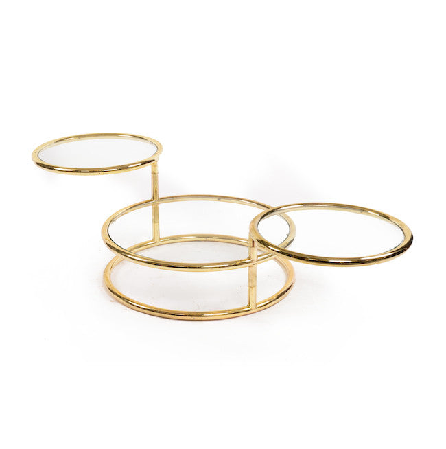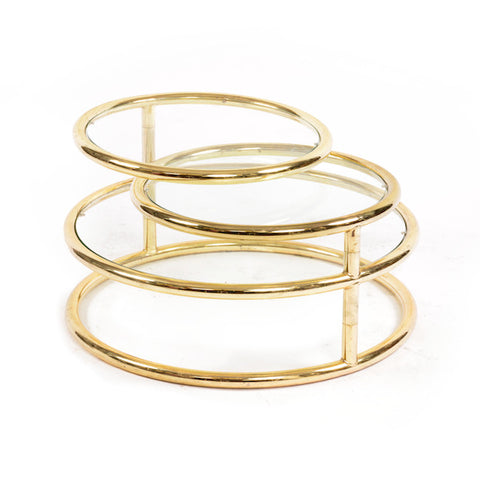 Details: Three-level coffee table with two adjustable brass rings that rotate outward, with gold metal frame and glass tops Dimensions: 16.5" H x 30" W...