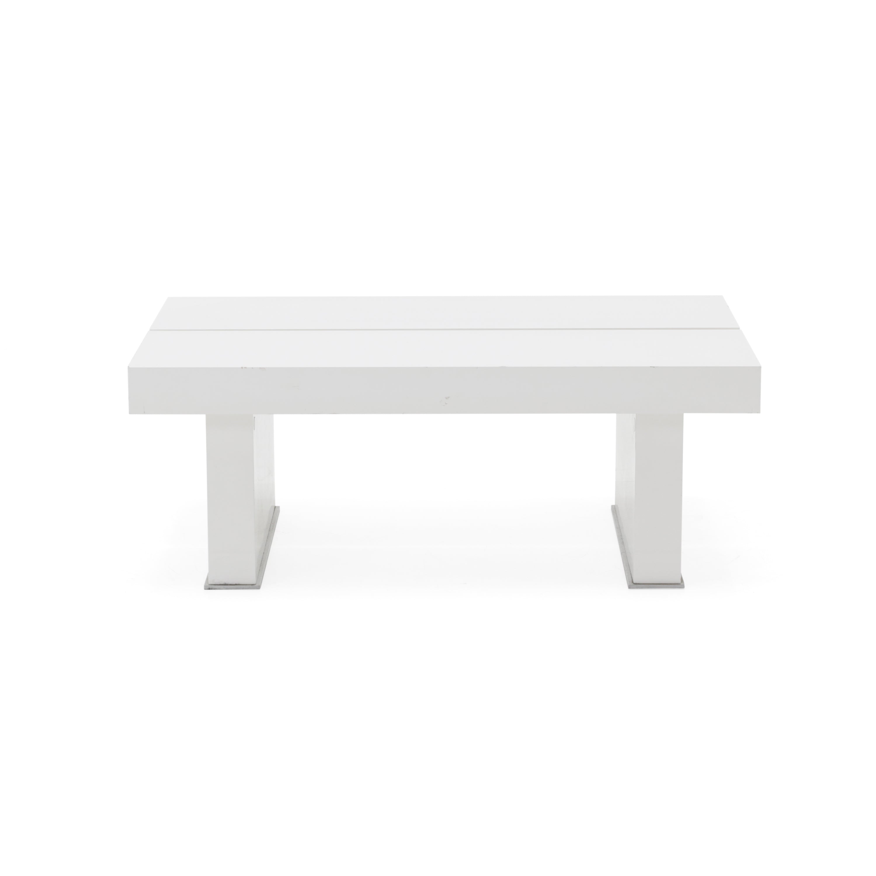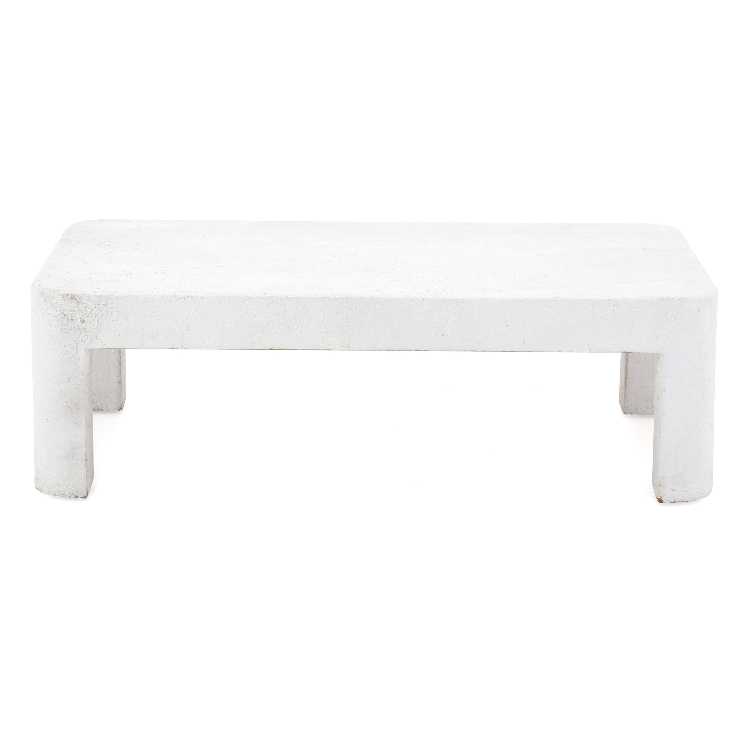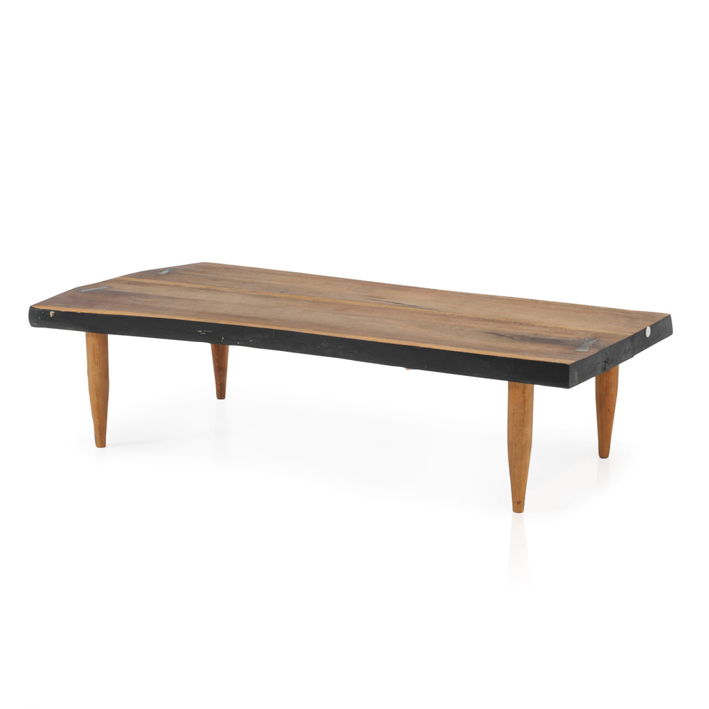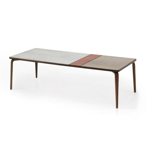 Details: Fiberglass coffee table with laminated shades of gray, dark gray and natural dark wood top with slightly curved wood legs Dimensions: 14" H x 47" W...
