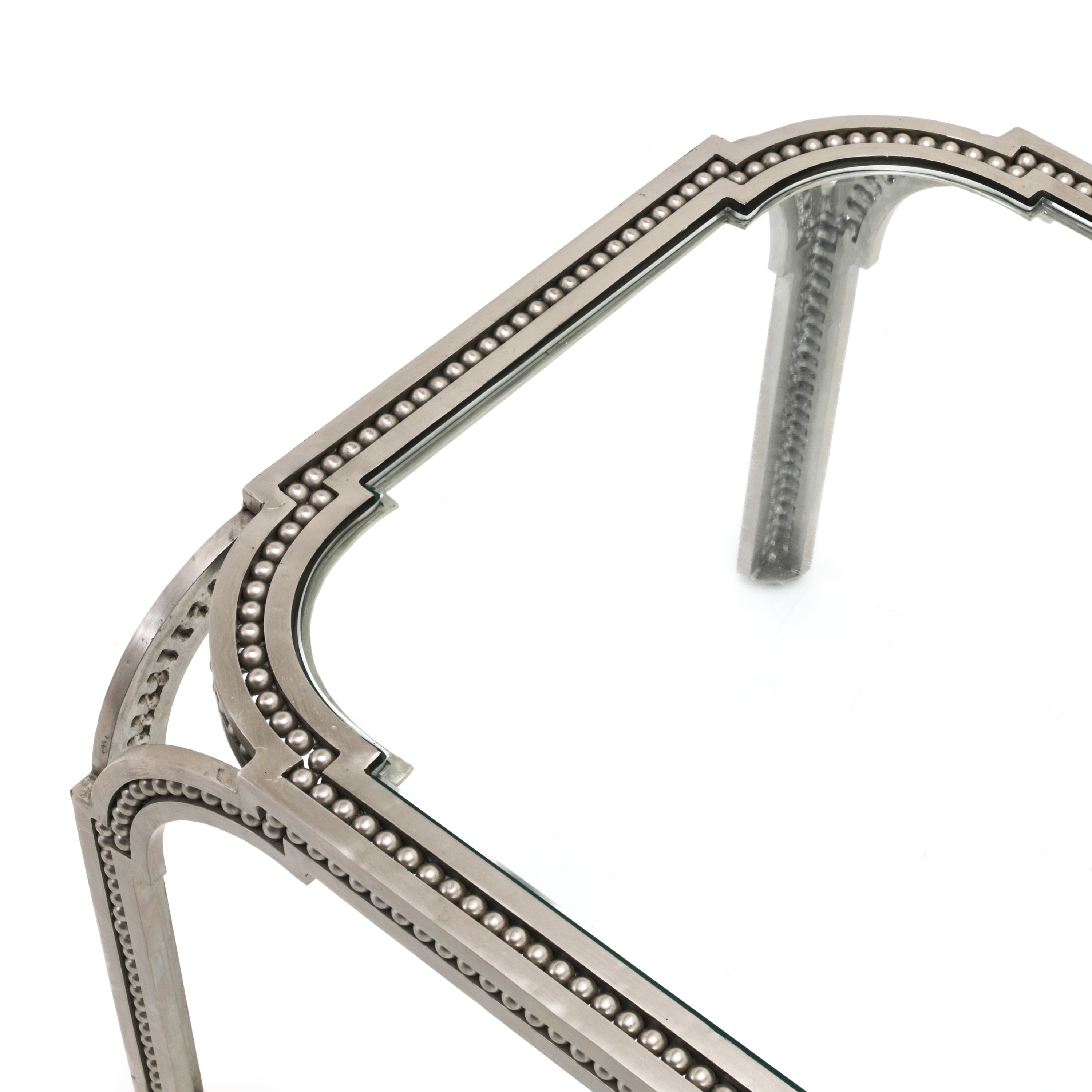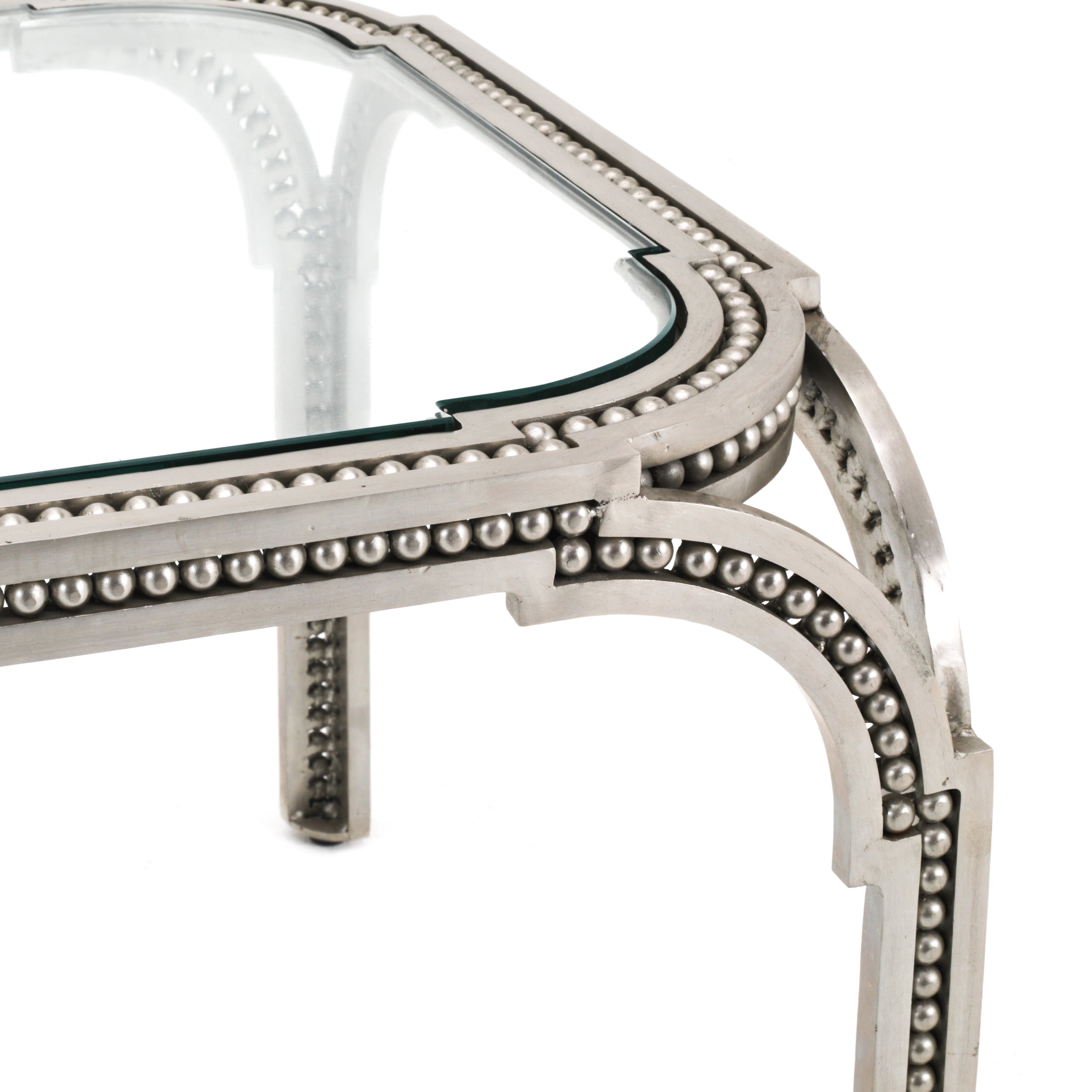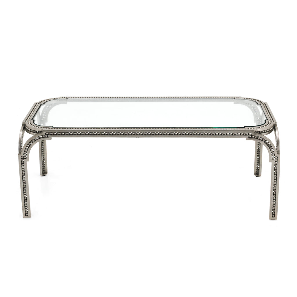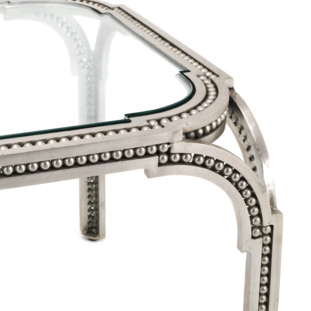 Details: Forged pearl cocktail / coffee table with curved edges and glass top. (Matching side table rented separately) Please note that the table is heavy...
