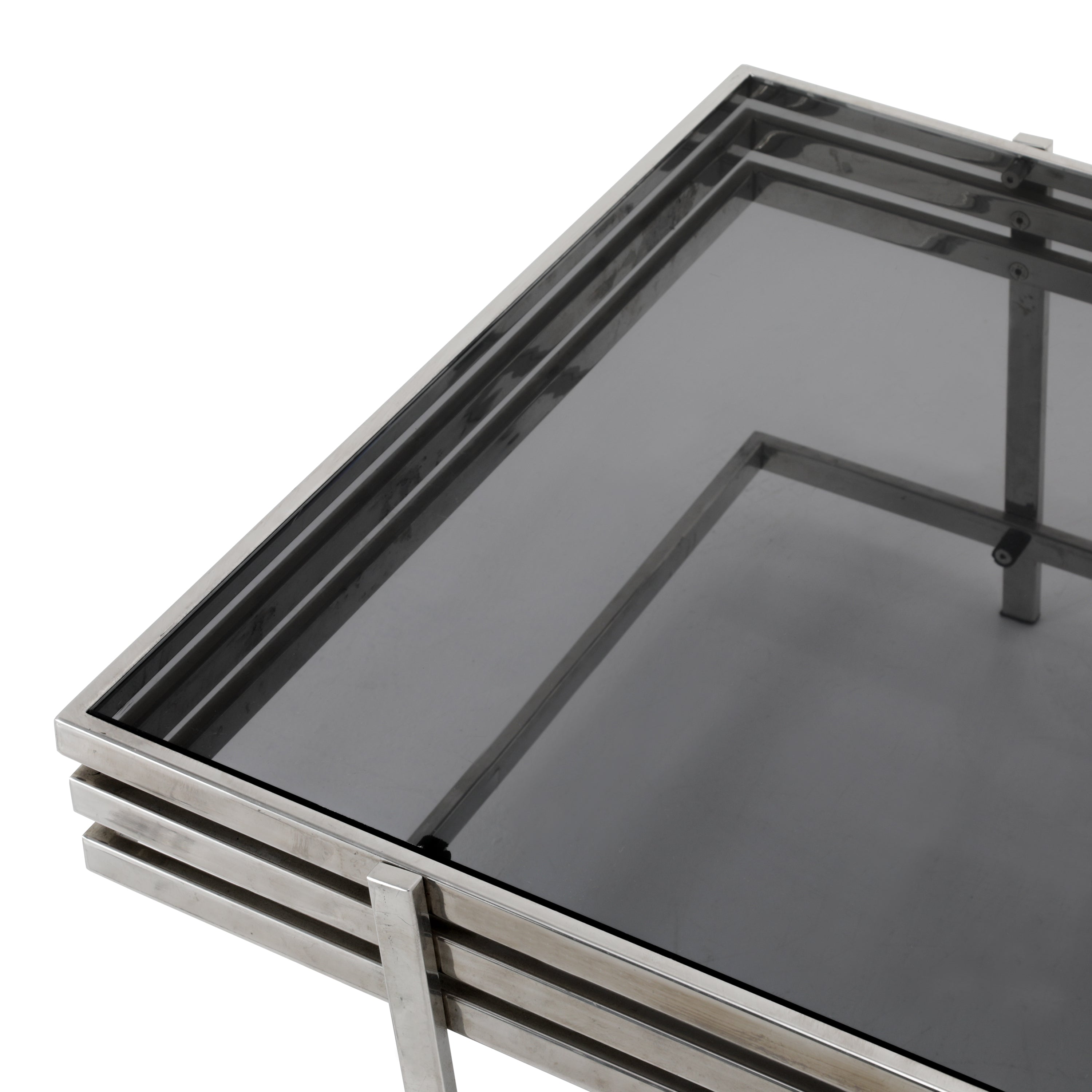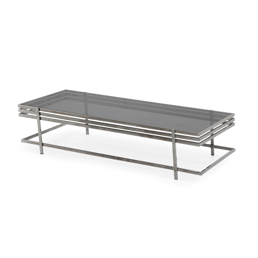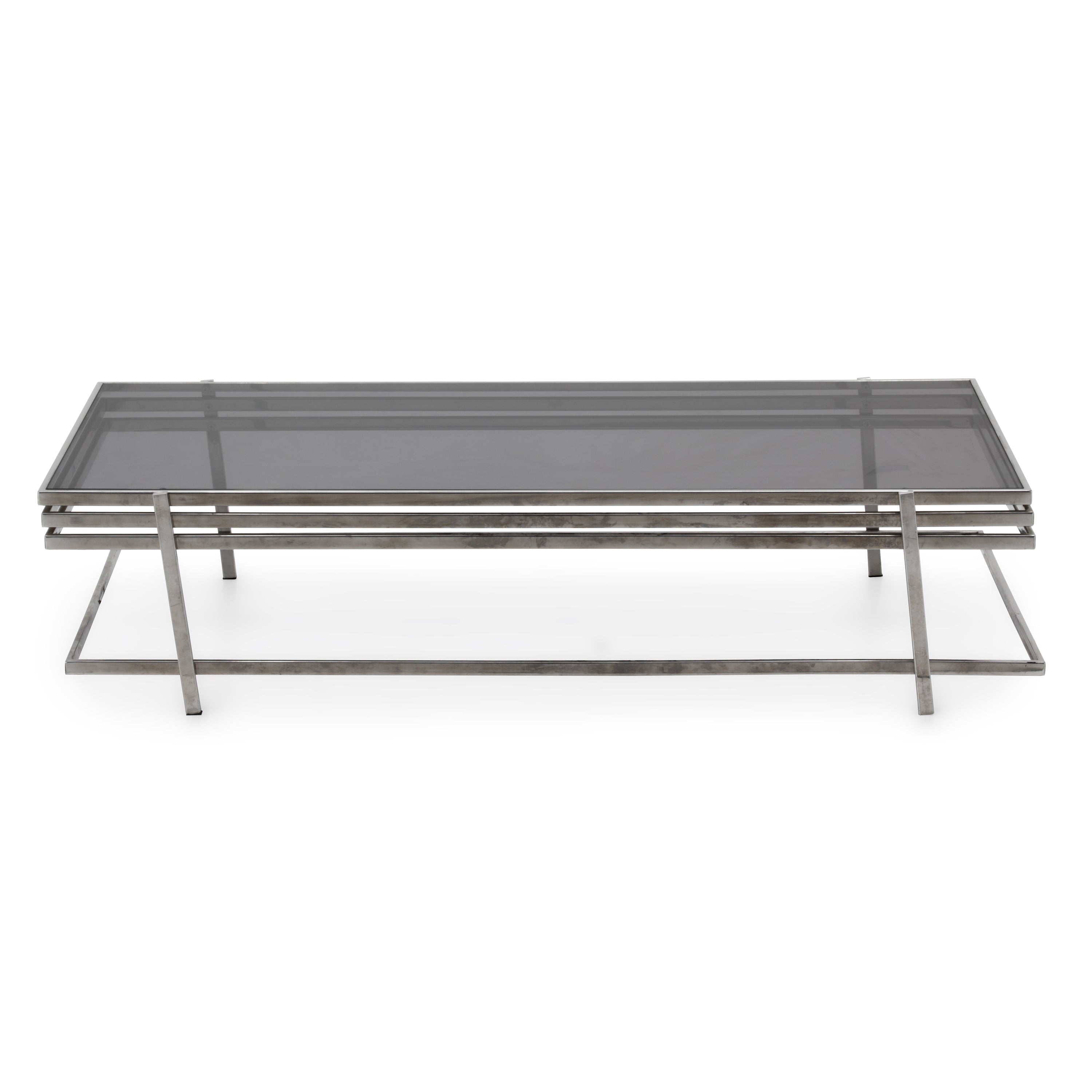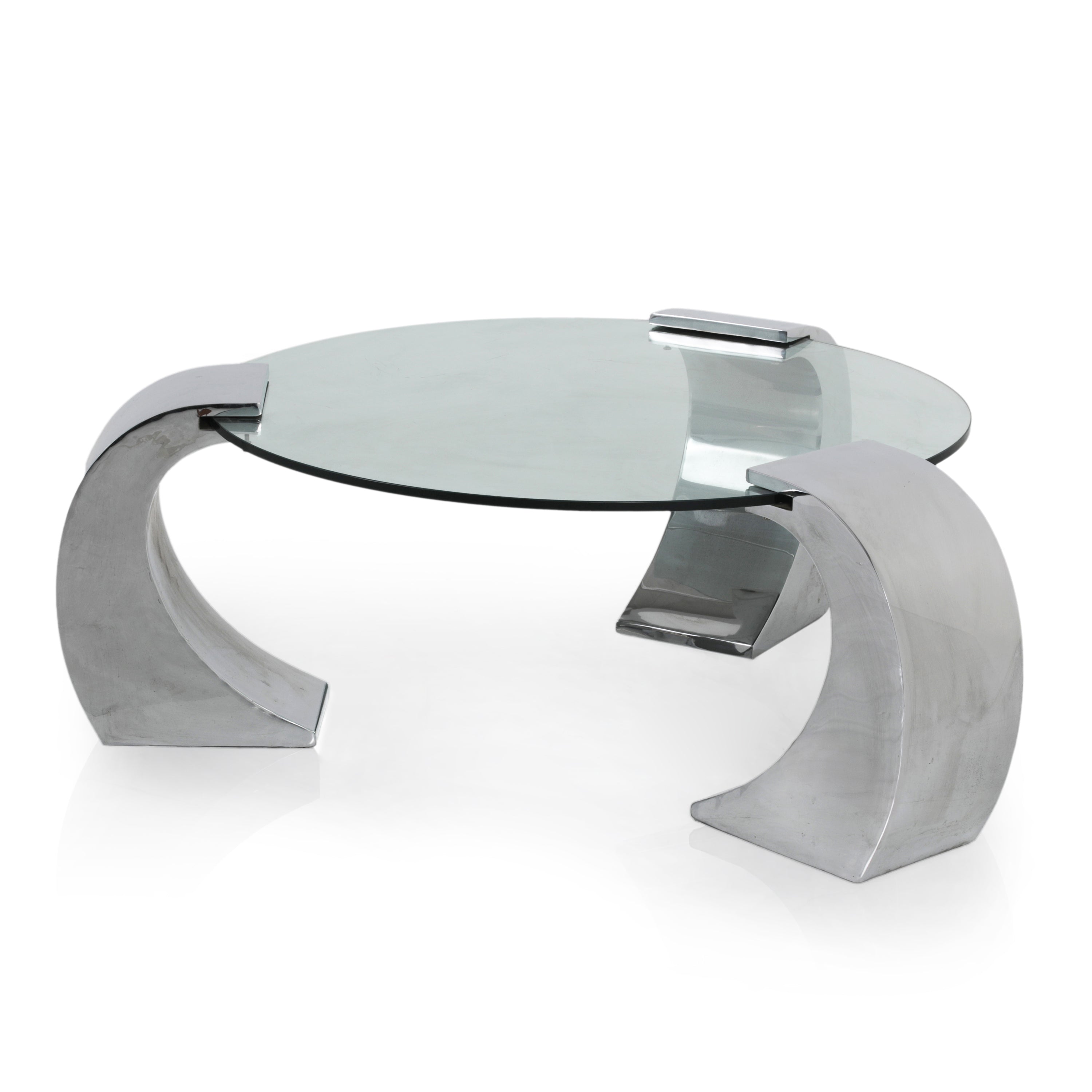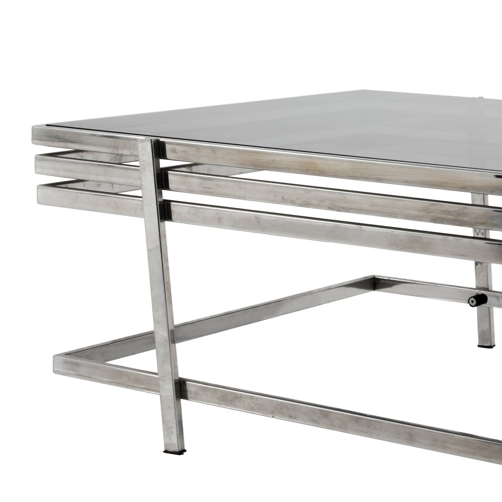 Details: Rustic metal frame with lightly tinted glass top and mirrored smoked glass bottom. Matching circular end tables available. Dimnensions: 19" H x 30" W...