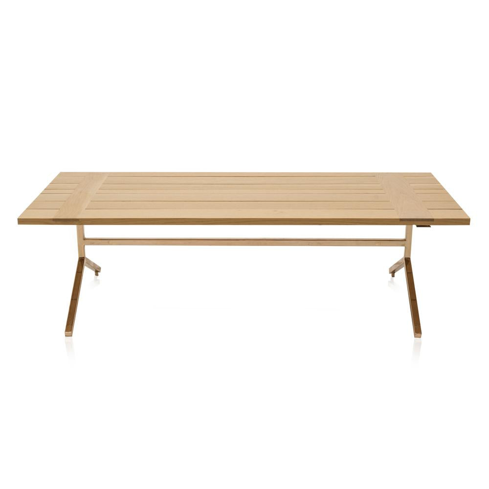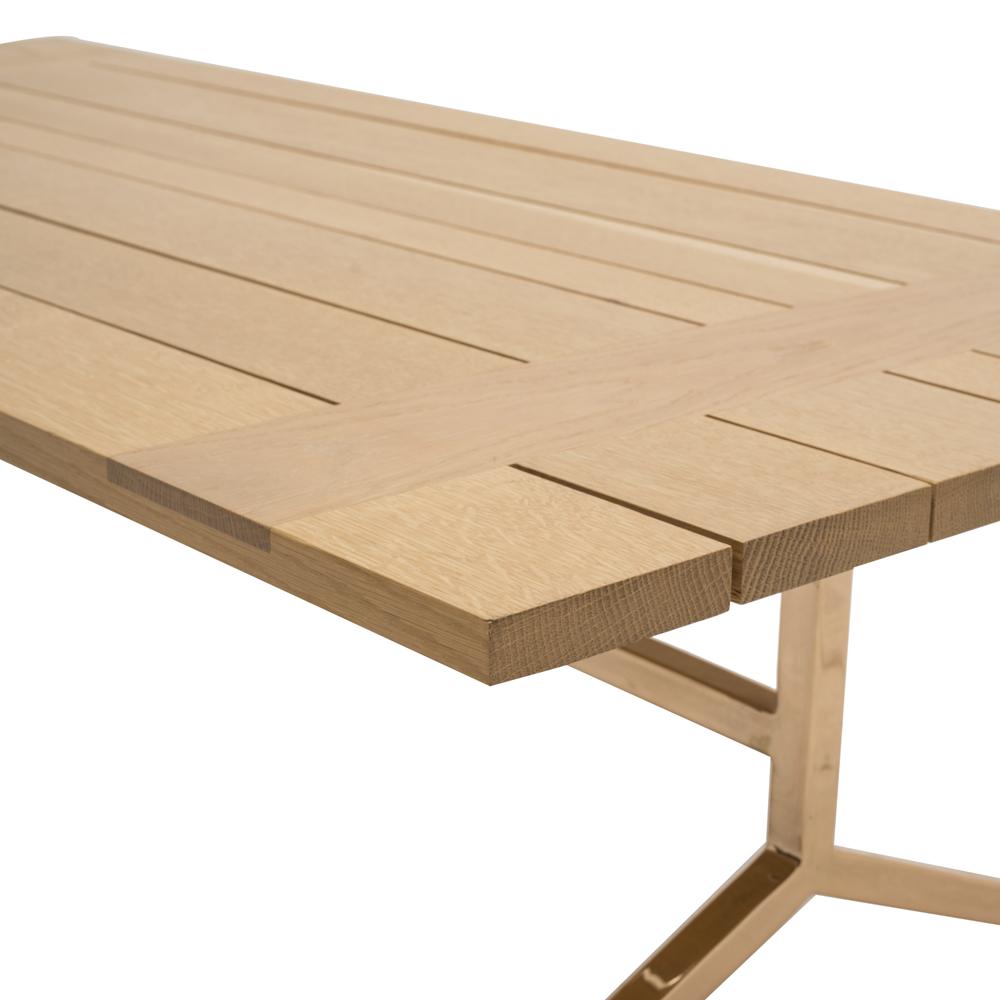 Details: Contemporary picnic-style light wood coffee table with gold legsDimensions: 17" H x 61" W x 28" D Quantity: