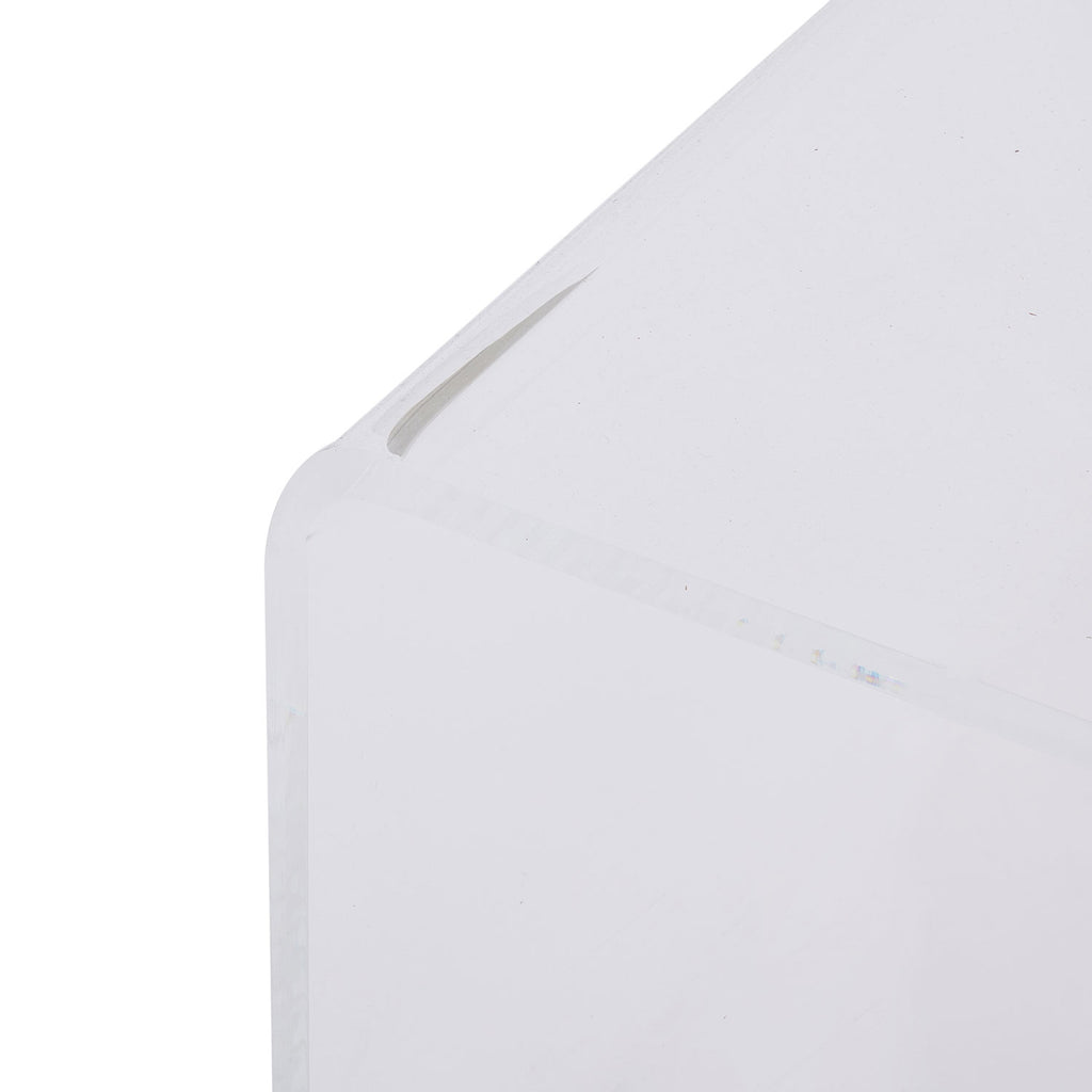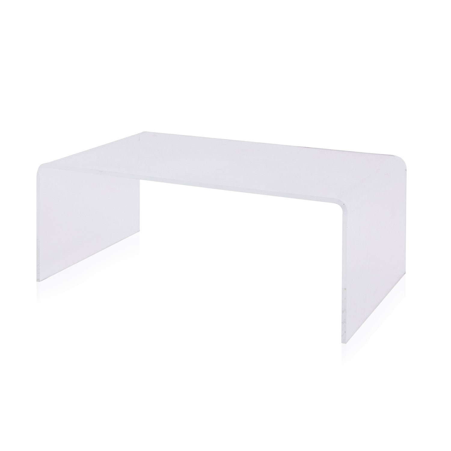 Details: Minimalist clear plexiglass coffee table with curved corners Dimensions: 13.5" H x 38" W x 21" D