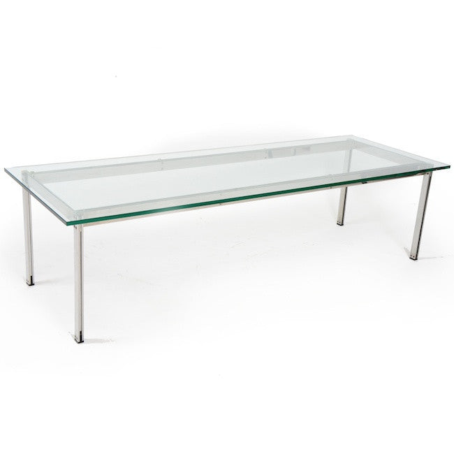Details: Chrome rectangle chrome base coffee table with glass top and geometric base design Dimensions: 16.5" H x 57" W X 27" D