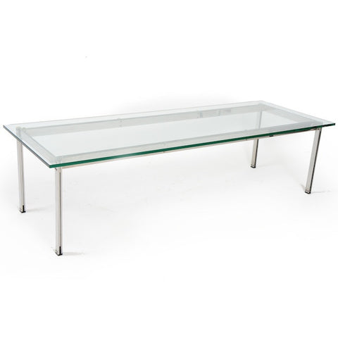 Details: Chrome rectangle chrome base coffee table with glass top, lower level, and lucite frame Dimensions: 17" H x 57" W X 25" D