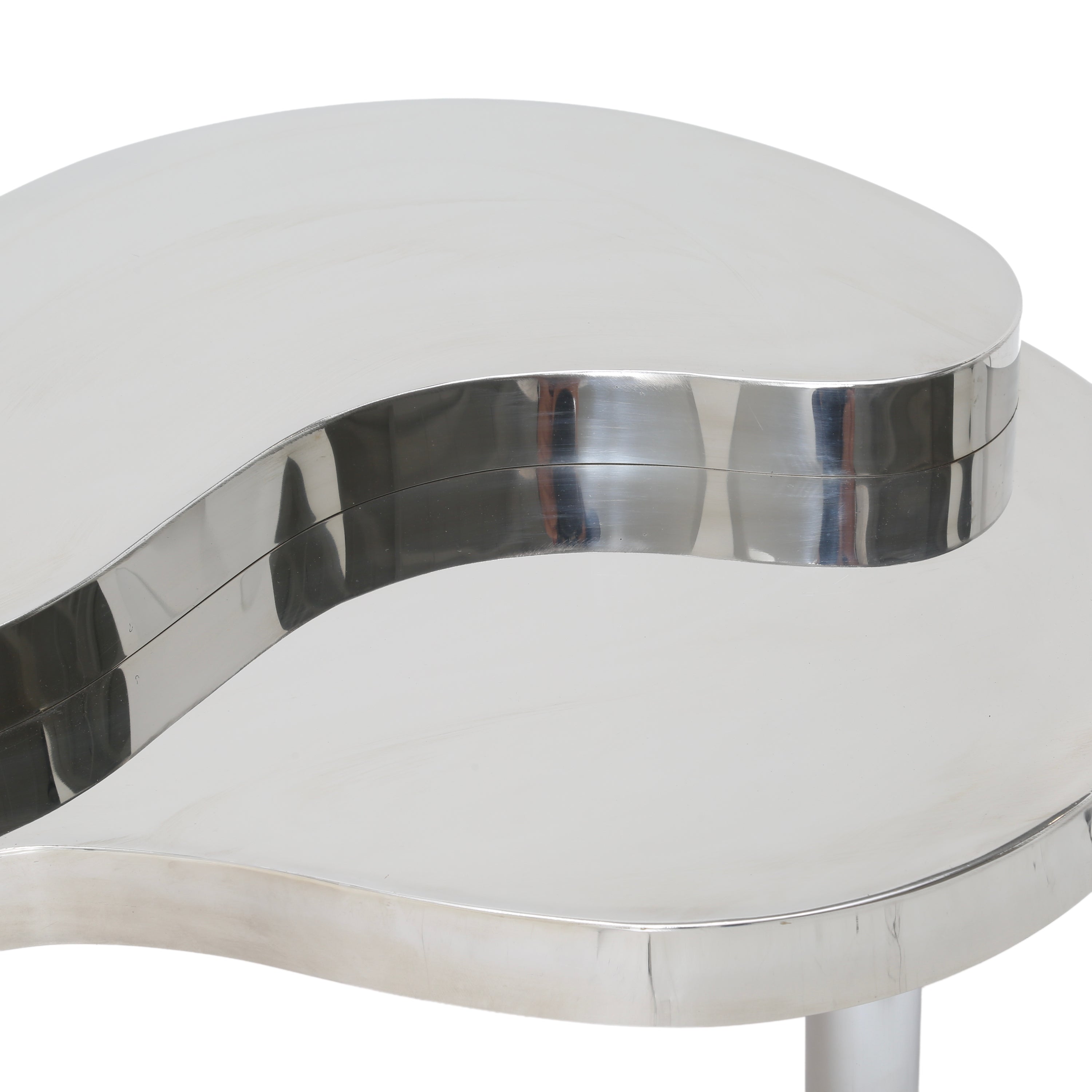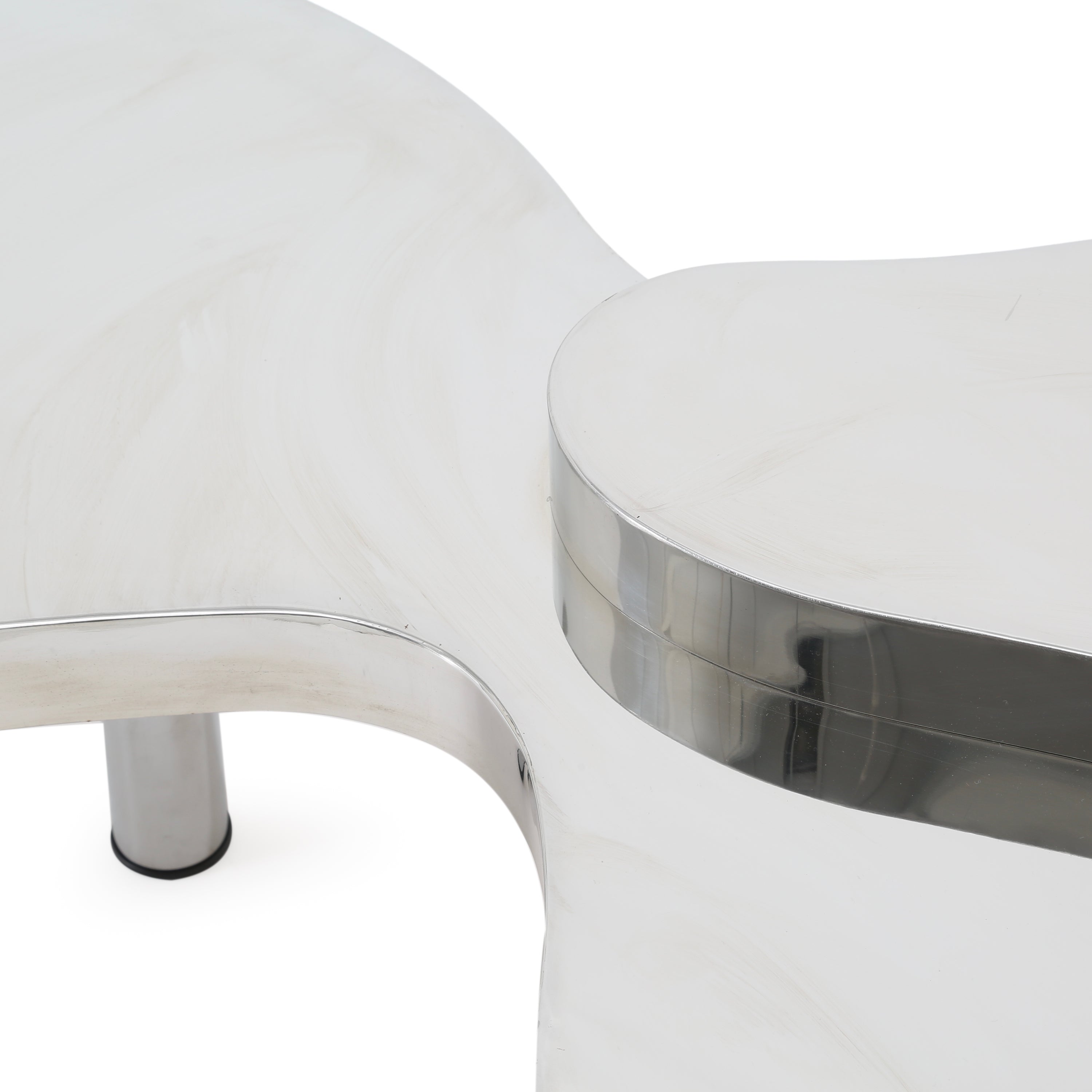 Details: Forged pearl side table with curved edges and glass top. (Matching coffee table rented separately) Please note that the table is heavy and may...
