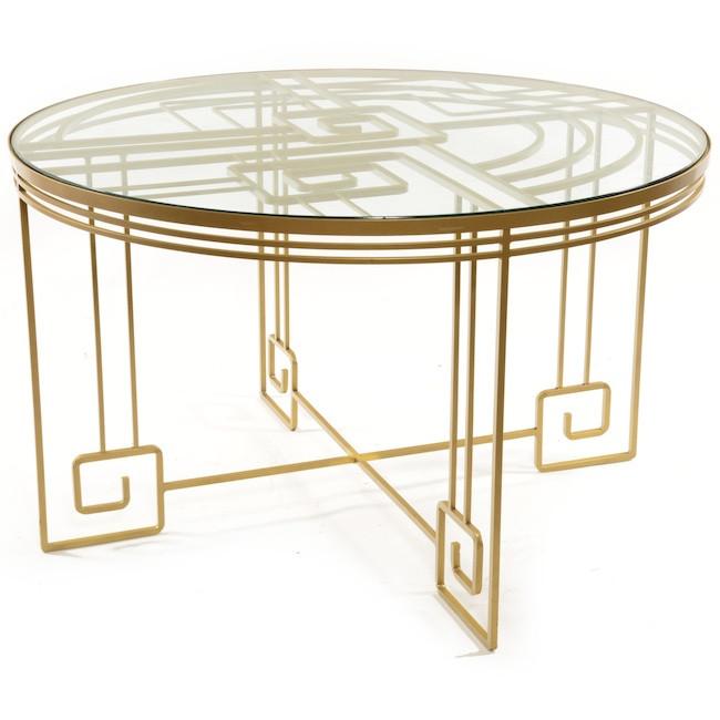Details: Metallic dining table with distressed features and chrome patchwork pattern. Noticeable wear - rented as is. Dimensions: 29" H x 71" W x 54"...