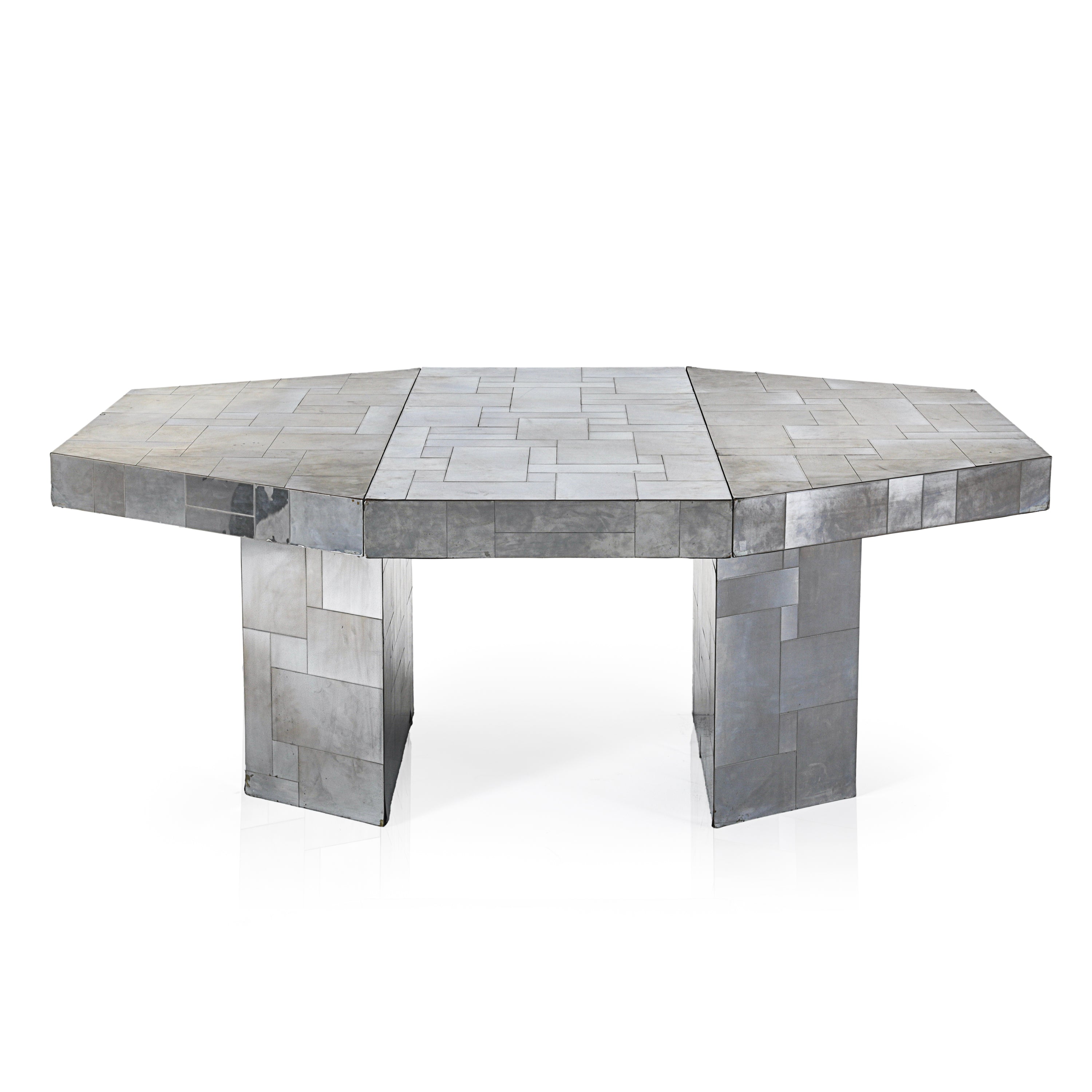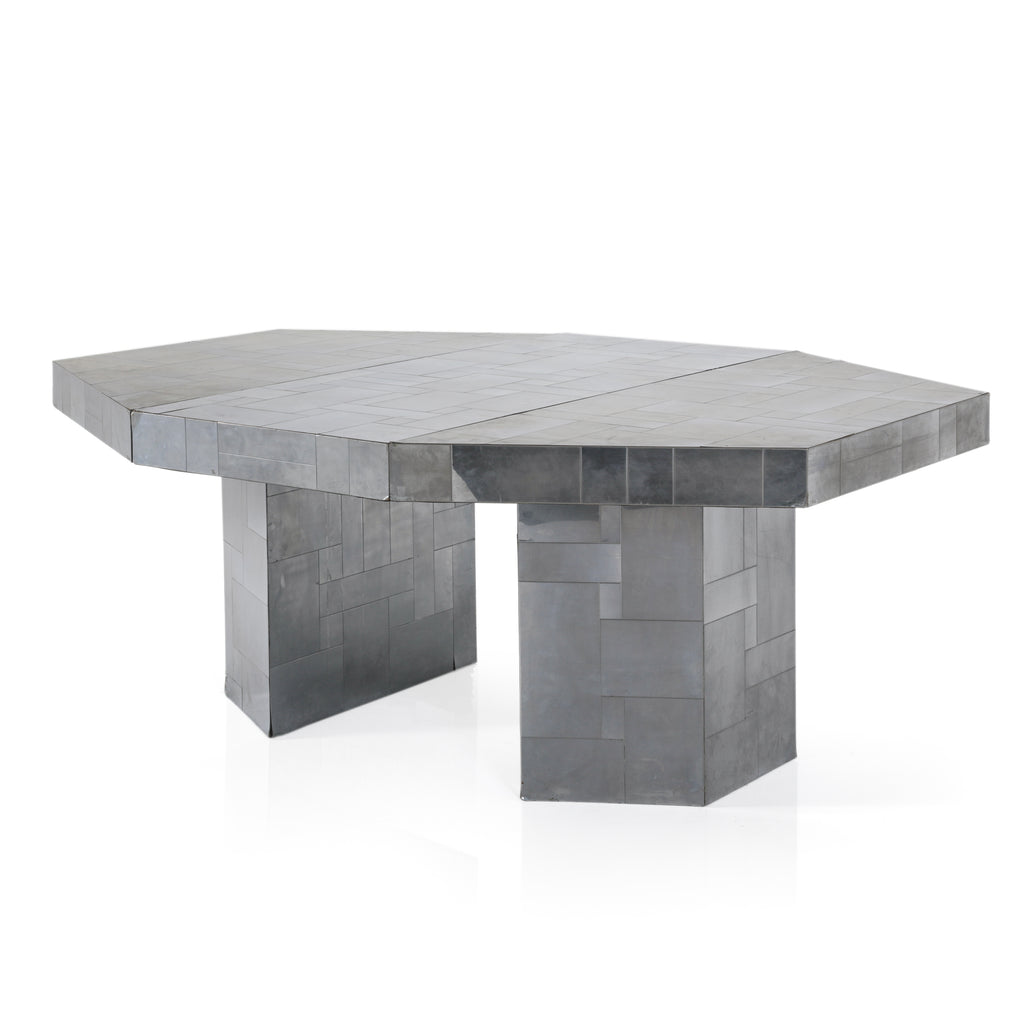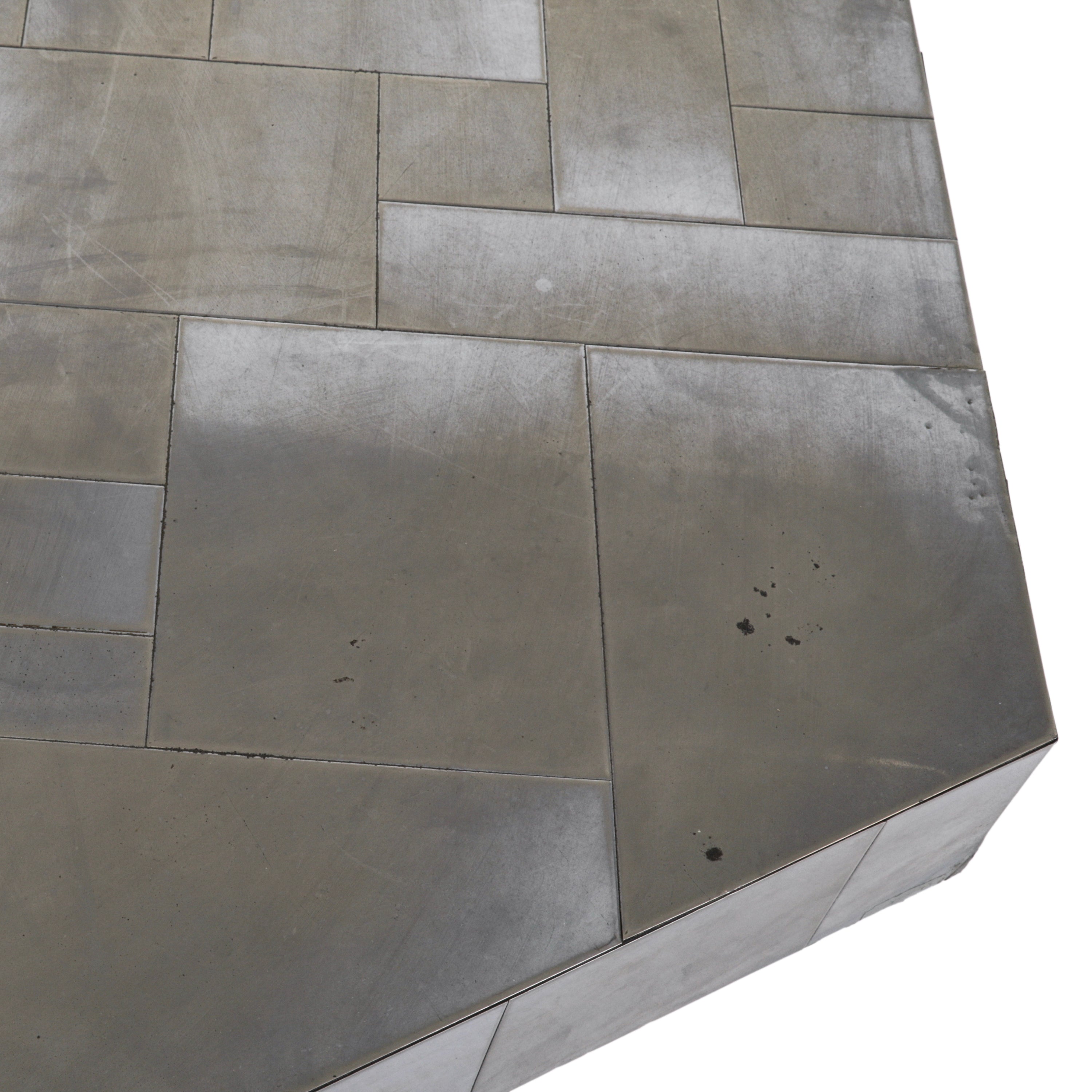 Details: Metallic dining table with distressed features and chrome patchwork pattern. Noticeable wear - rented as is. Dimensions: 29" H x 71" W x 54"...