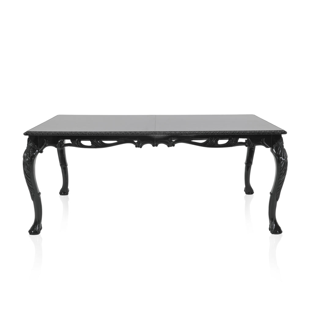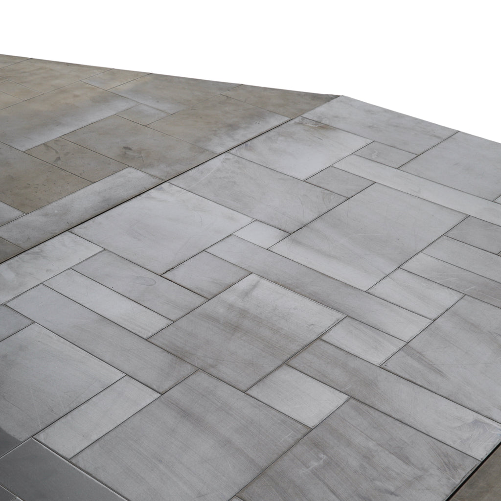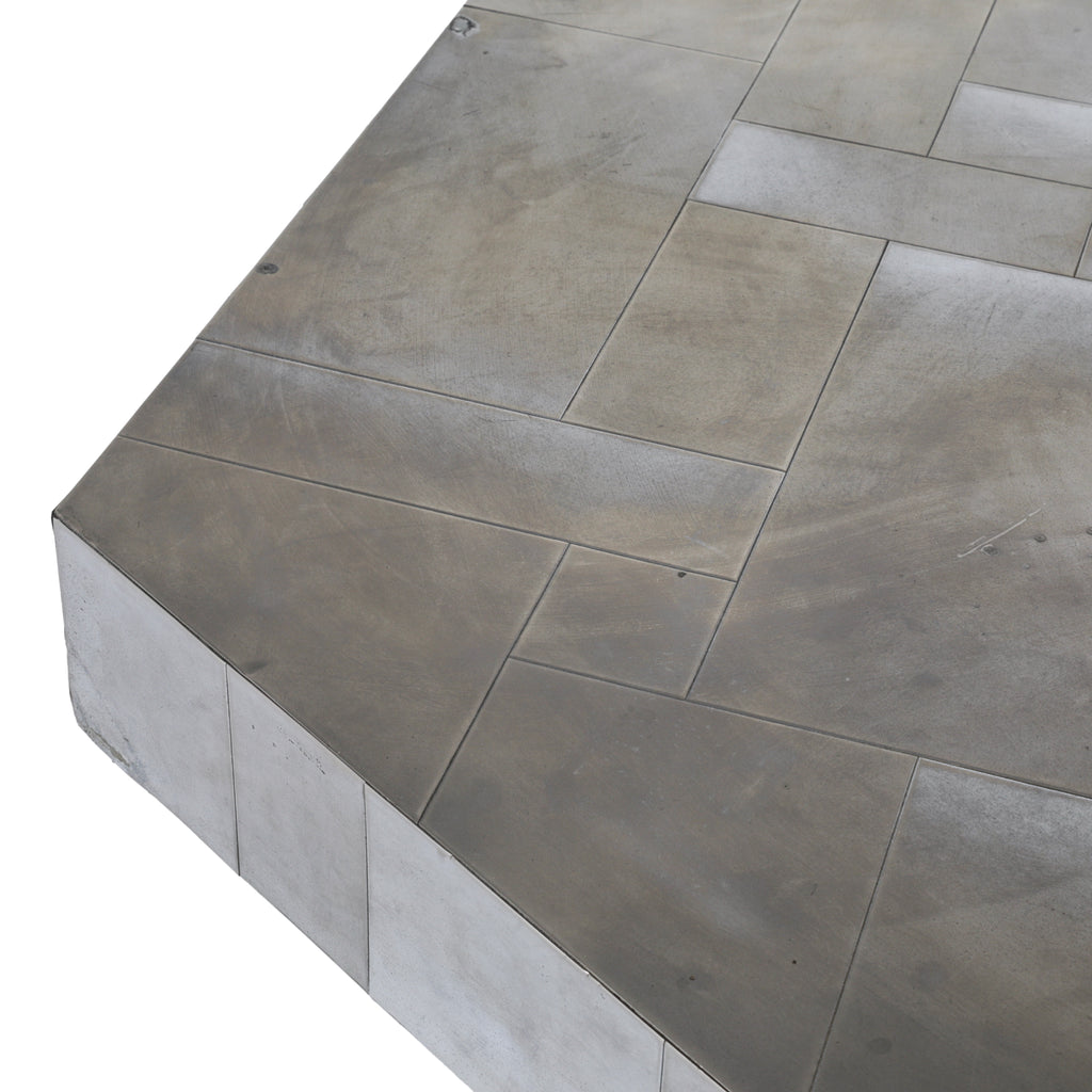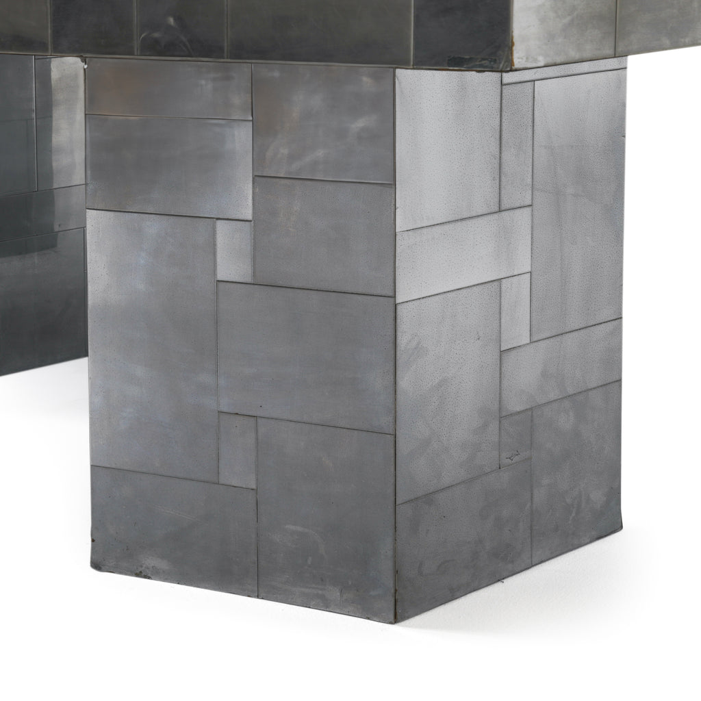 Details: Metallic dining table with distressed features and chrome patchwork pattern. Noticeable wear - rented as is. Dimensions: 29" H x 71" W x 54"...
