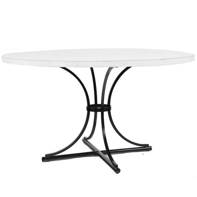 Details: White round top dining table with black crossed leg metal frameDimensions: 27" H x 48" D x 48" W Quantity: 1