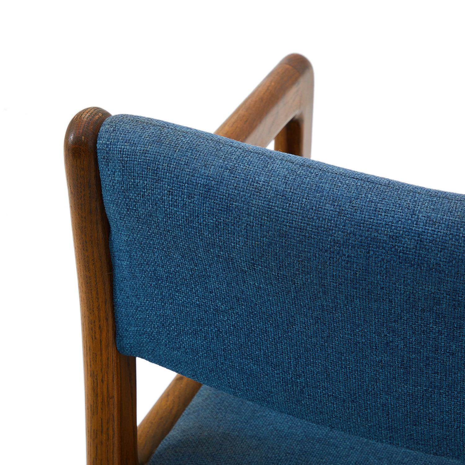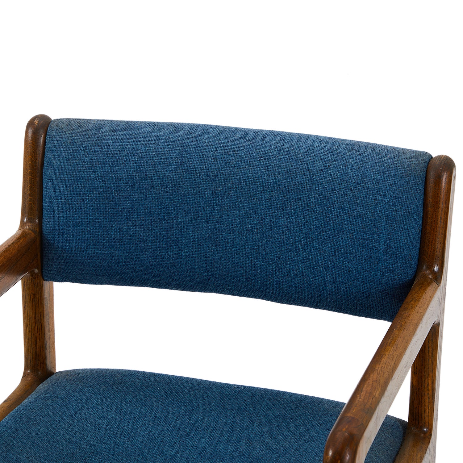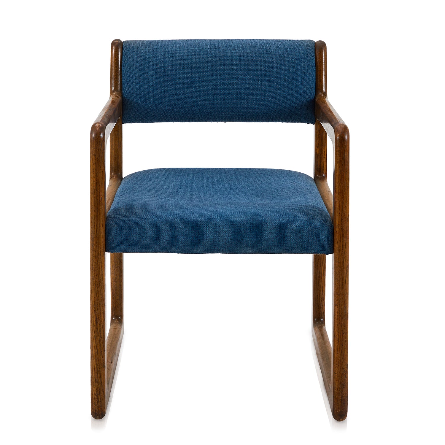 Details: Blue upholstered mid century modern chair with wooden frame and arm rests Dimensions: 31" H x 22" W x 22" D
