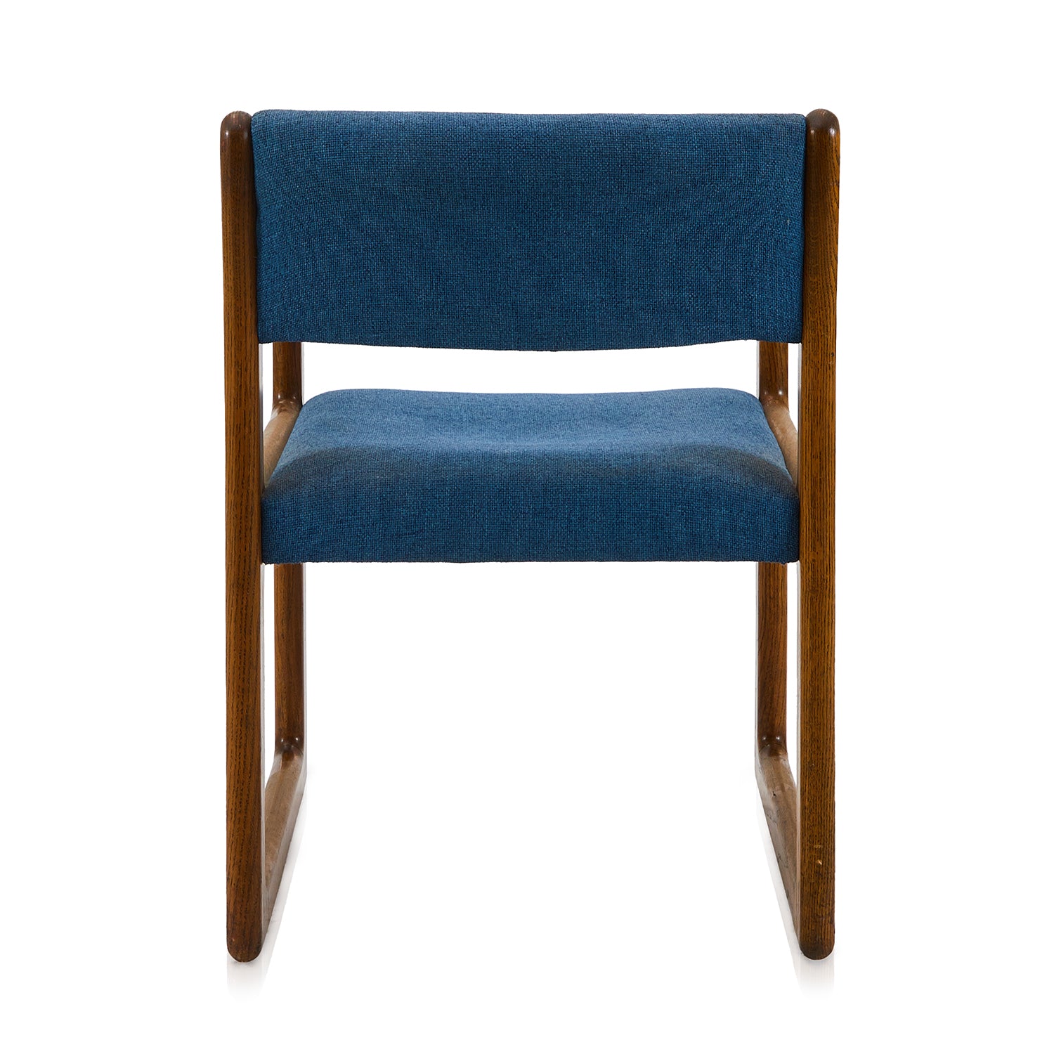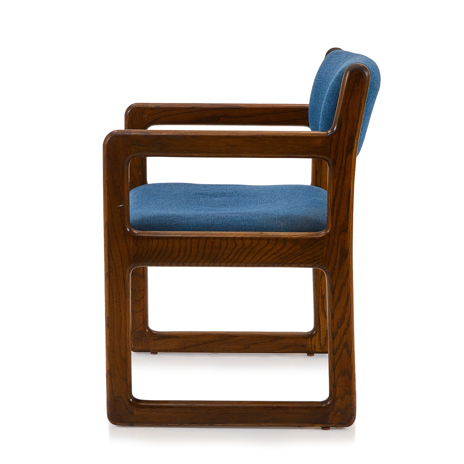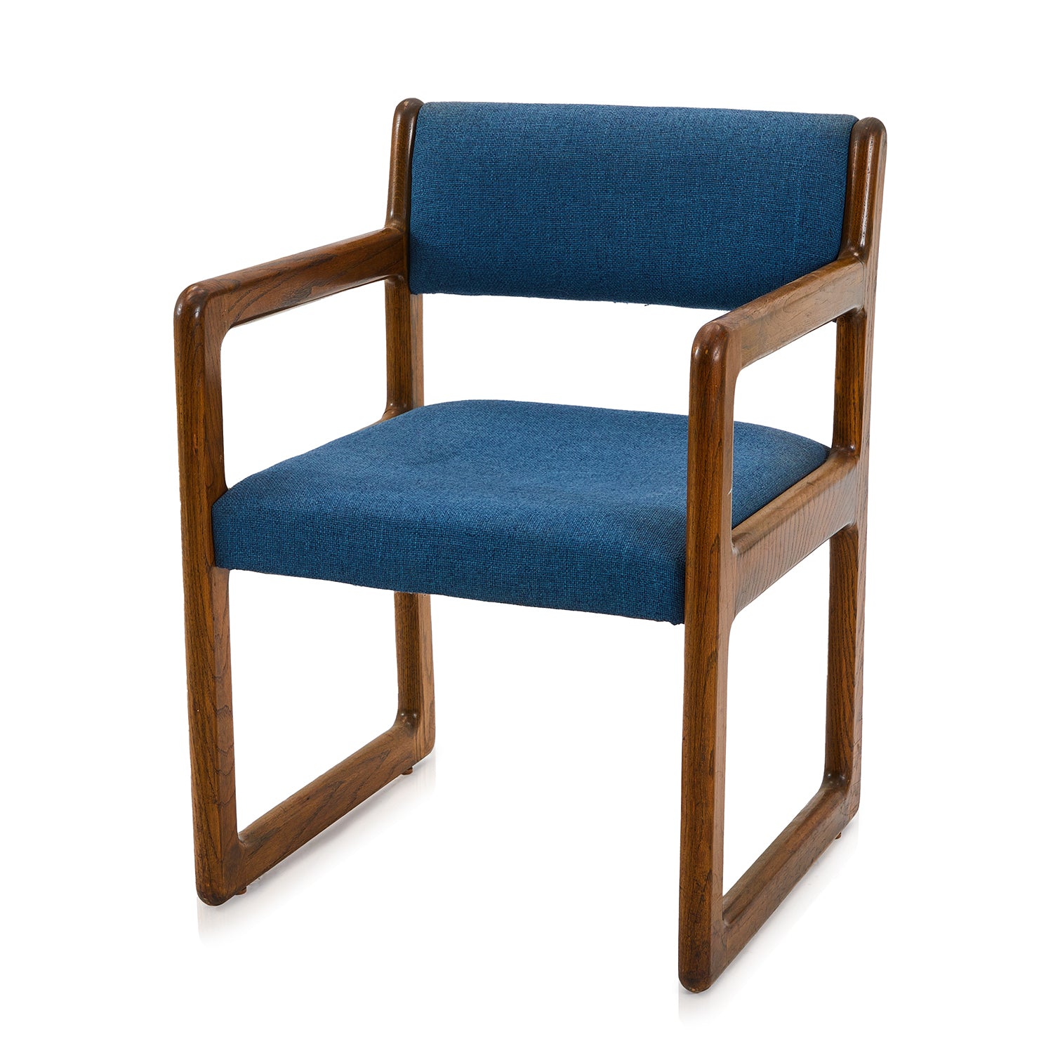 Details: Blue vinyl arm chair with a small square open back and wood arms and base Dimensions: 33" H x 23" W x 23" D...