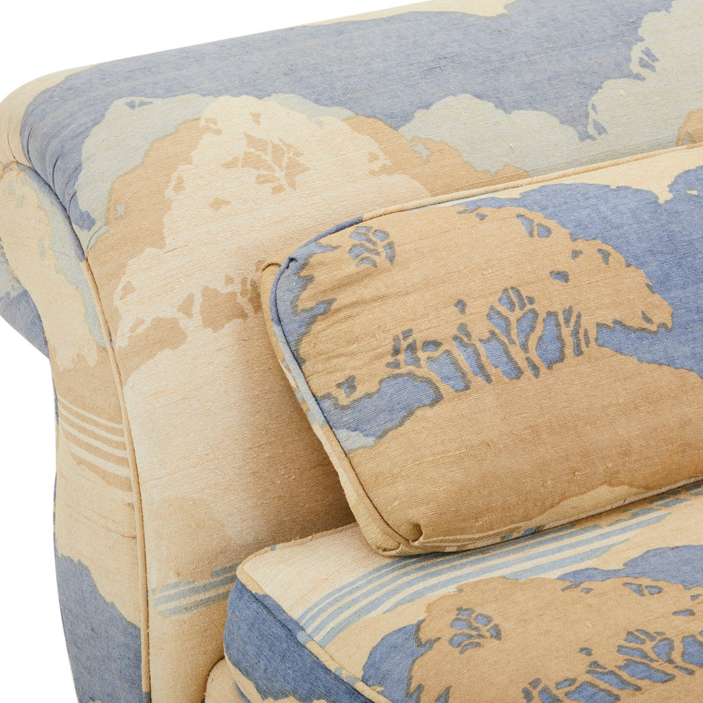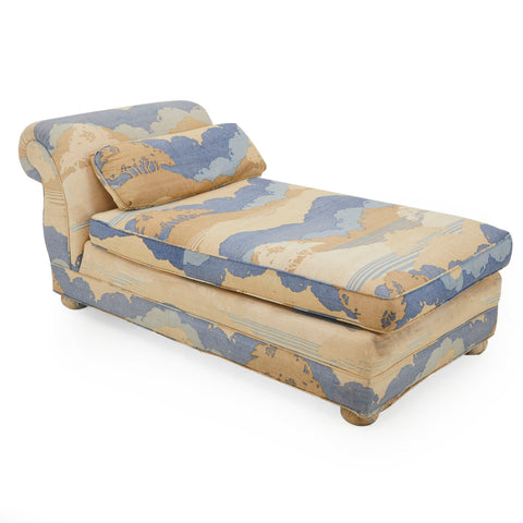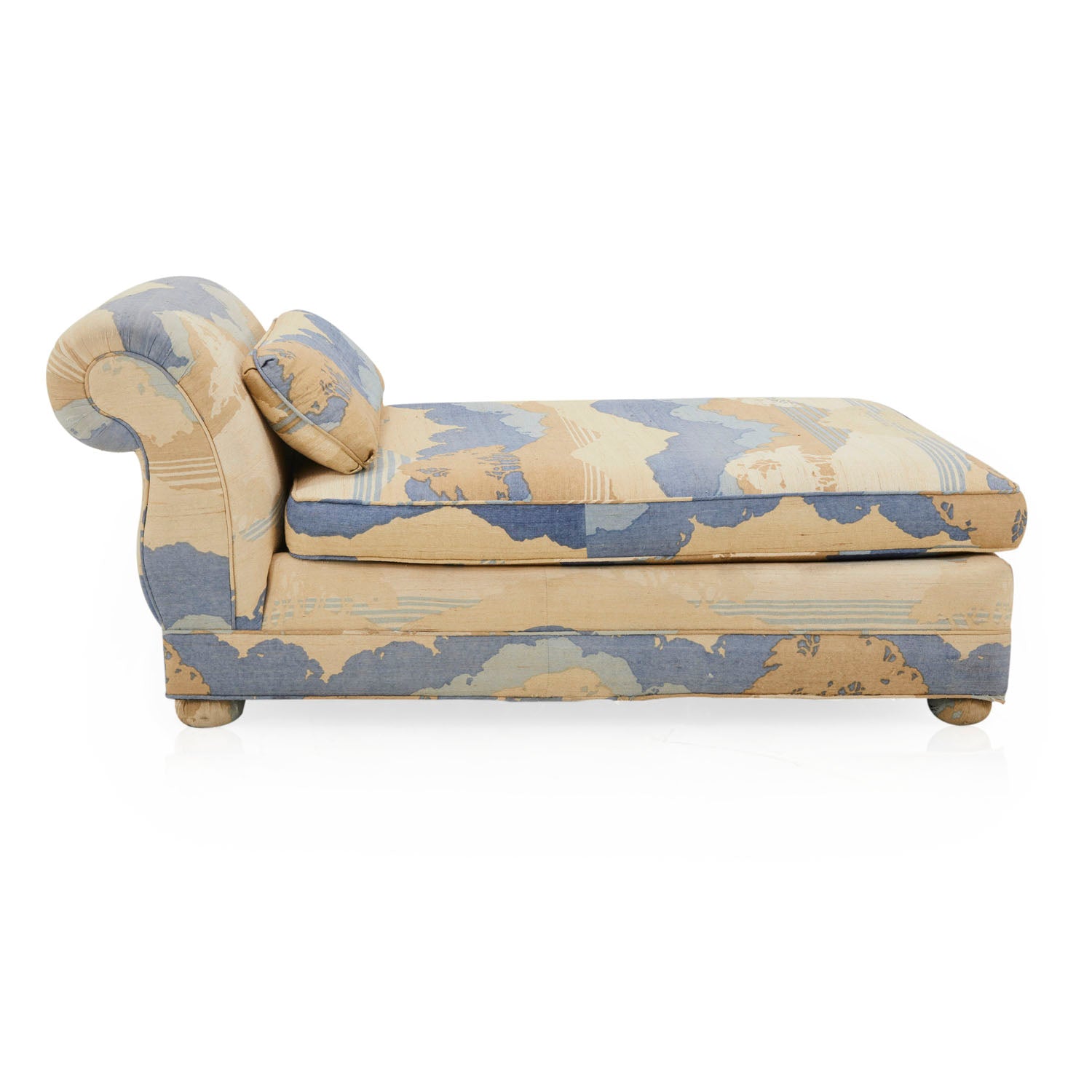 Details: Linen chaise lounge with blue and tan forest pattern, vintage, with 1 matching bolster pillow Dimensions: 29" H x 34" W x 65" D Quantity: 1