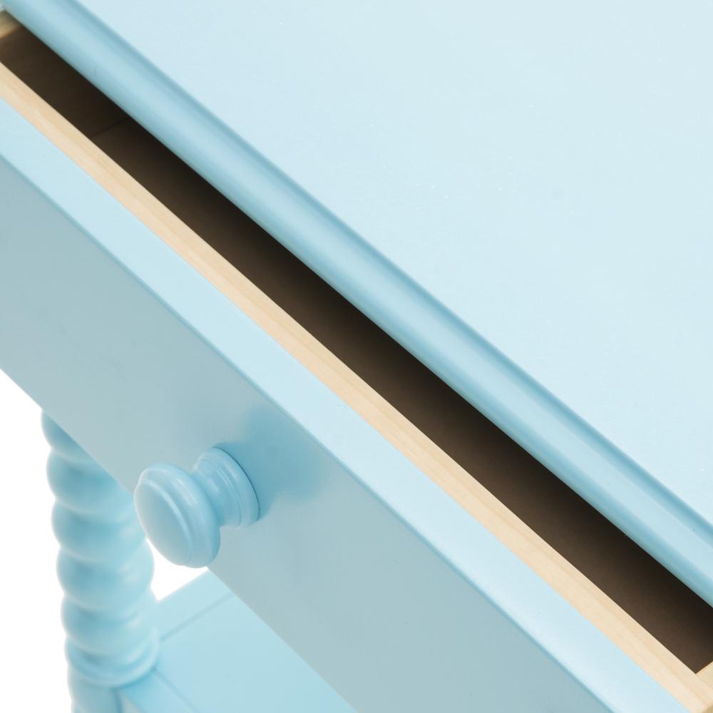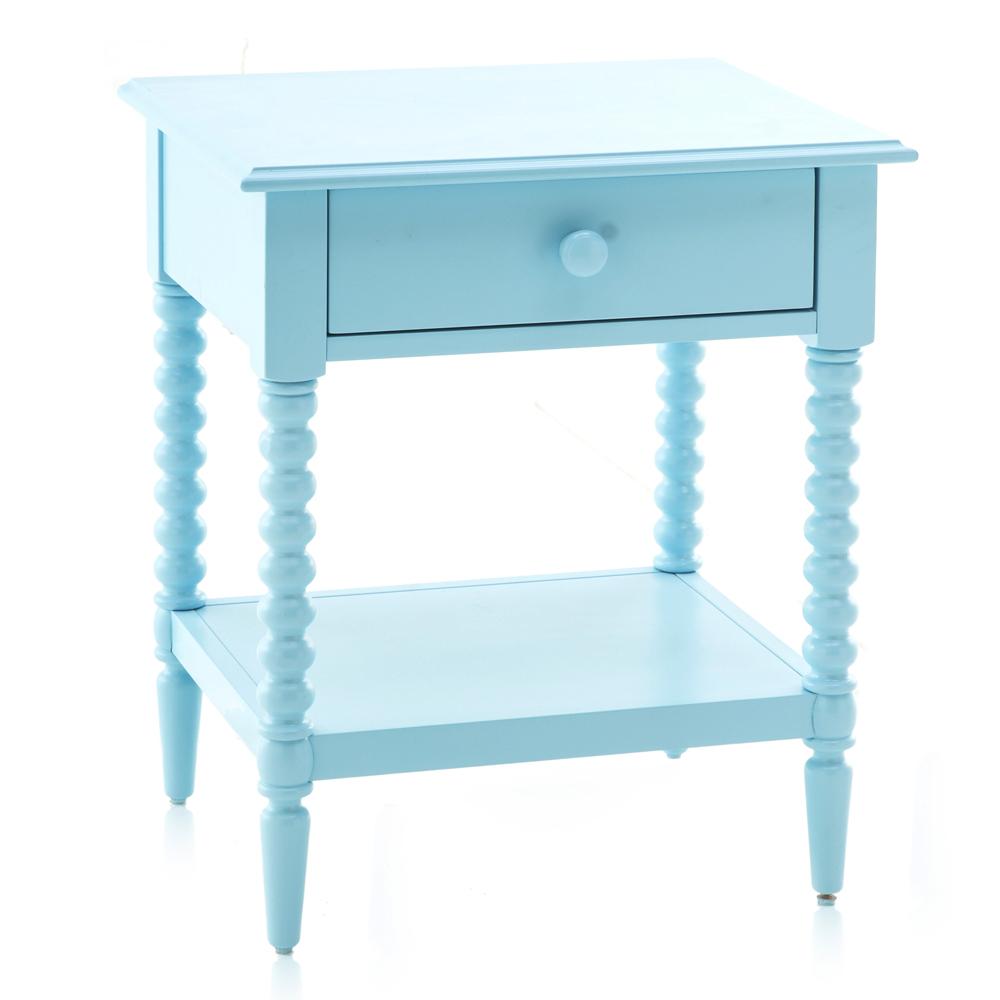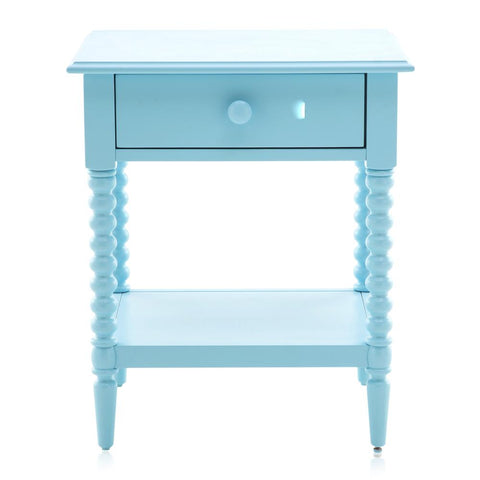 Details: Blue bedside table, turned wood pegs and a single drawer Dimensions: 25" H x 21" W x 17" D Quantity: 2
