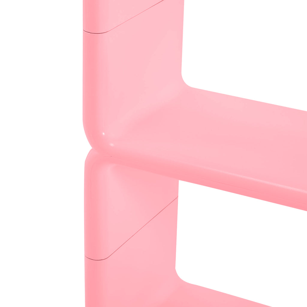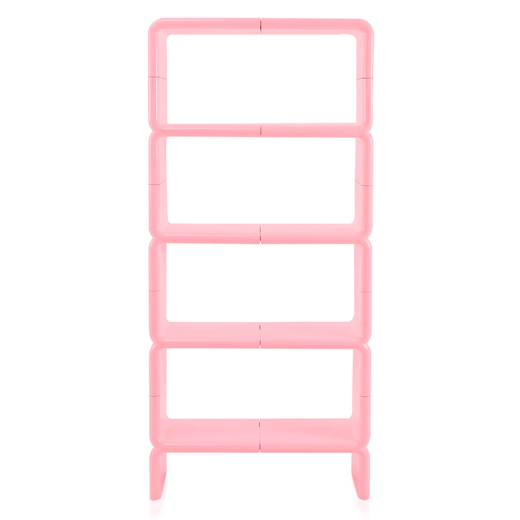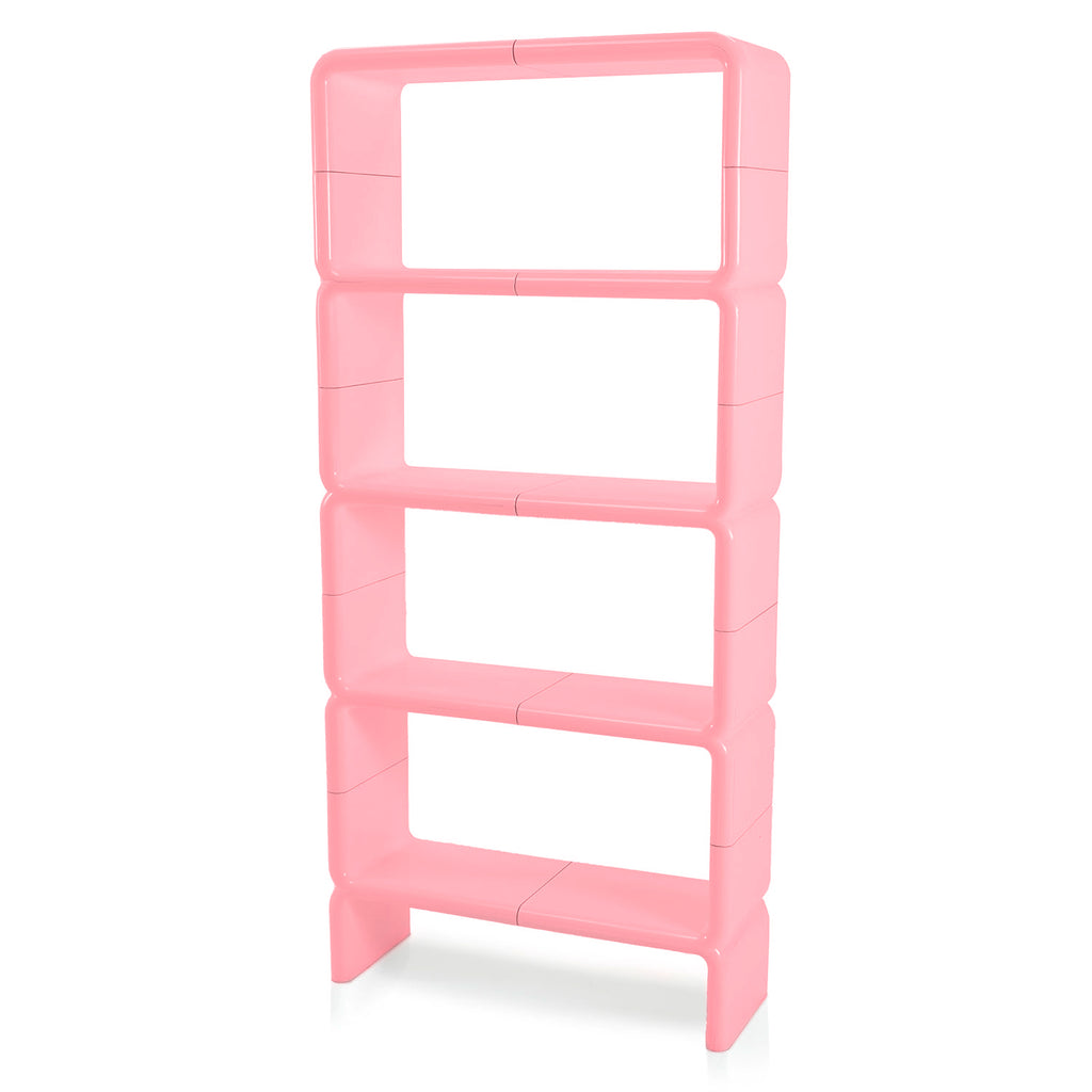 Details: Pink plastic contemporary bookshelf with rounded corners Dimensions: 72.5" H x 33.5" W x 12" D Quantity: 1