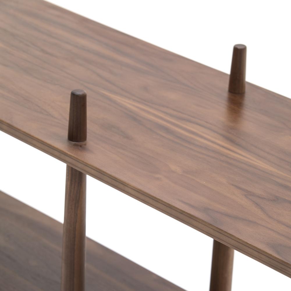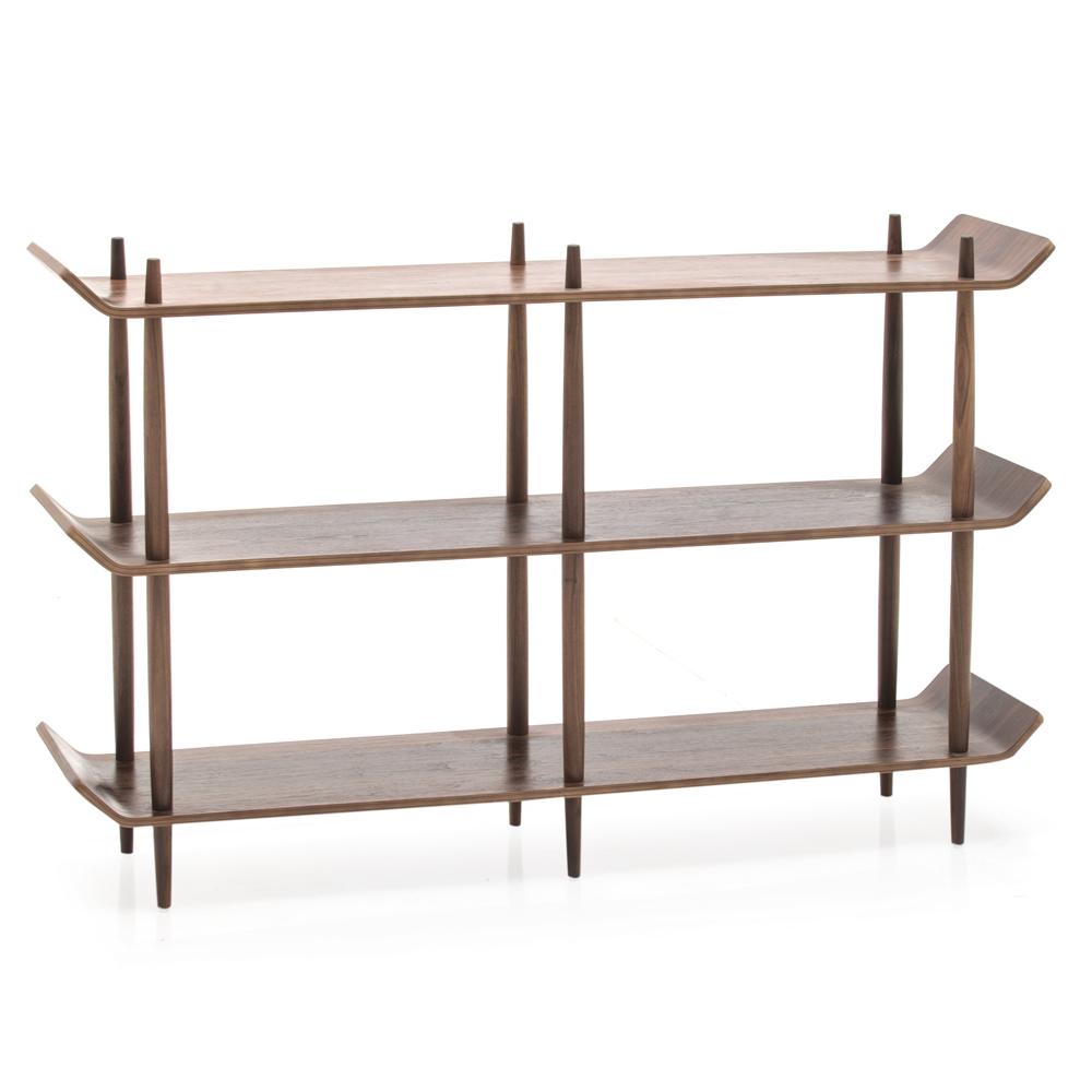 Details: Mid century wood 3-tier book shelf with curled up ends Dimensions: 13" H x 54.5" W x 13" D QTY: 2
