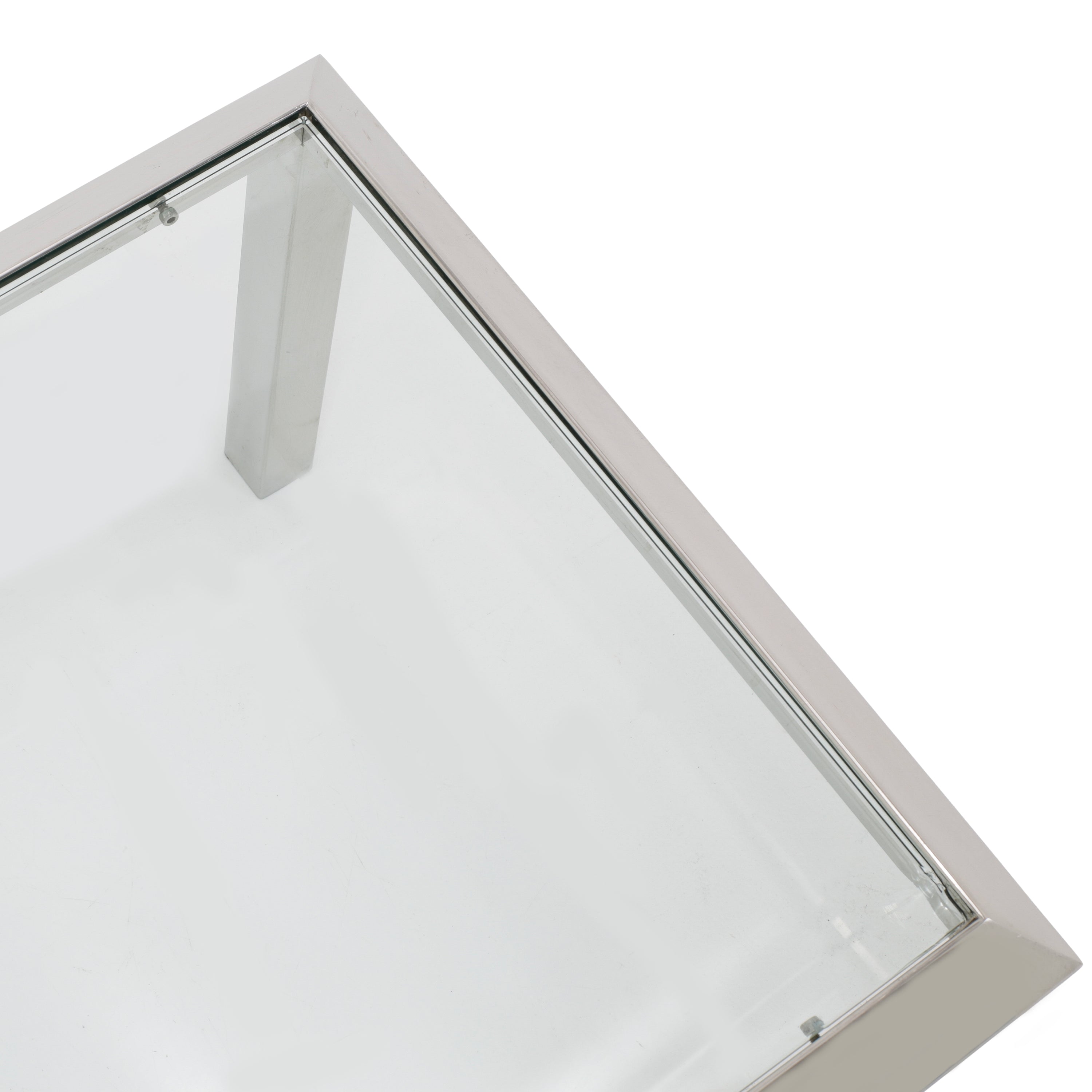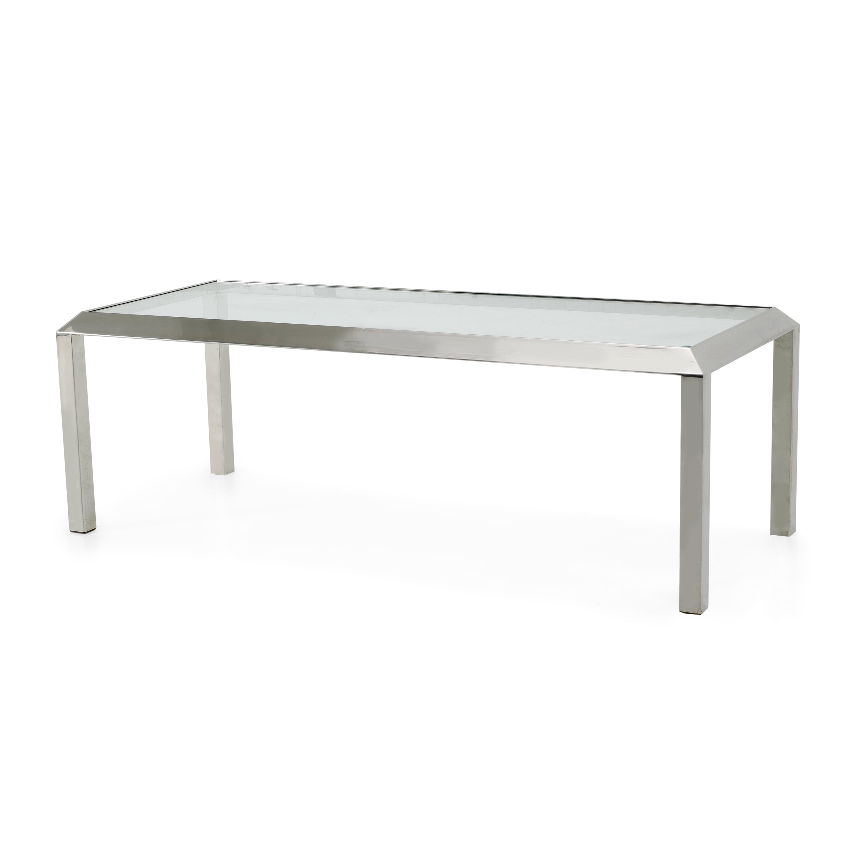 Details: Chrome frame coffee table with a rectangular glass top and beveled chrome corners Dimensions: 16" H x 48" W x 20" D