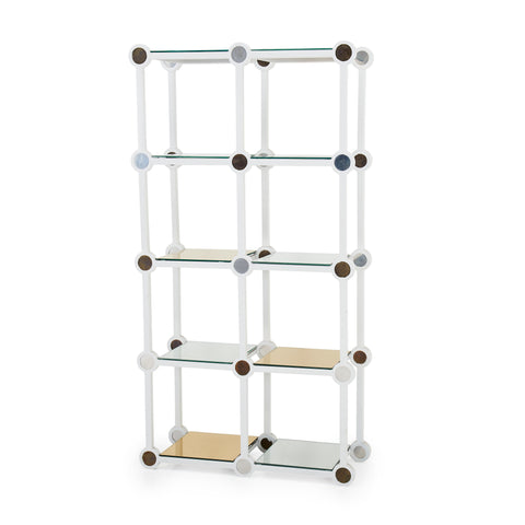 Details: Gold/brass square Large Shelving Unit, with circle cutout center, 4x Glass Shelves Dimensions: 74" H x 58.5" W x 19" D