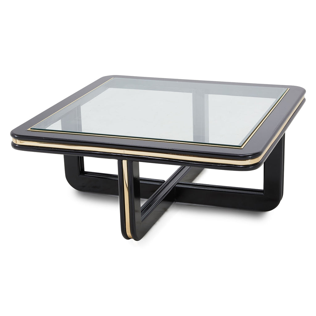 Details: Square coffee table with black lacquer frame, gold accent line and wood cross base Dimensions: 15" H x 38" W x 38" D Quantity: 1