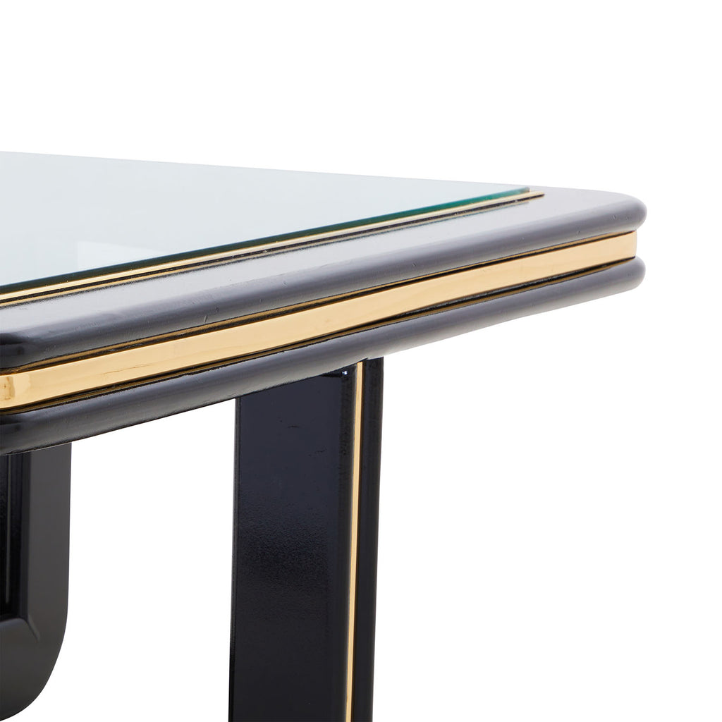 Details: Black glossy lacquer 80's/deco coffee table with gold metal trim Dimensions: 15" H x 48" W x 30" D