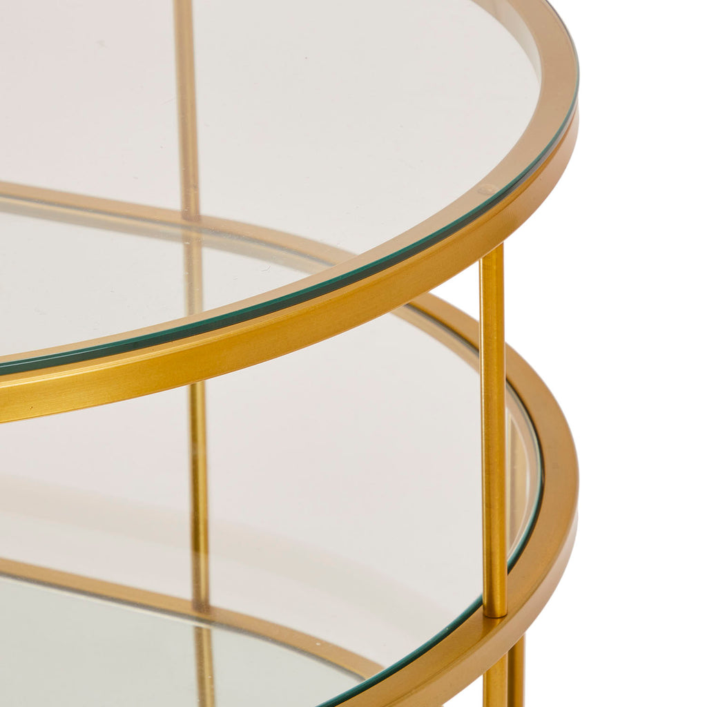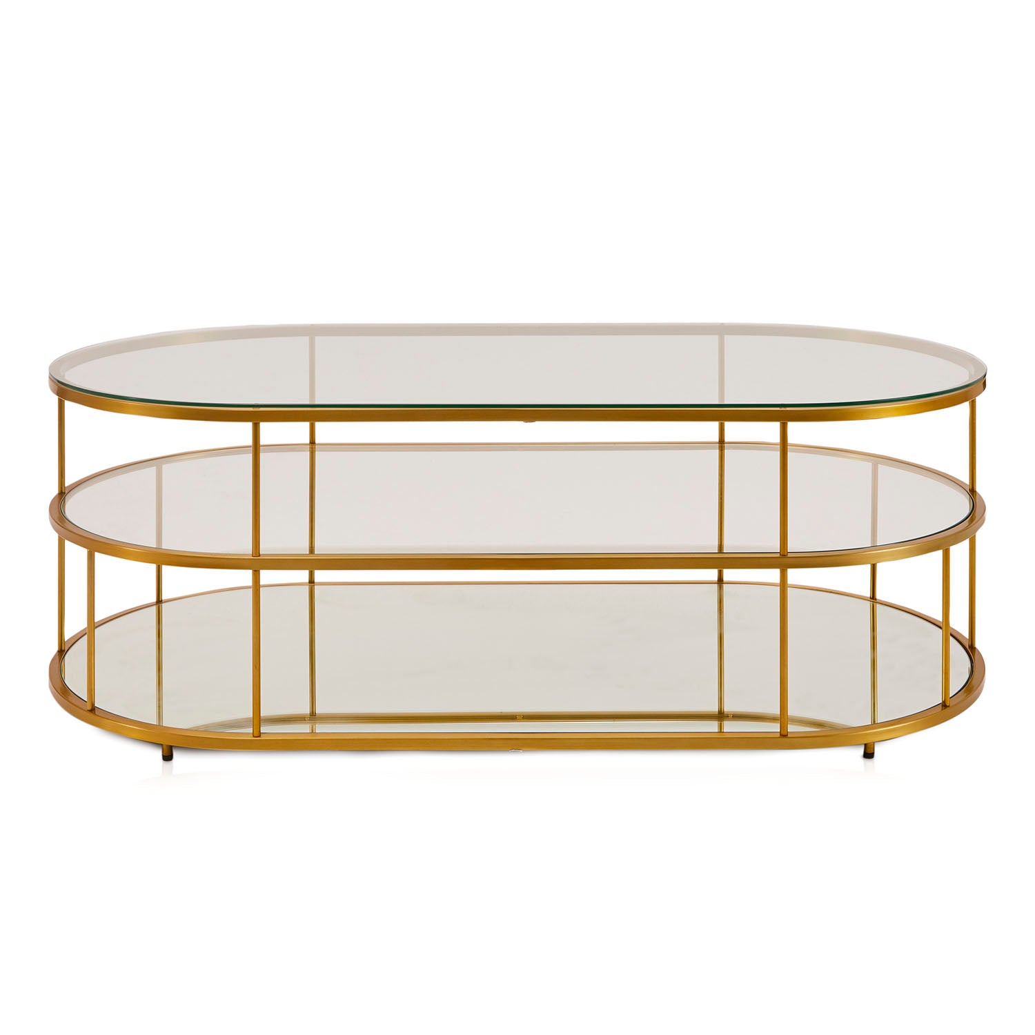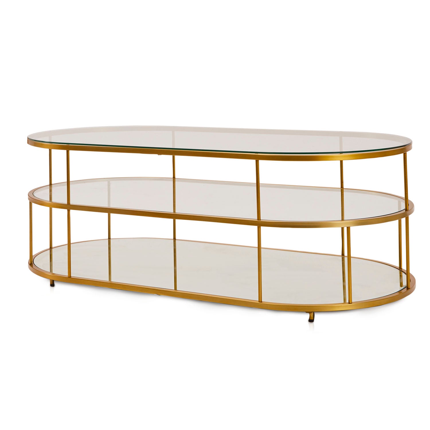 Details: Long oval glass coffee table with gold / brass frame, 3 tiers - top 2 are glass and bottom shelf is mirrored Dimensions: 17" H x...