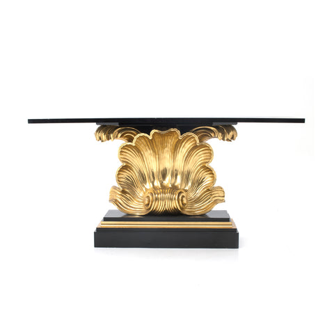 Details: Ornate gold scallop shell table with black top Dimensions: 35" H x 71" W x 18" D