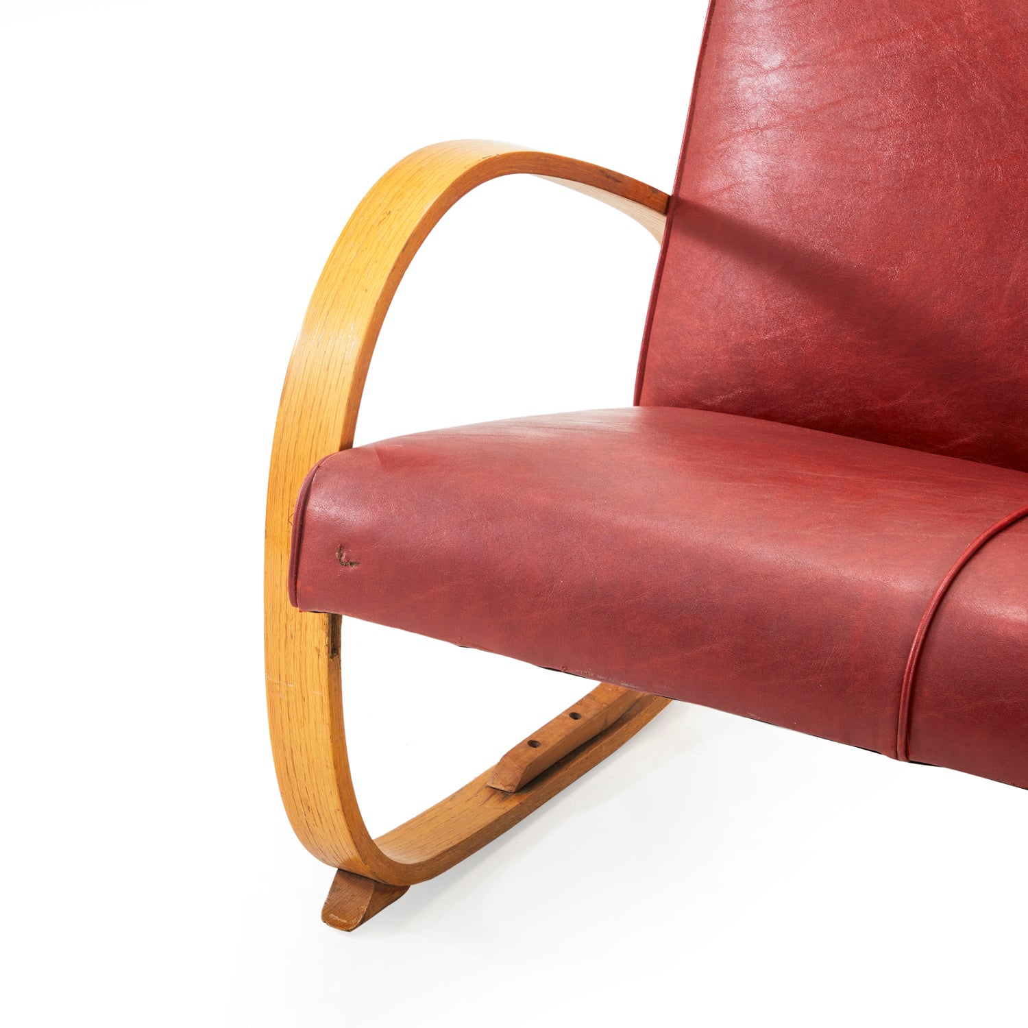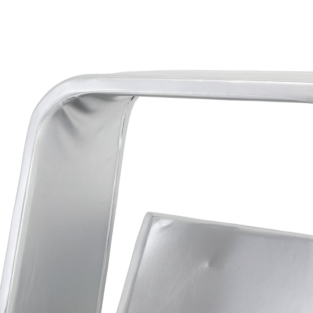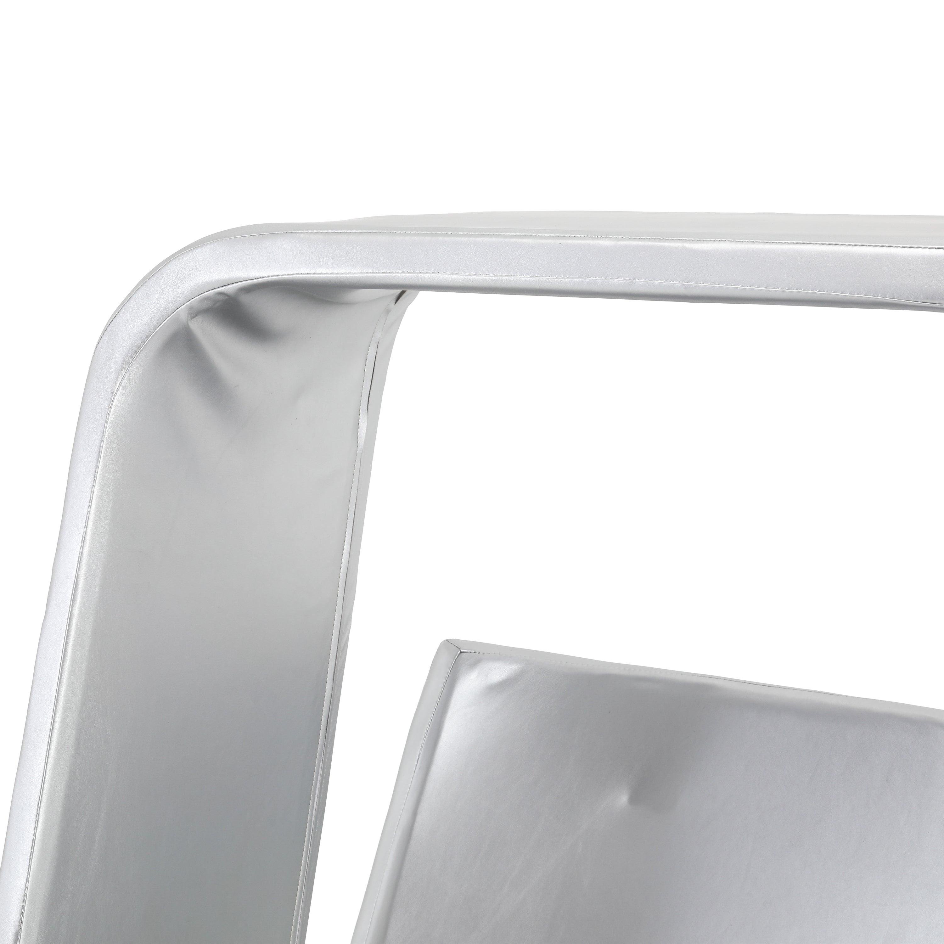 Details: White MIB chair (used in Men in Black) with four-legged chrome base, and three curved white leather sections that form base and backrest, loosely...