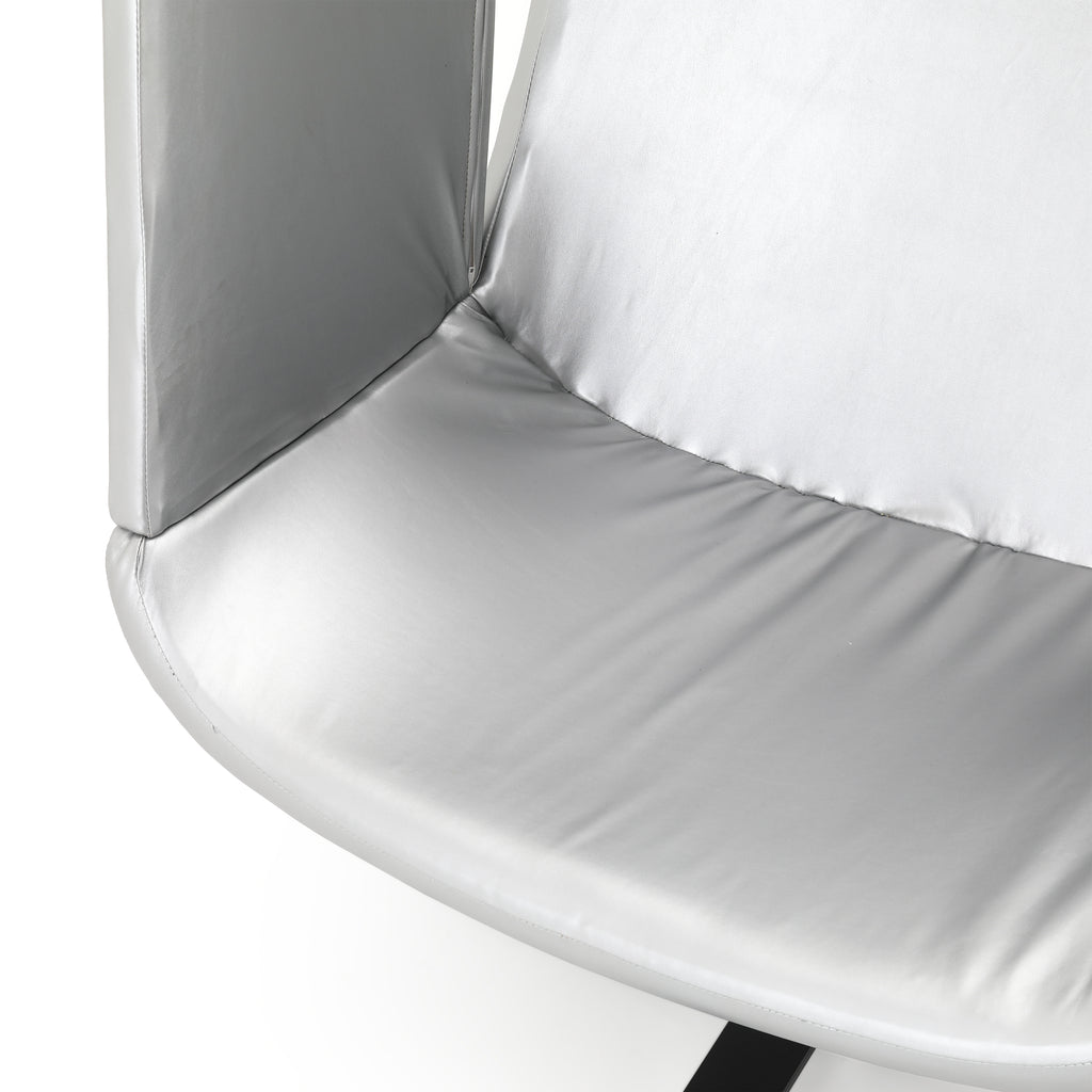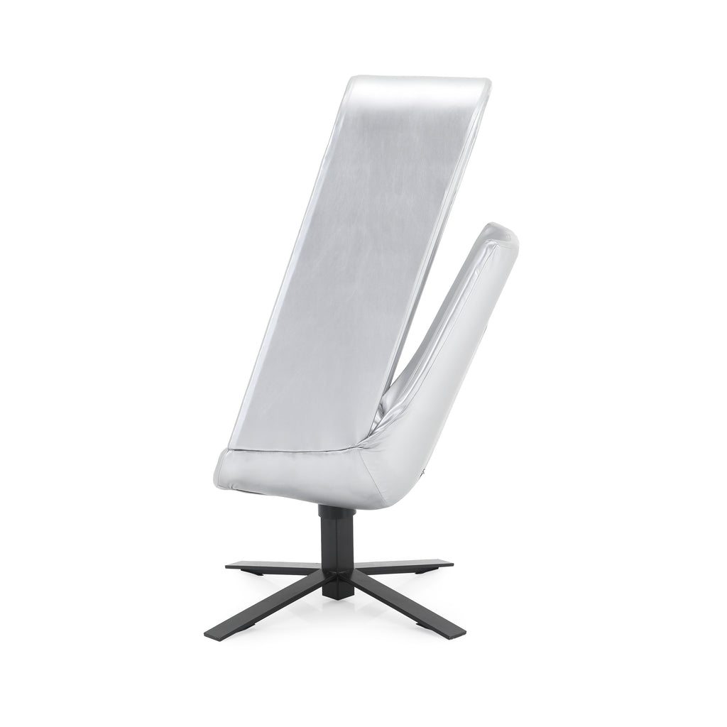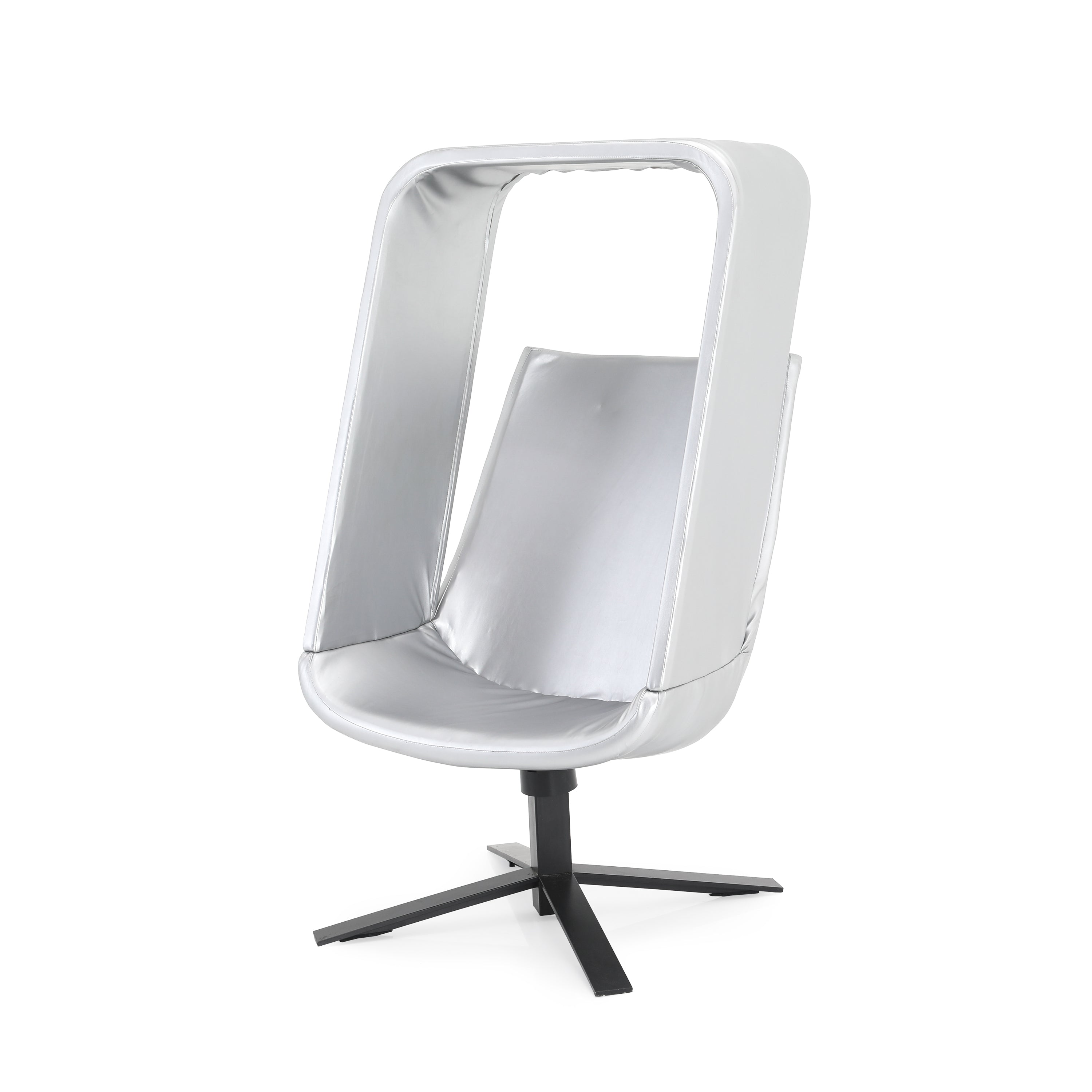 Details: Rotating silver chair with rounded-rectangular frame around seat, with a black metal base, part of a set with matching ottoman ($325 w/ Ottoman, $275...