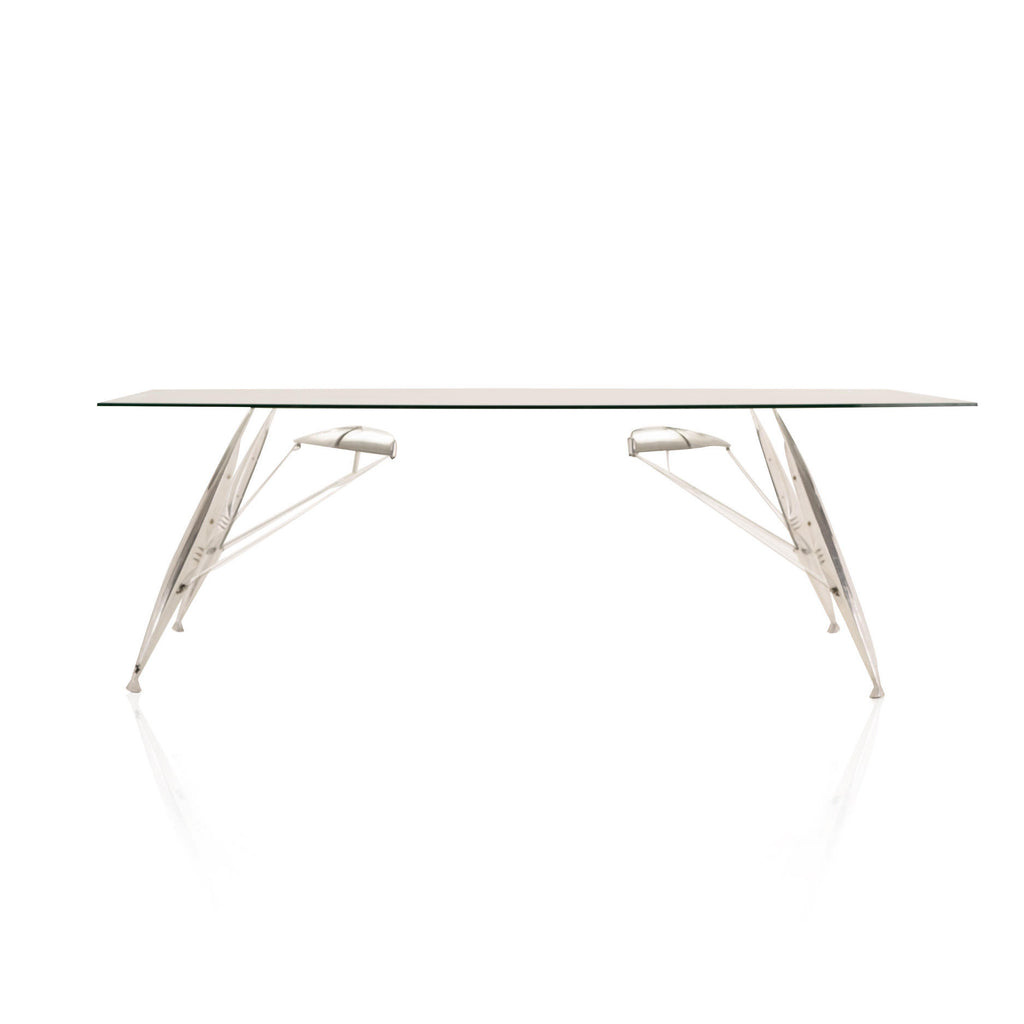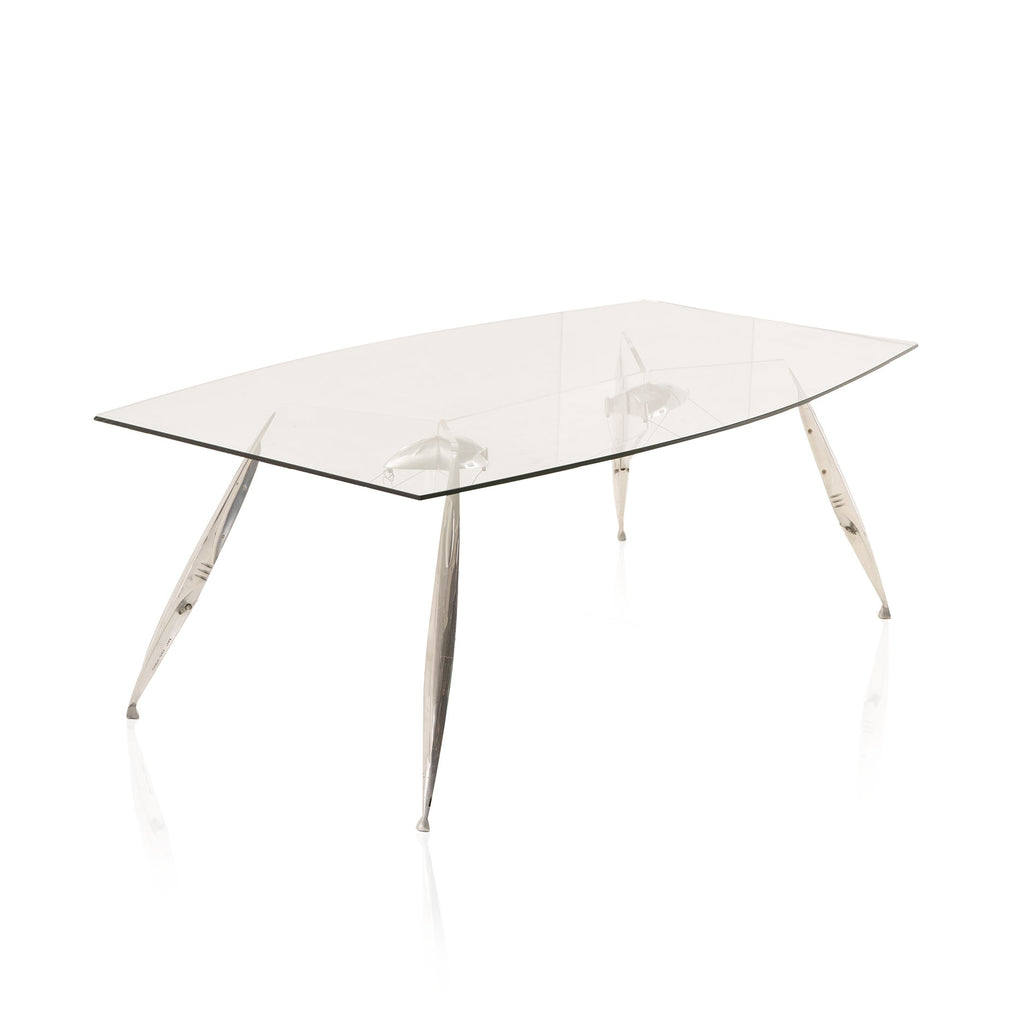 Details: Glass top conference table with angled chrome metal legs and deco connector pieces Dimensions: 27.5" H x 96" W x 64" D Quantity: 1
