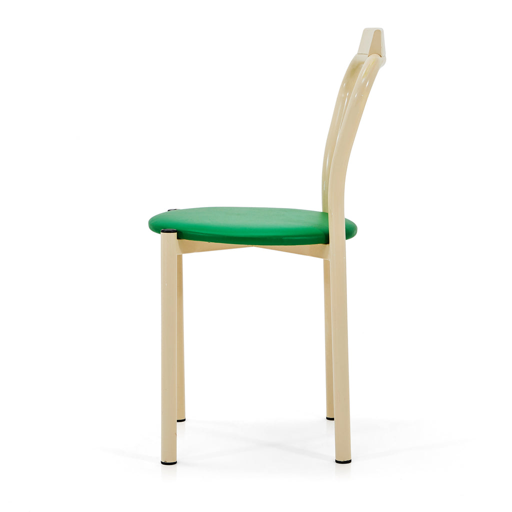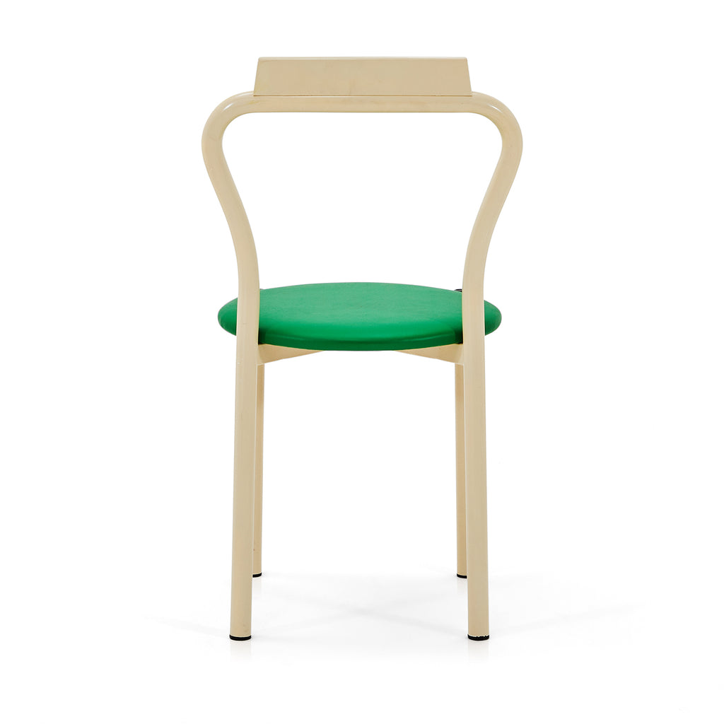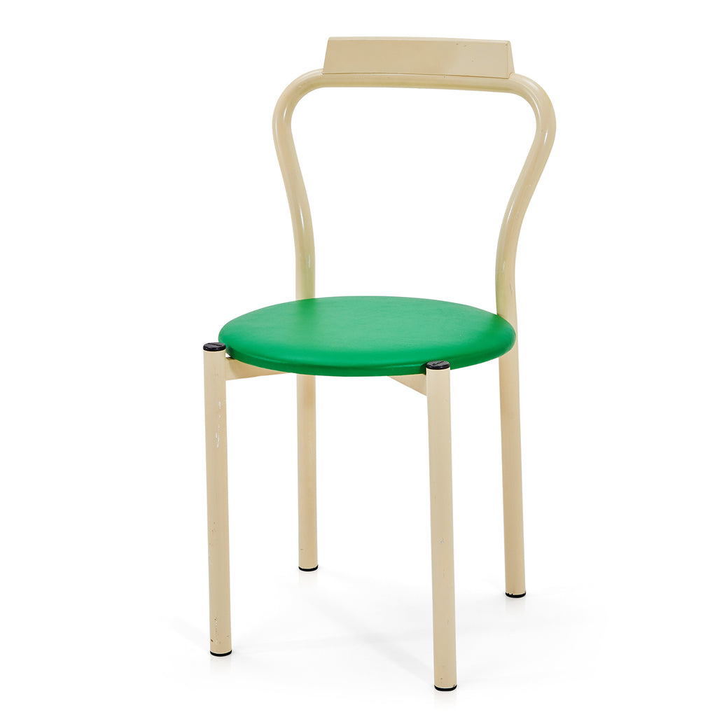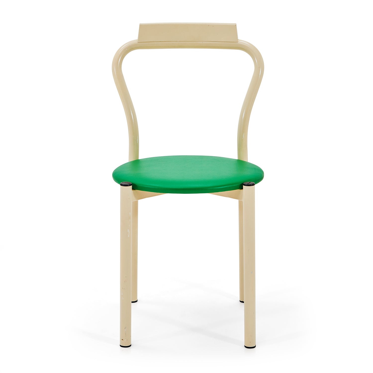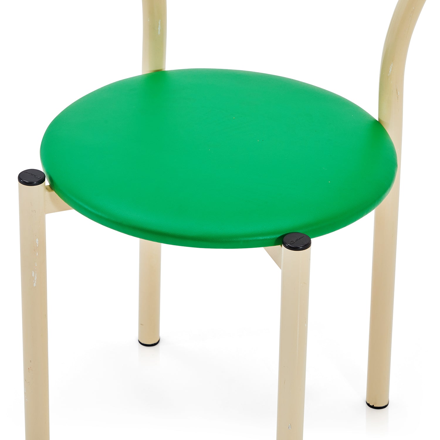 Details: Dining chair with white metal frame and green circular seat cushion Dimensions: 32.5" H x 15" W x 15" D Quantity: 1