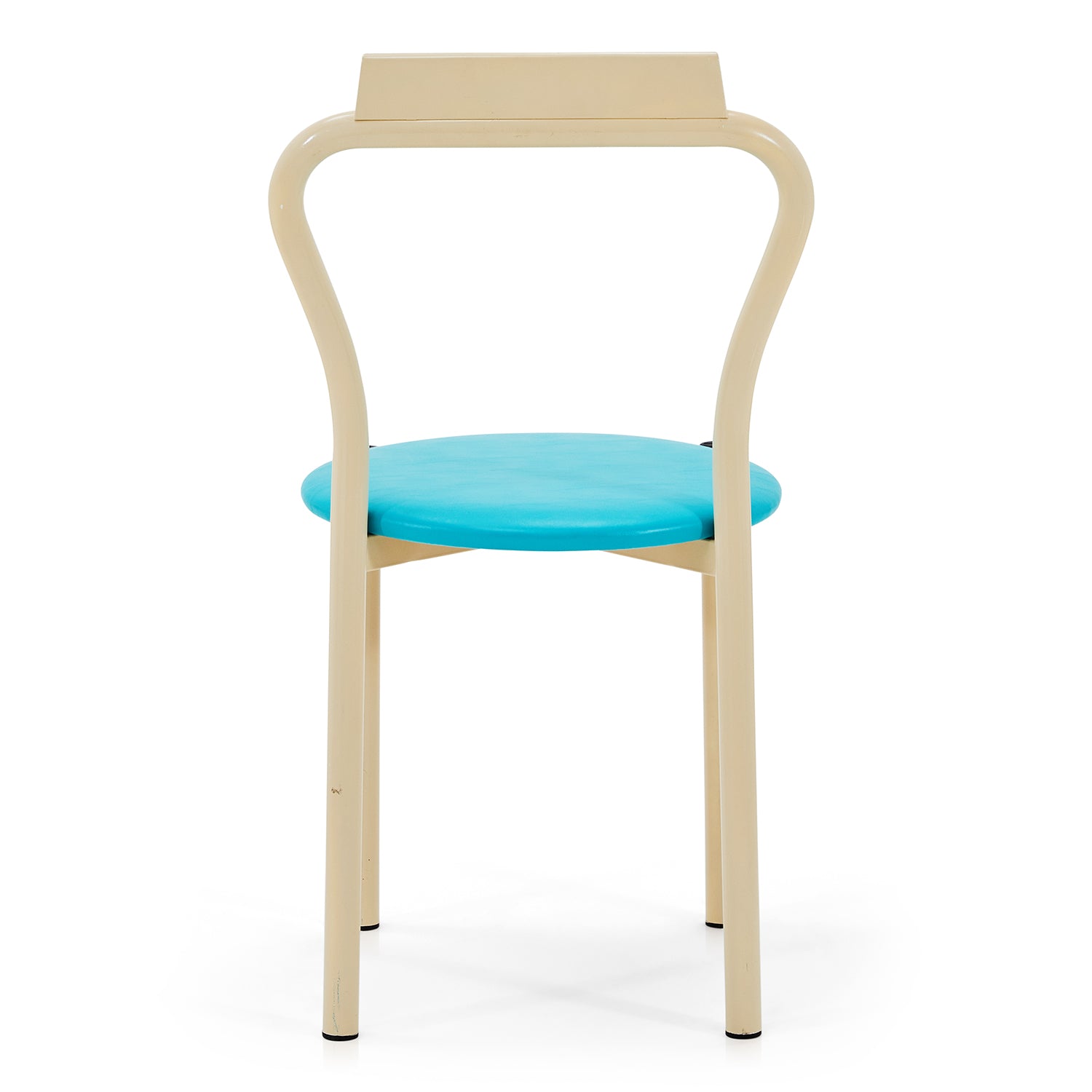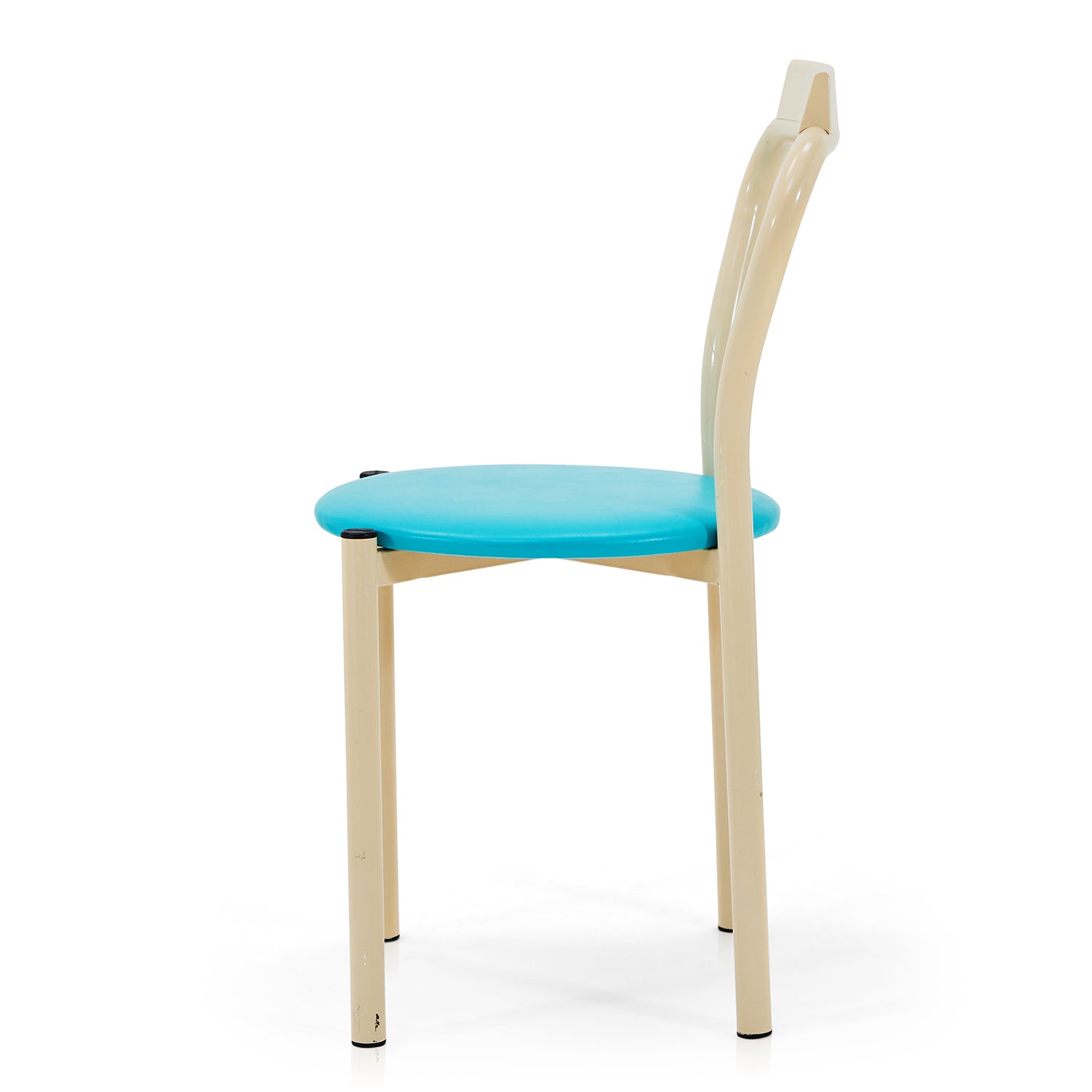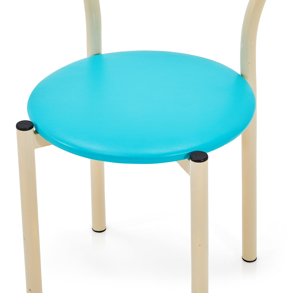 Details: Dining chair with white metal frame and blue circular seat cushion Dimensions: 32.5" H x 15" W x 15" D Quantity: 1