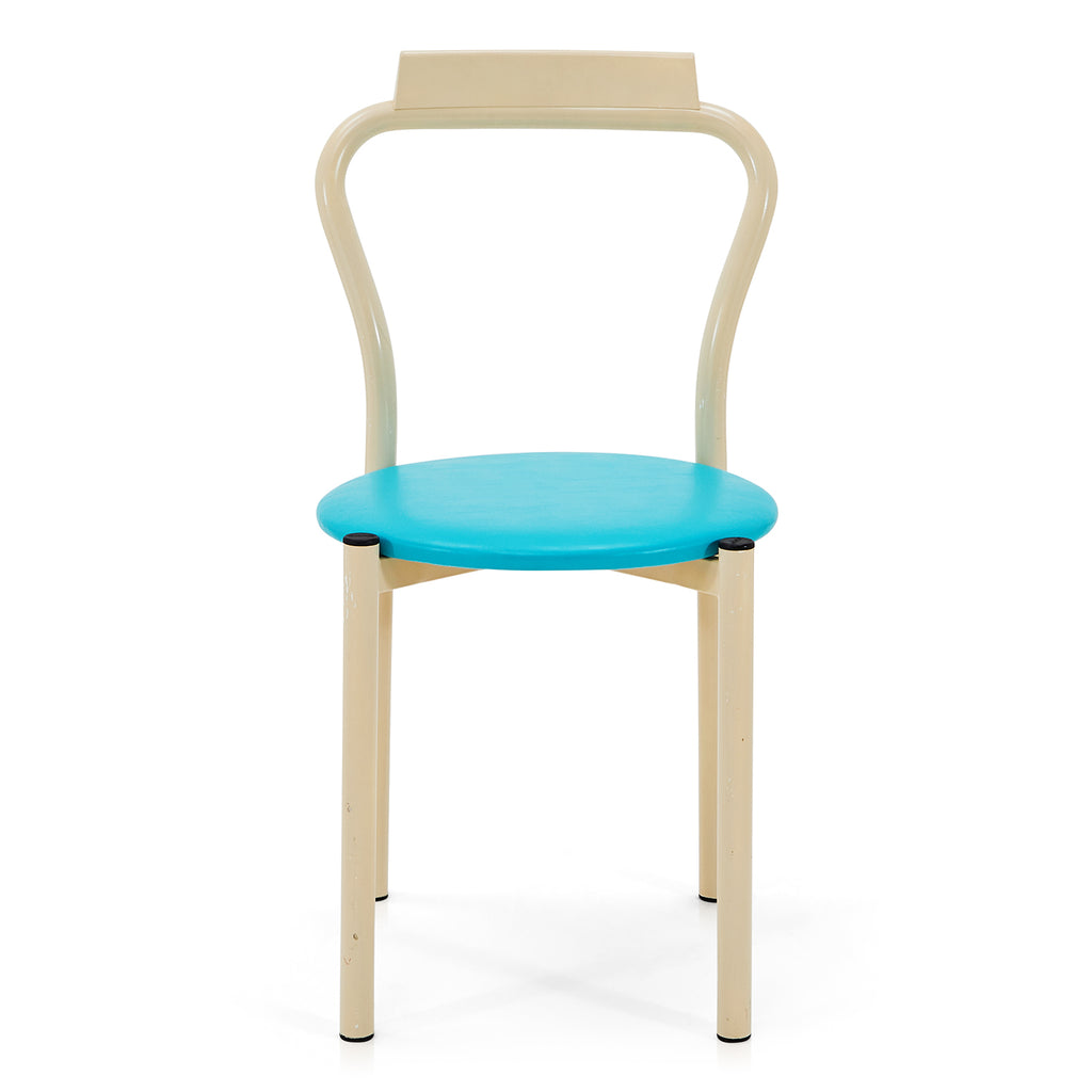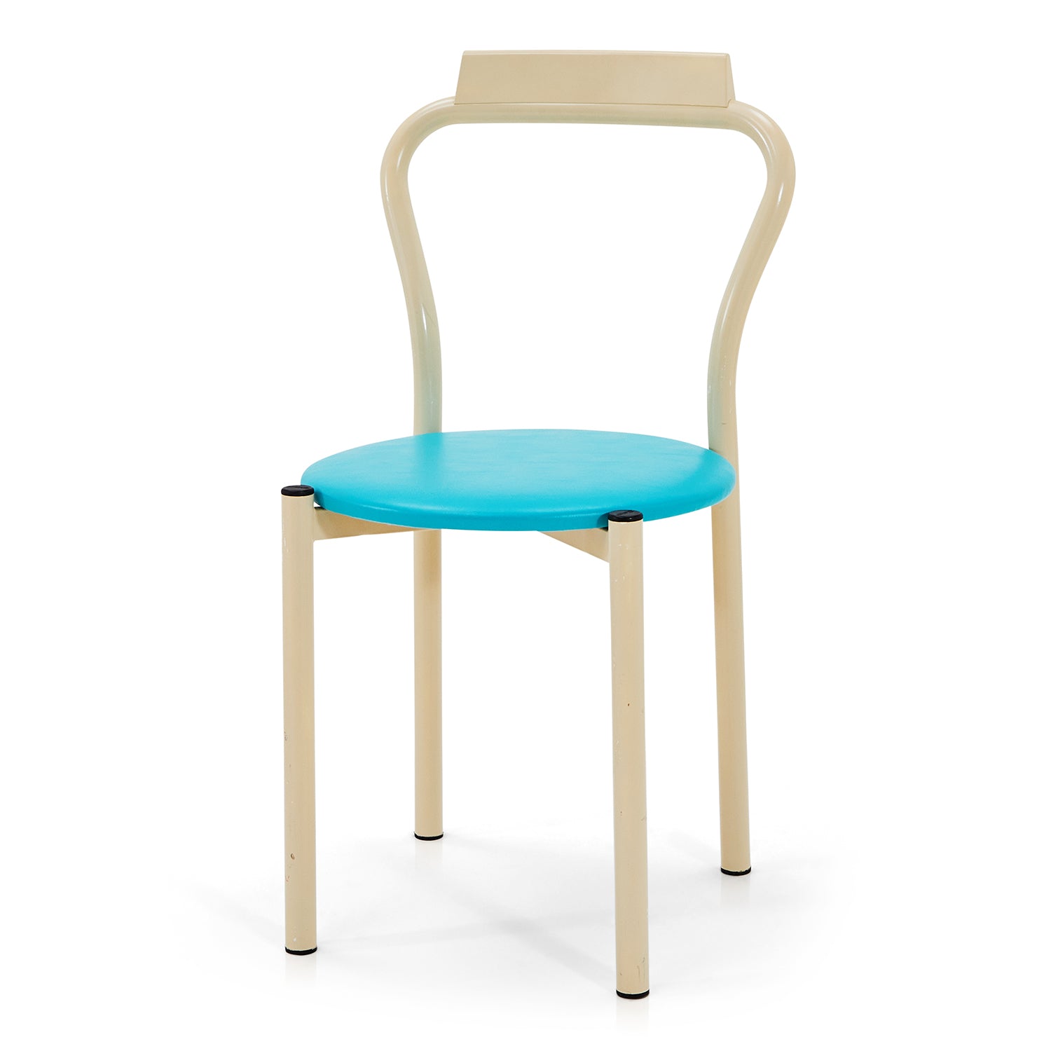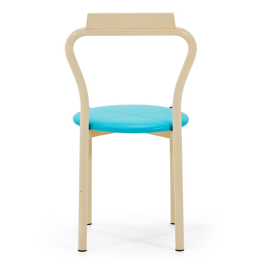 Details: Dining chair with white metal frame and blue circular seat cushion Dimensions: 32.5" H x 15" W x 15" D Quantity: 1