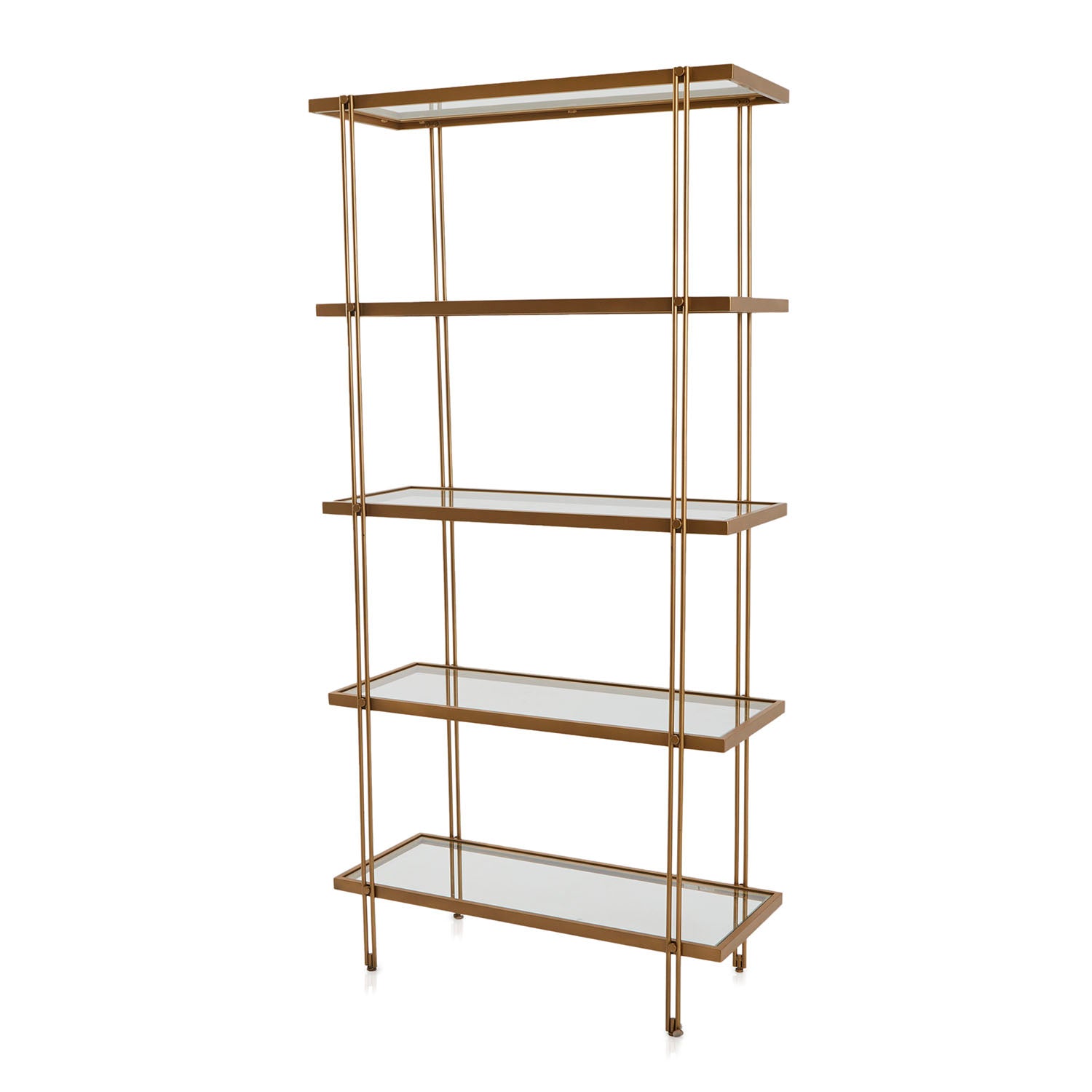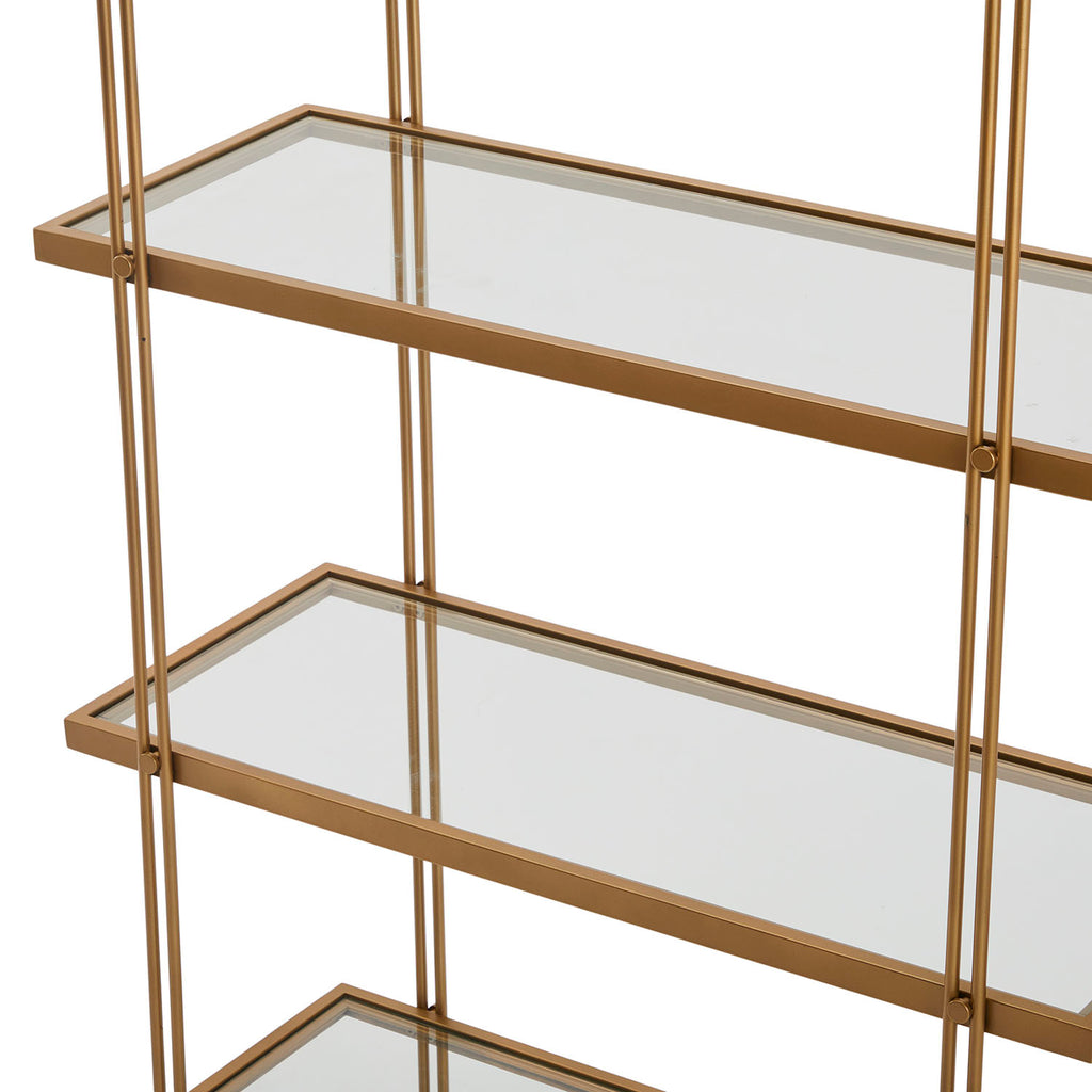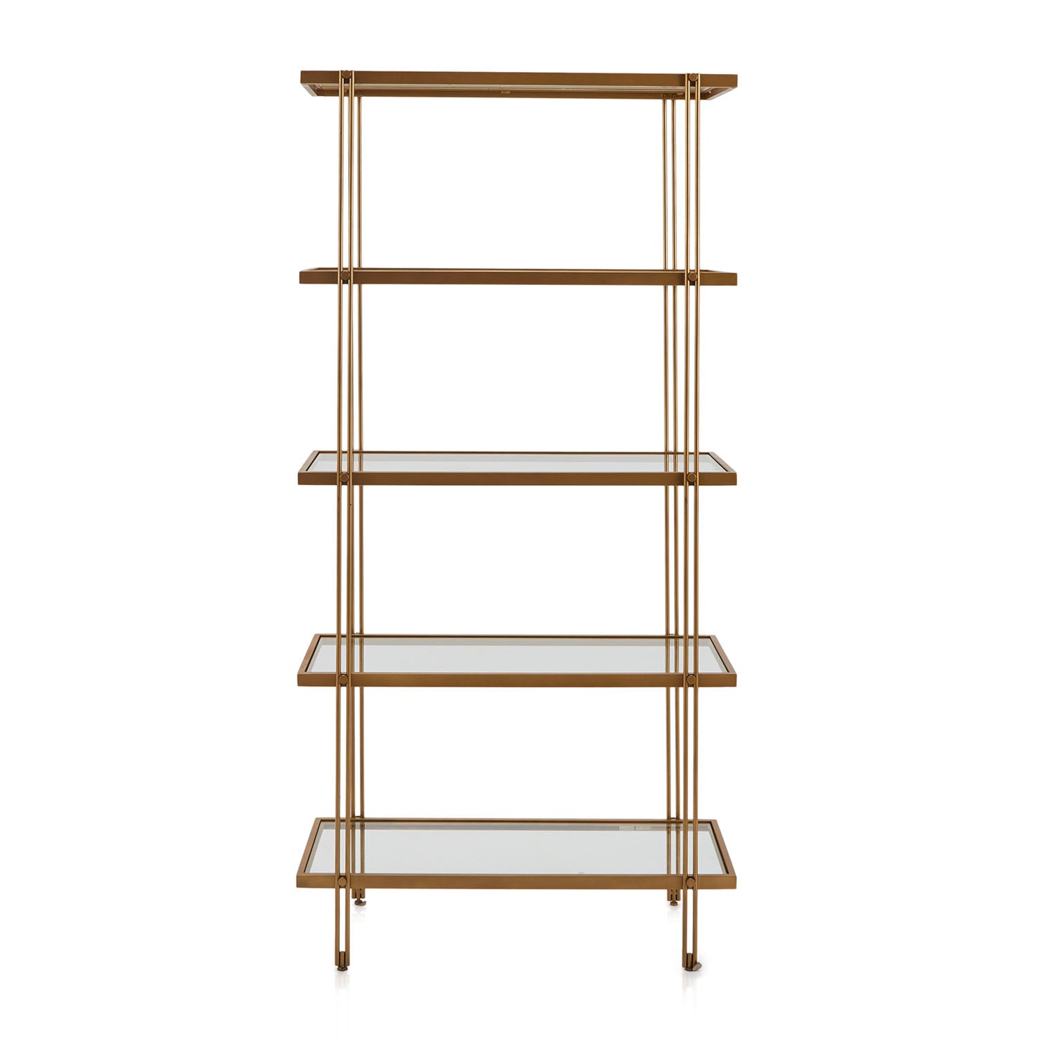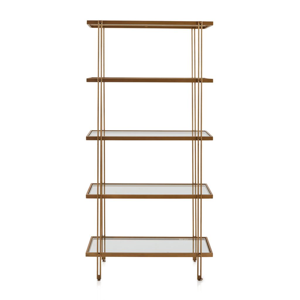 Details: Gold frame shelf unit with 5 glass shelves Dimensions: 67" H x 33" W x 13" D Quantity: 1