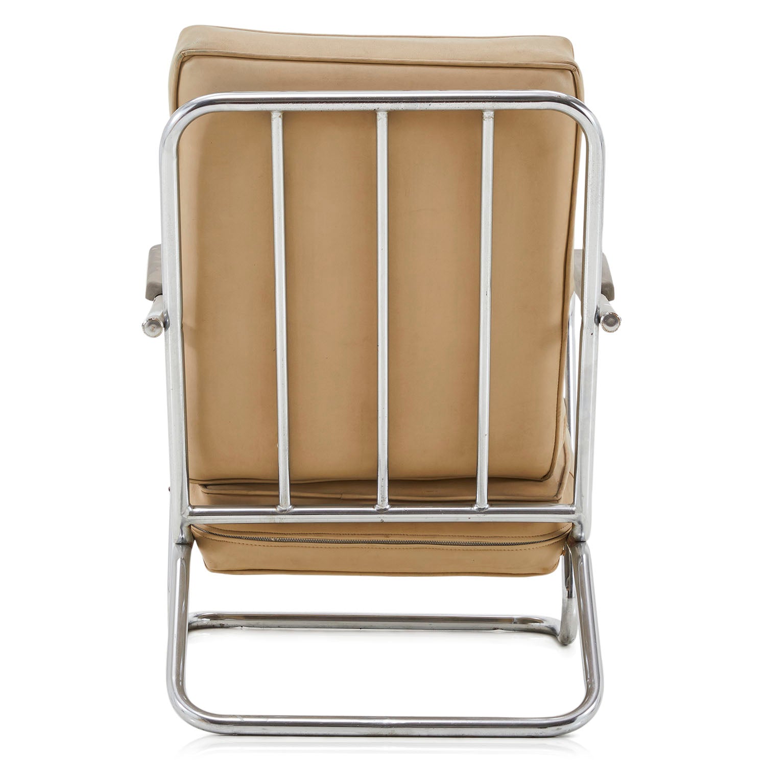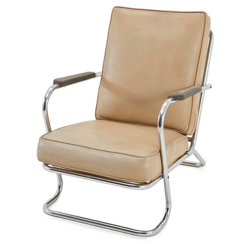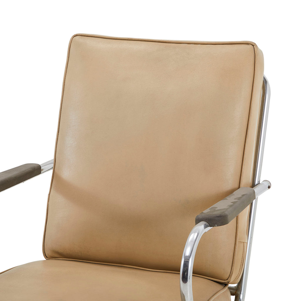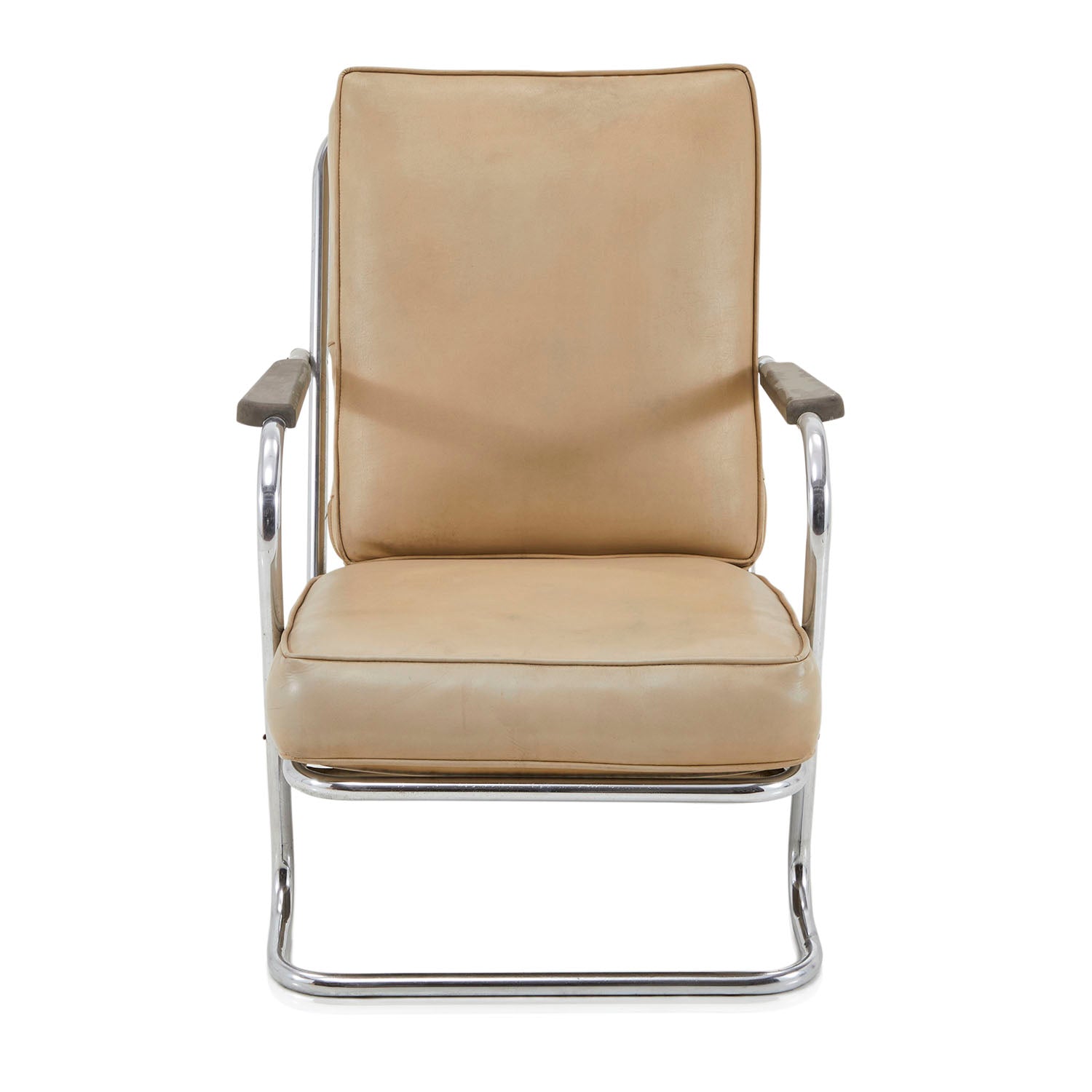 Details: Tan leather armchair with chrome frame and plastic armrests Dimensions: 35" H x 26" W x 32" D Quantity: 1