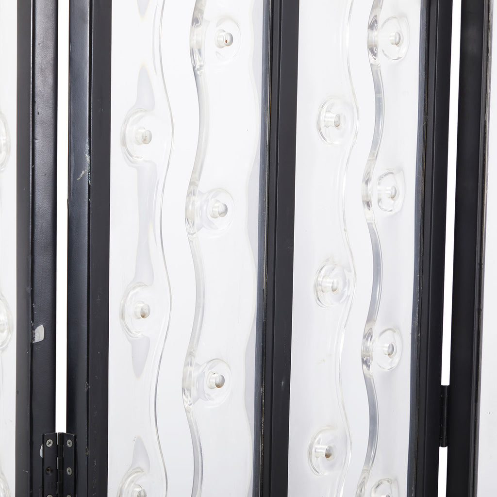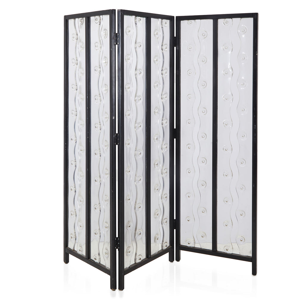 Details: Three-panel glass patterned screen divider with metal frame Dimensions: 72" H x 72.5" W x 1.5" D Quantity: 1