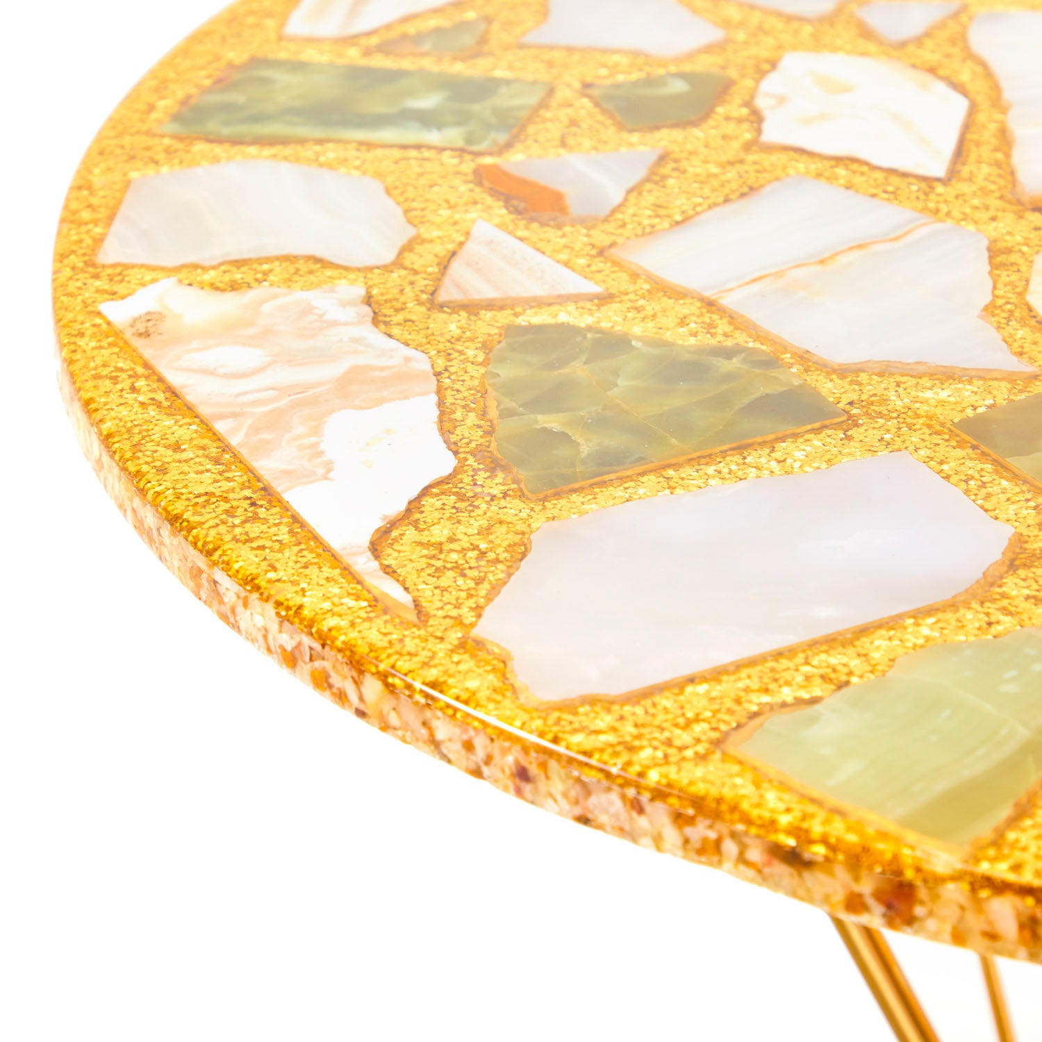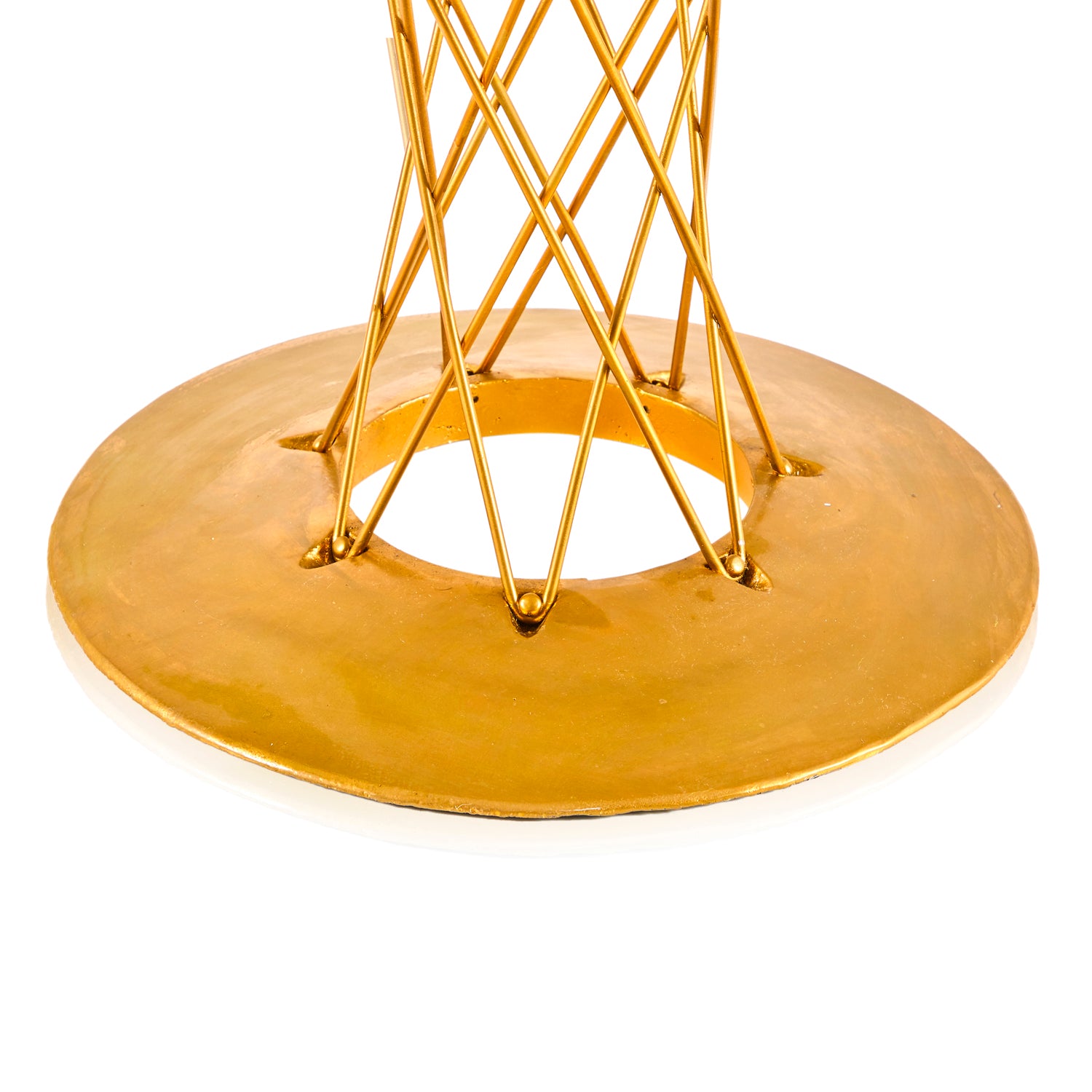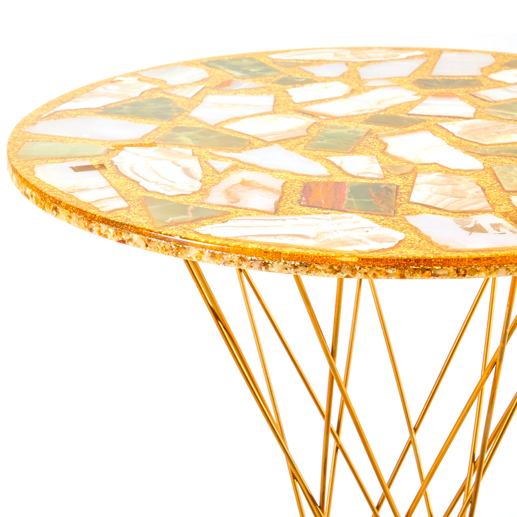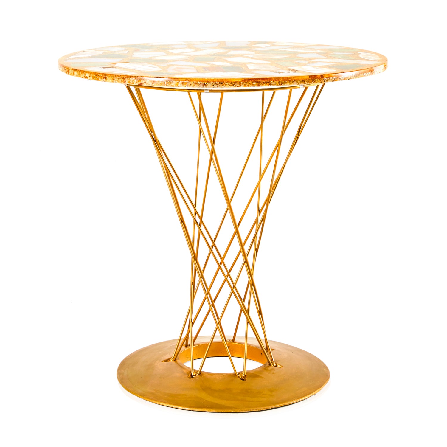 Details: Bar table with stone encased in metallic resin and gold woven wire stand Dimensions: 29" H x 30" W x 30" D Quantity: 1