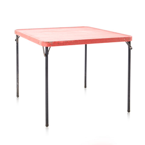 Details: Folding table with light speckled red vinyl top and black metal legs Dimensions: 28" H x 32" W x 32" D Quantity: 1