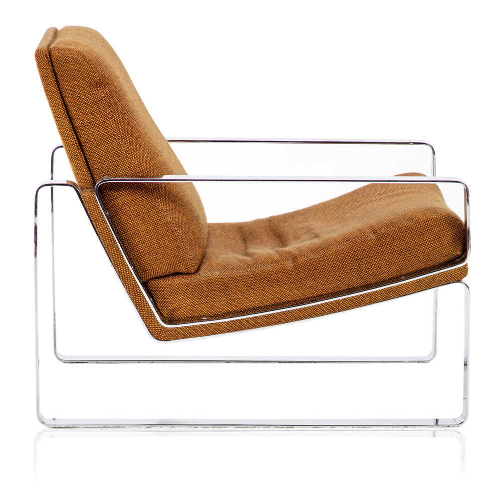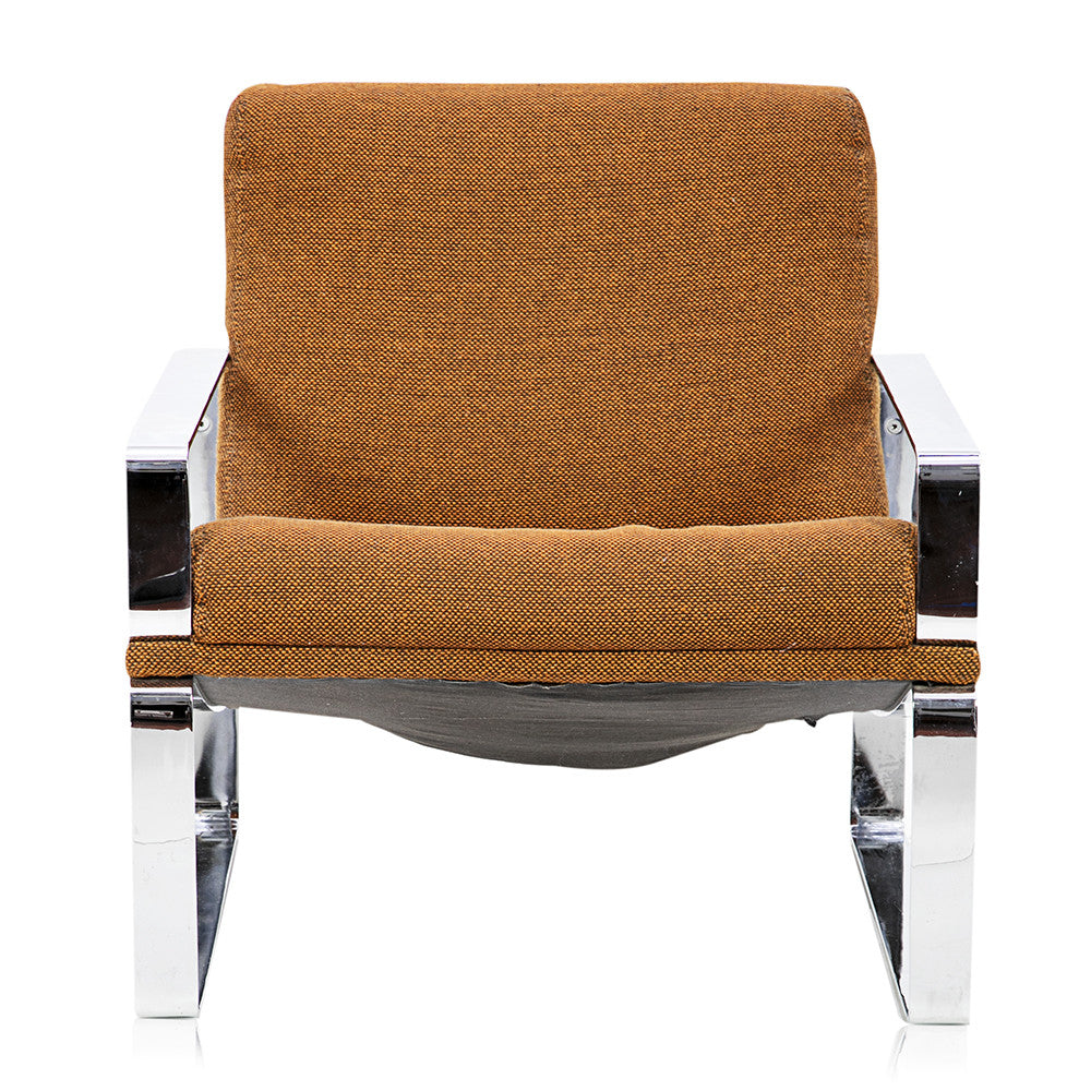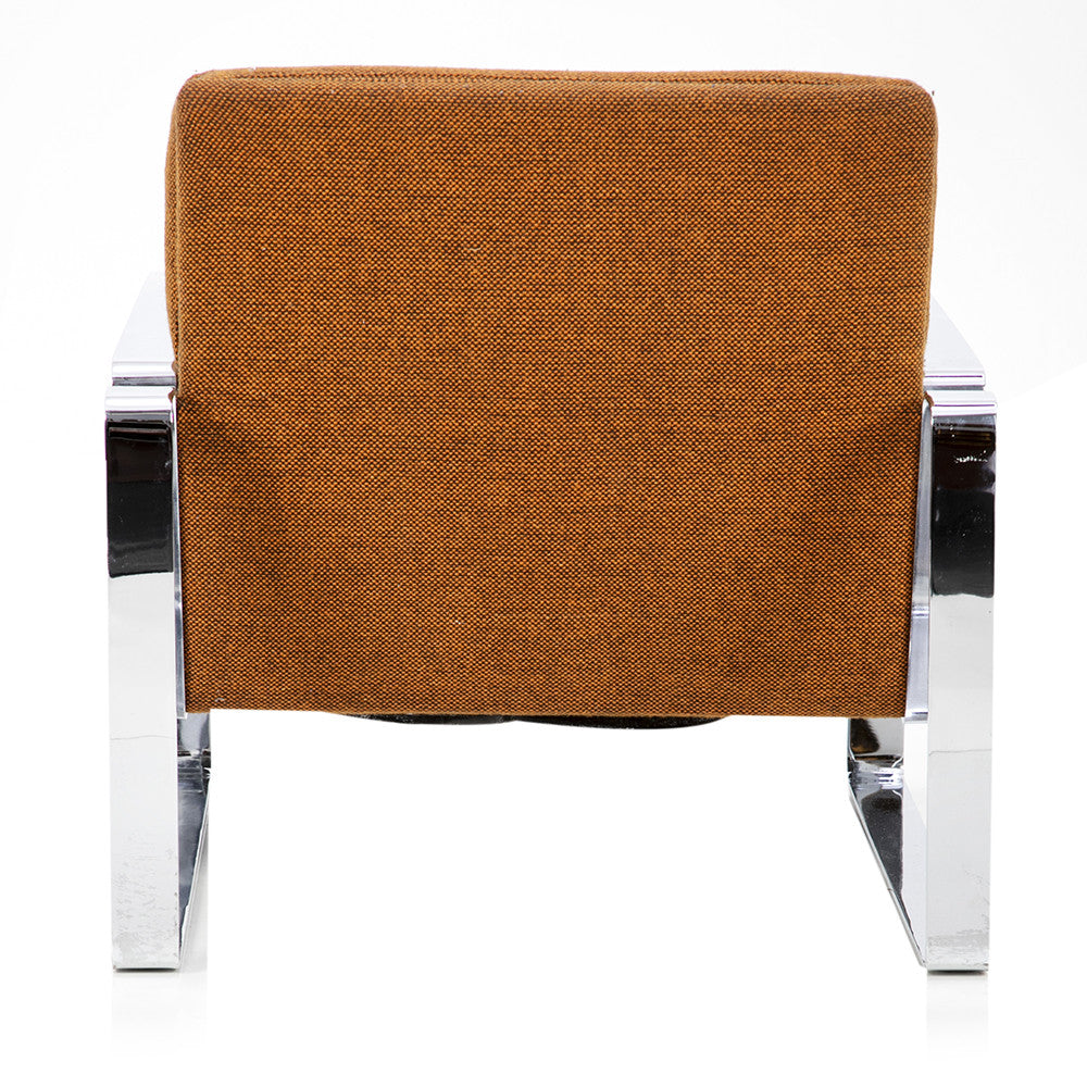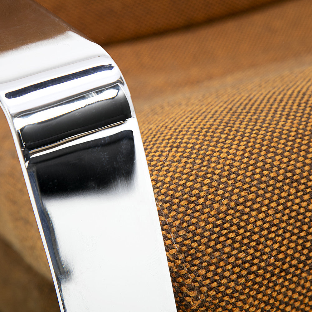 Details: Tan armchair with chrome frame and tweed brown fabric cushions Dimensions: 27" H x 26" W x 32" D Quantity: 2