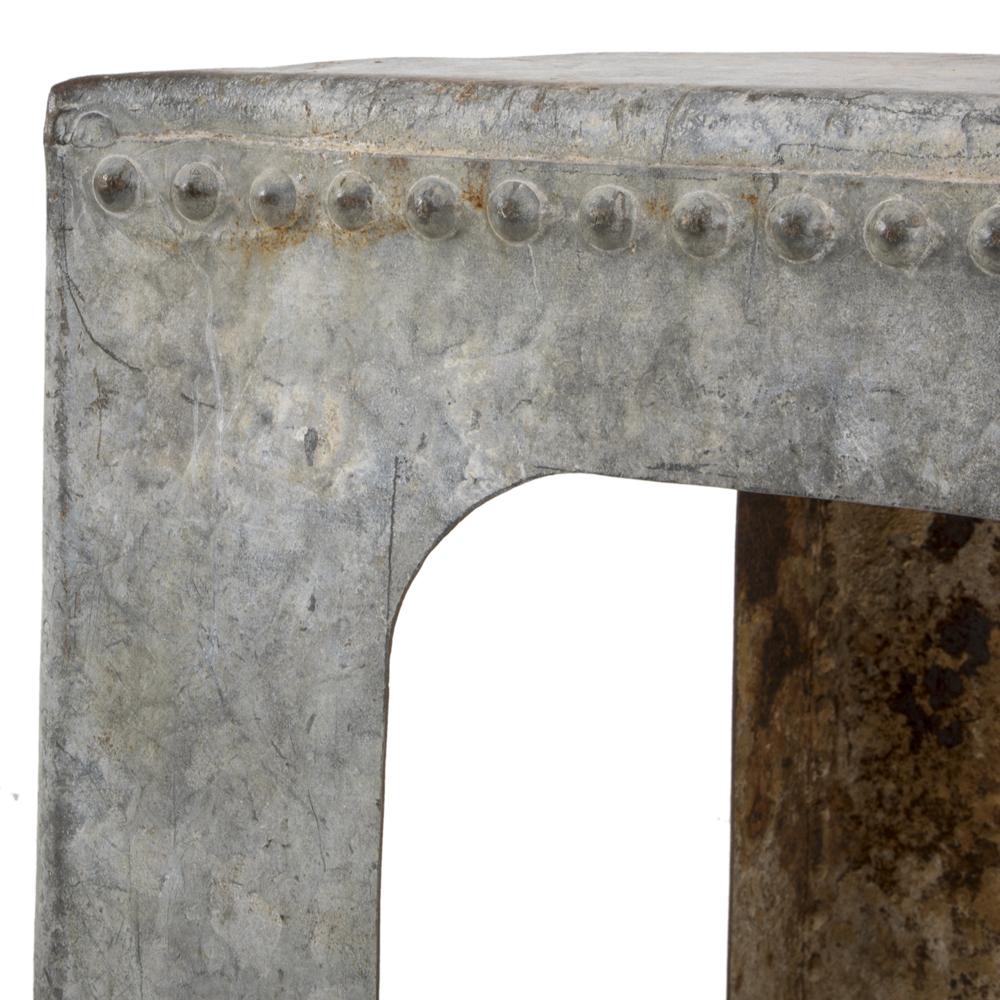 Details: Distressed metal industrial curved console table Dimensions: 30" H x 60" W x 18" D