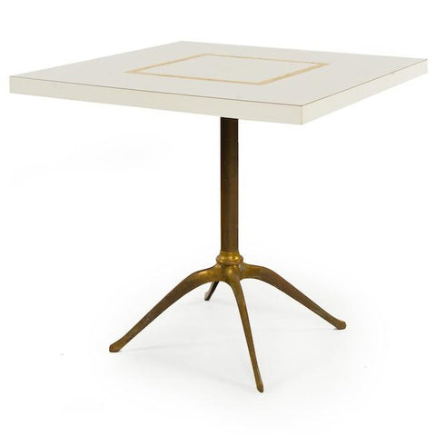 Details: Square top dining table with gold accent and brass legDimensions: 30.5" H x 32" W x 32" D $225 table alone, w/ chairs $675...
