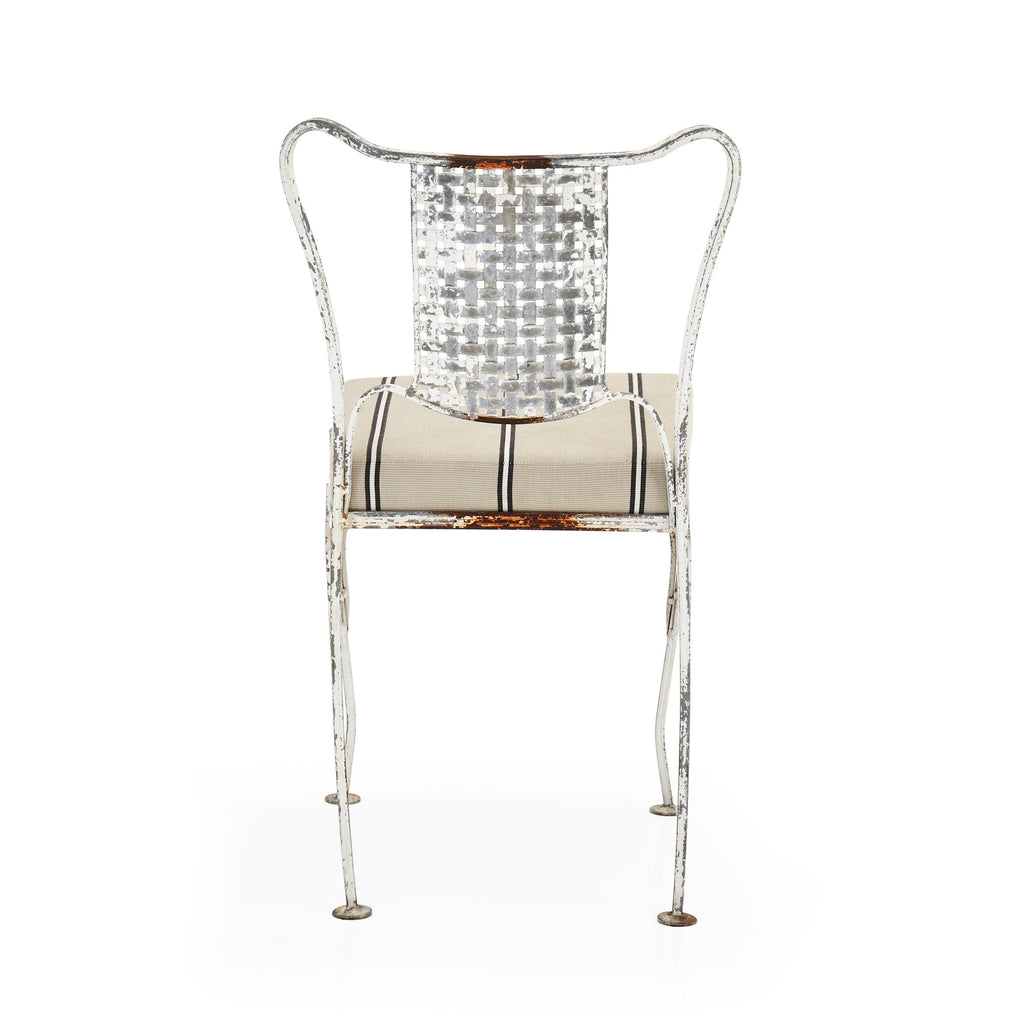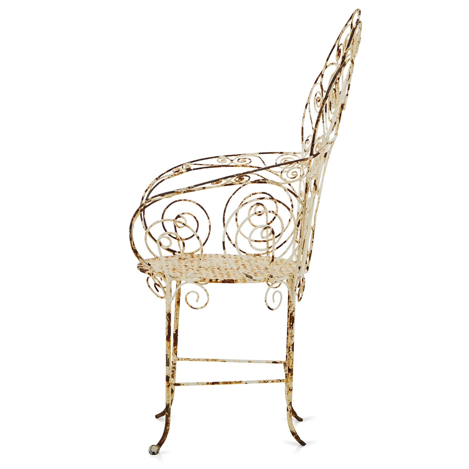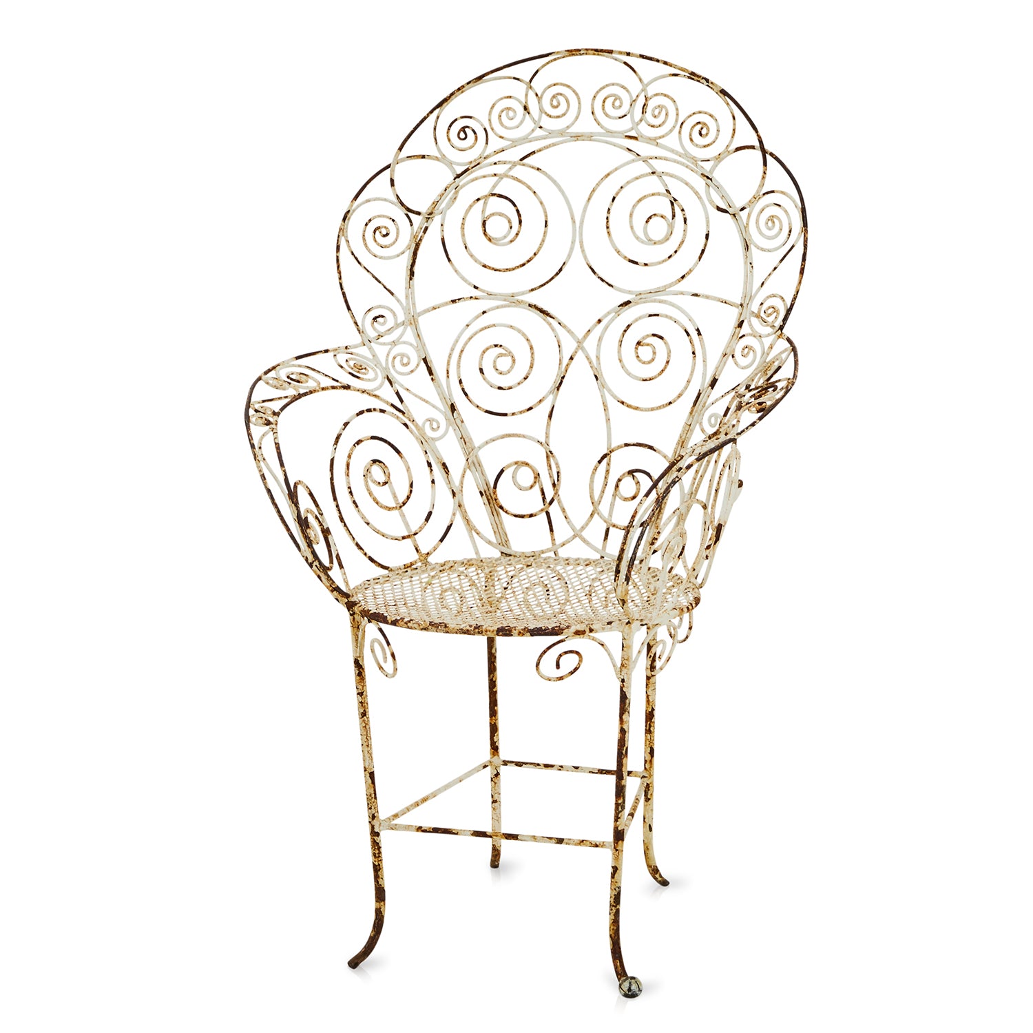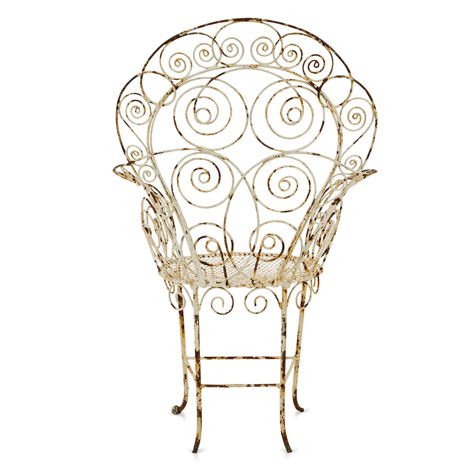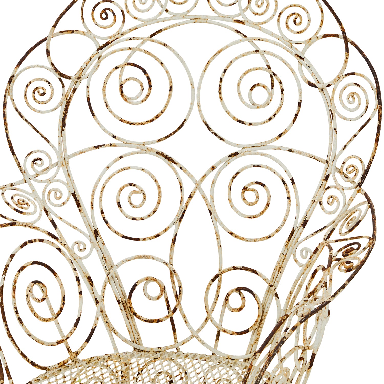 Details: White metal garden arm chair with an ostentatious peacock-like swirly design of the back and arms, with significant chipped paint and rust Dimensions: 41" H x...