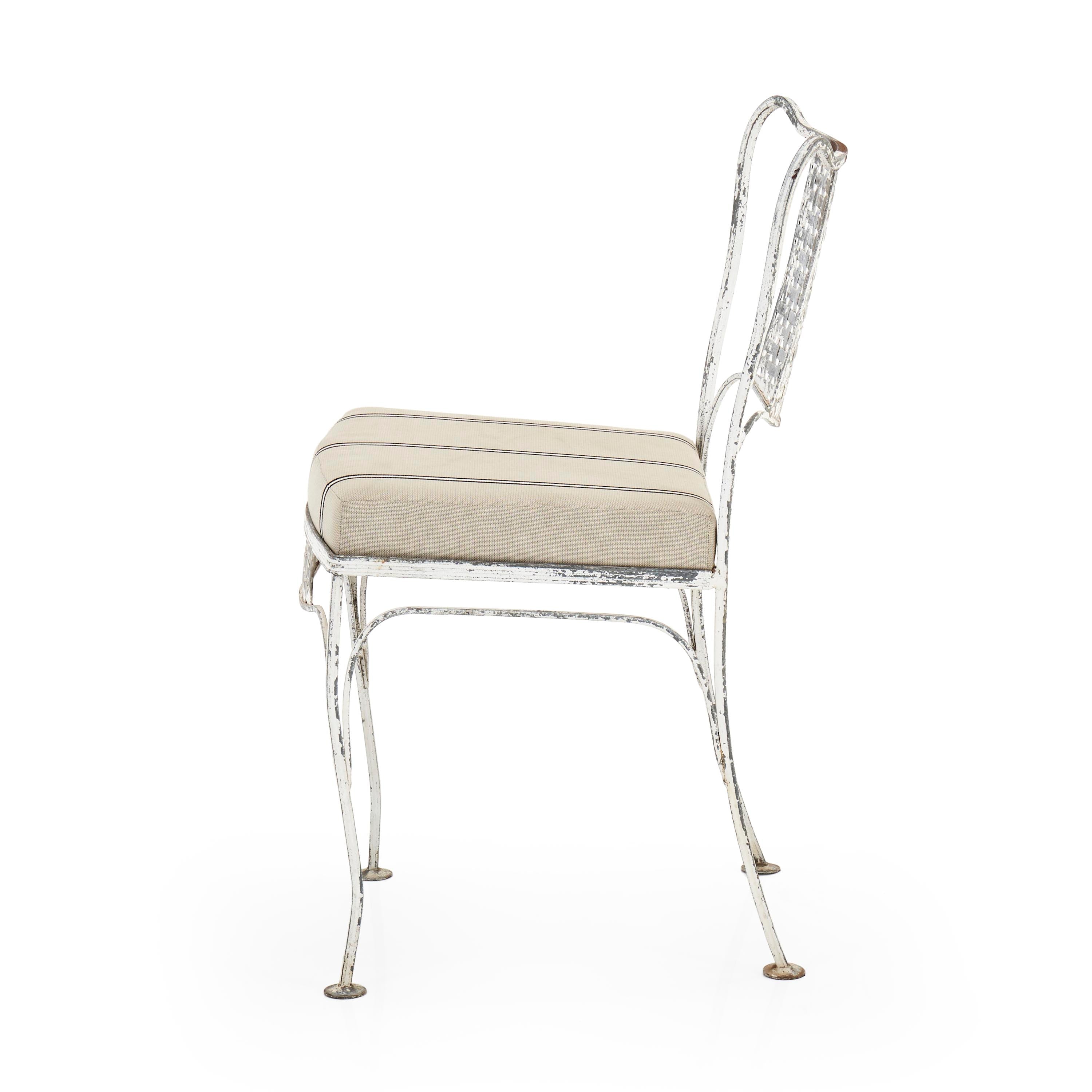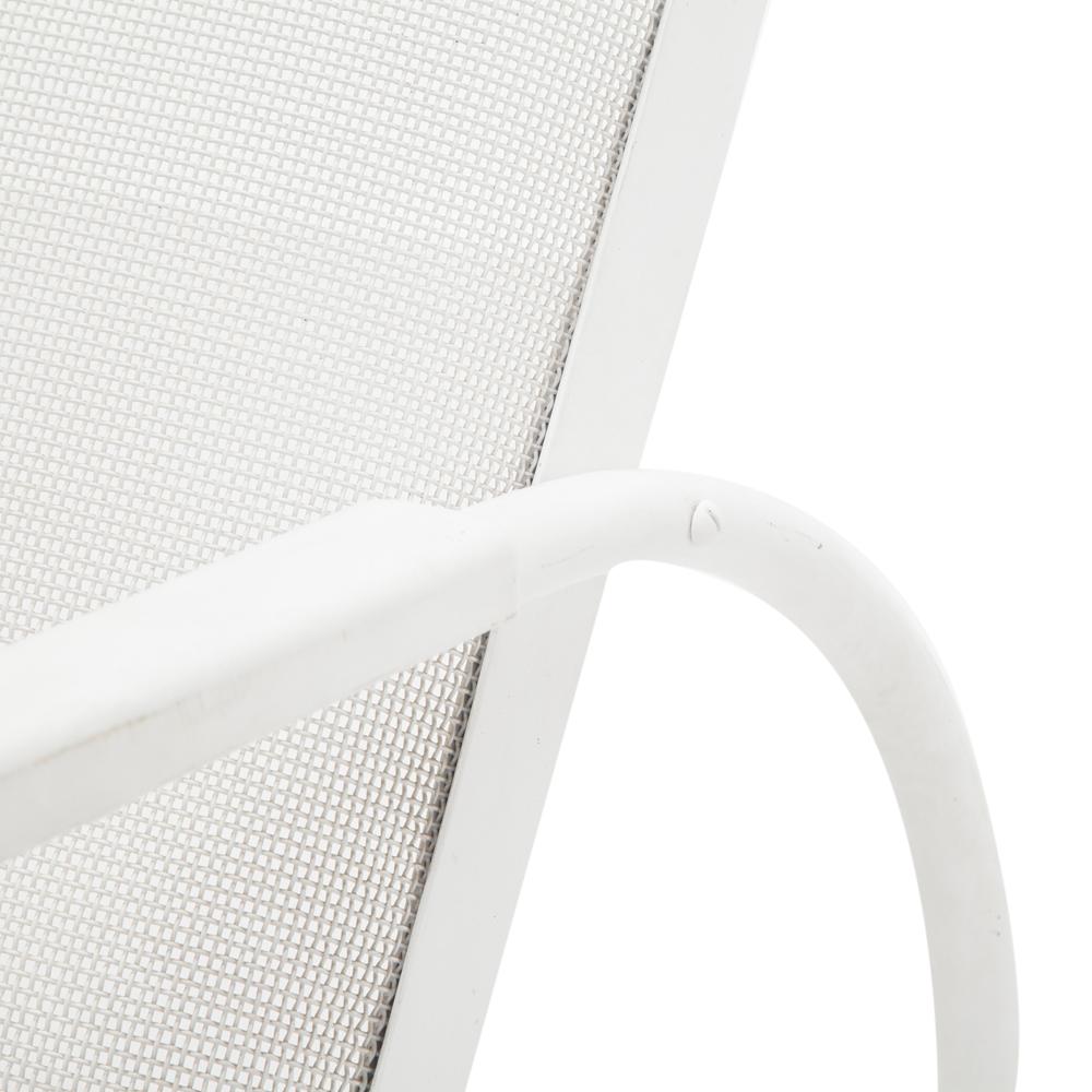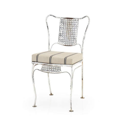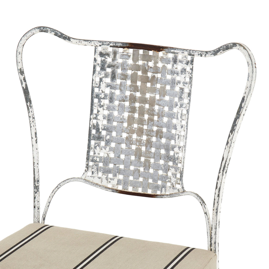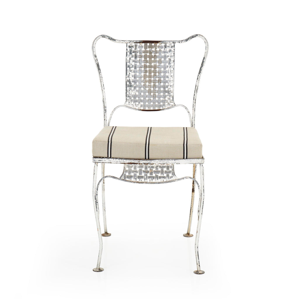 Details: White metal garden arm chair with an ostentatious peacock-like swirly design of the back and arms, with significant chipped paint and rust Dimensions: 41" H x...