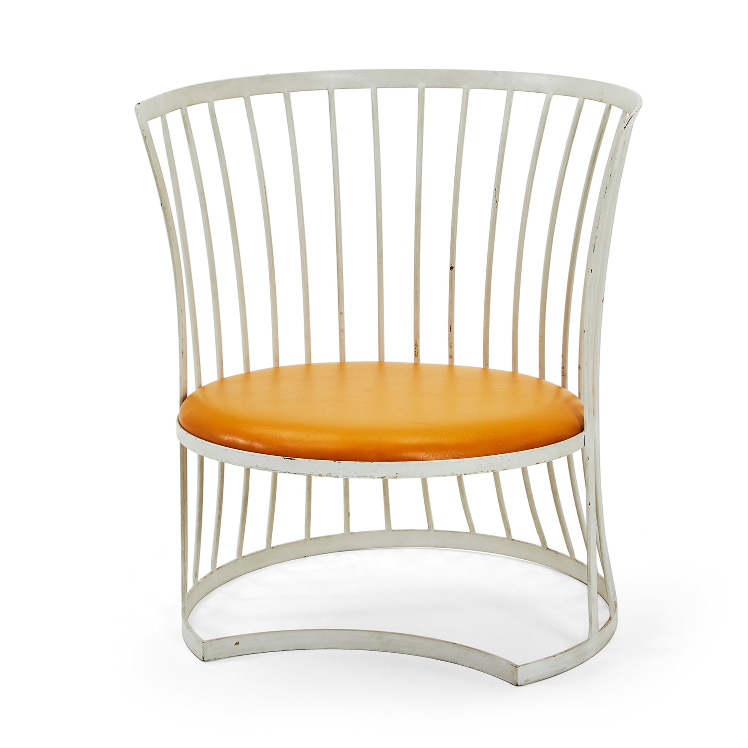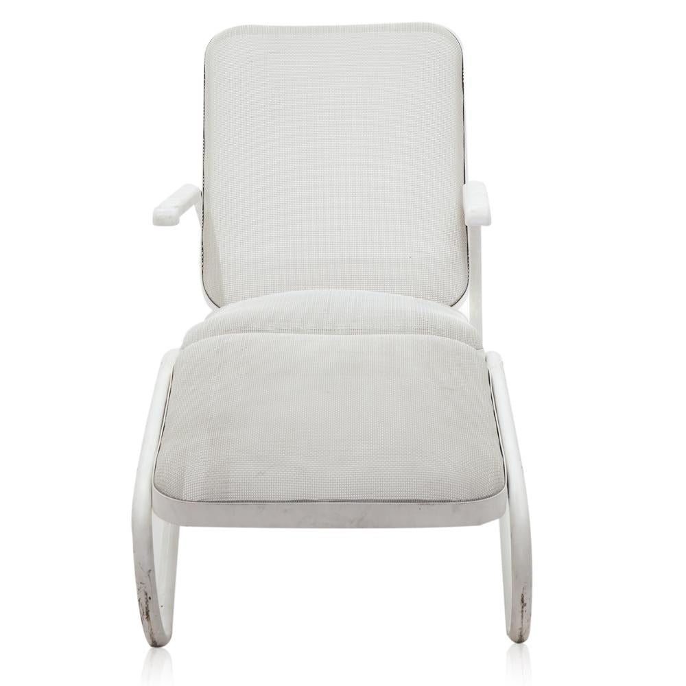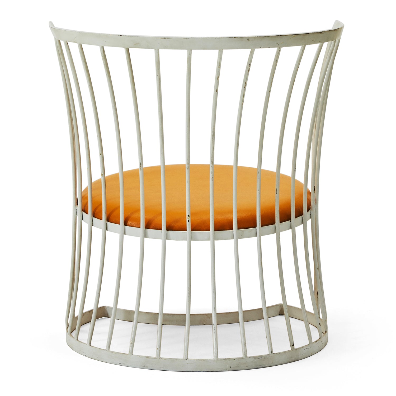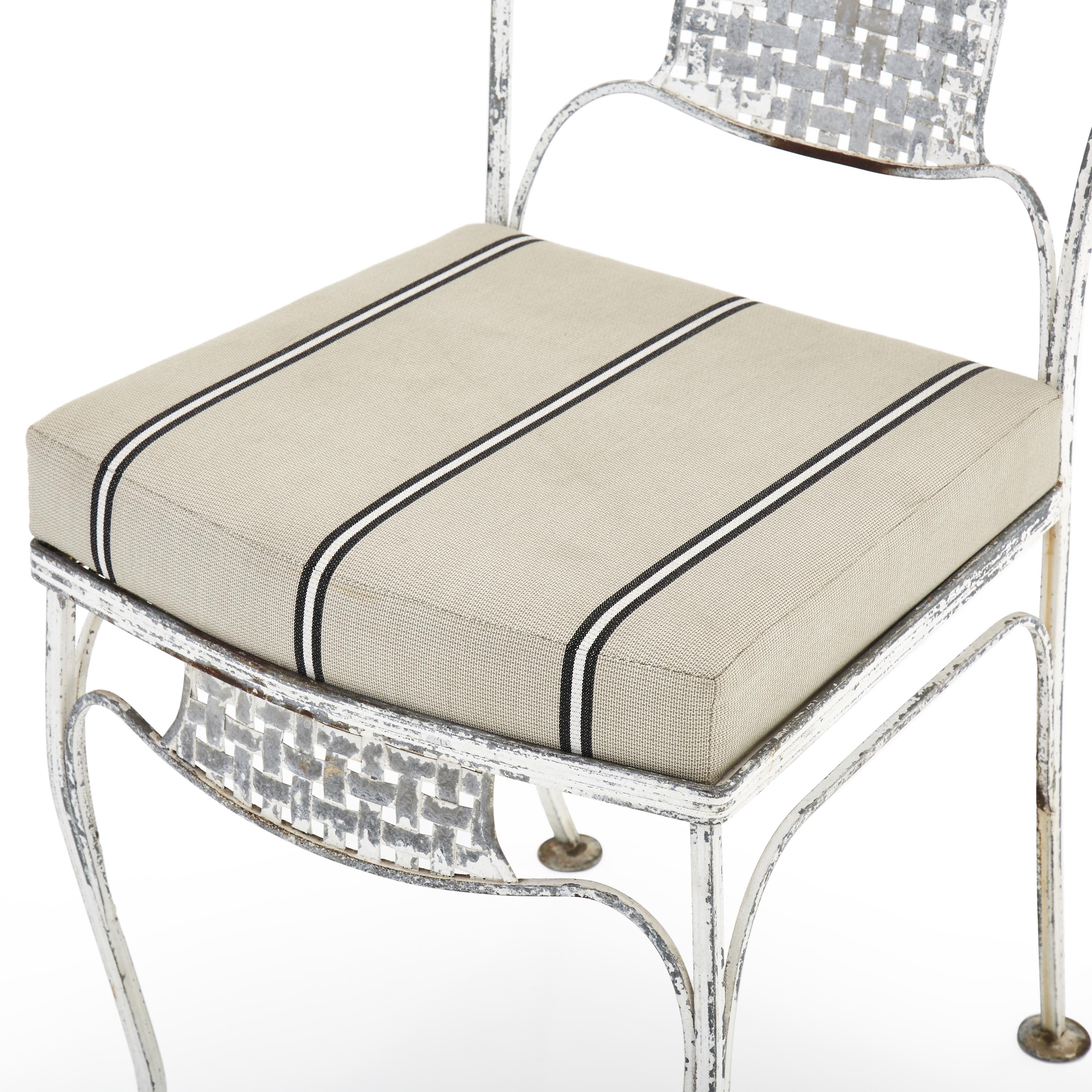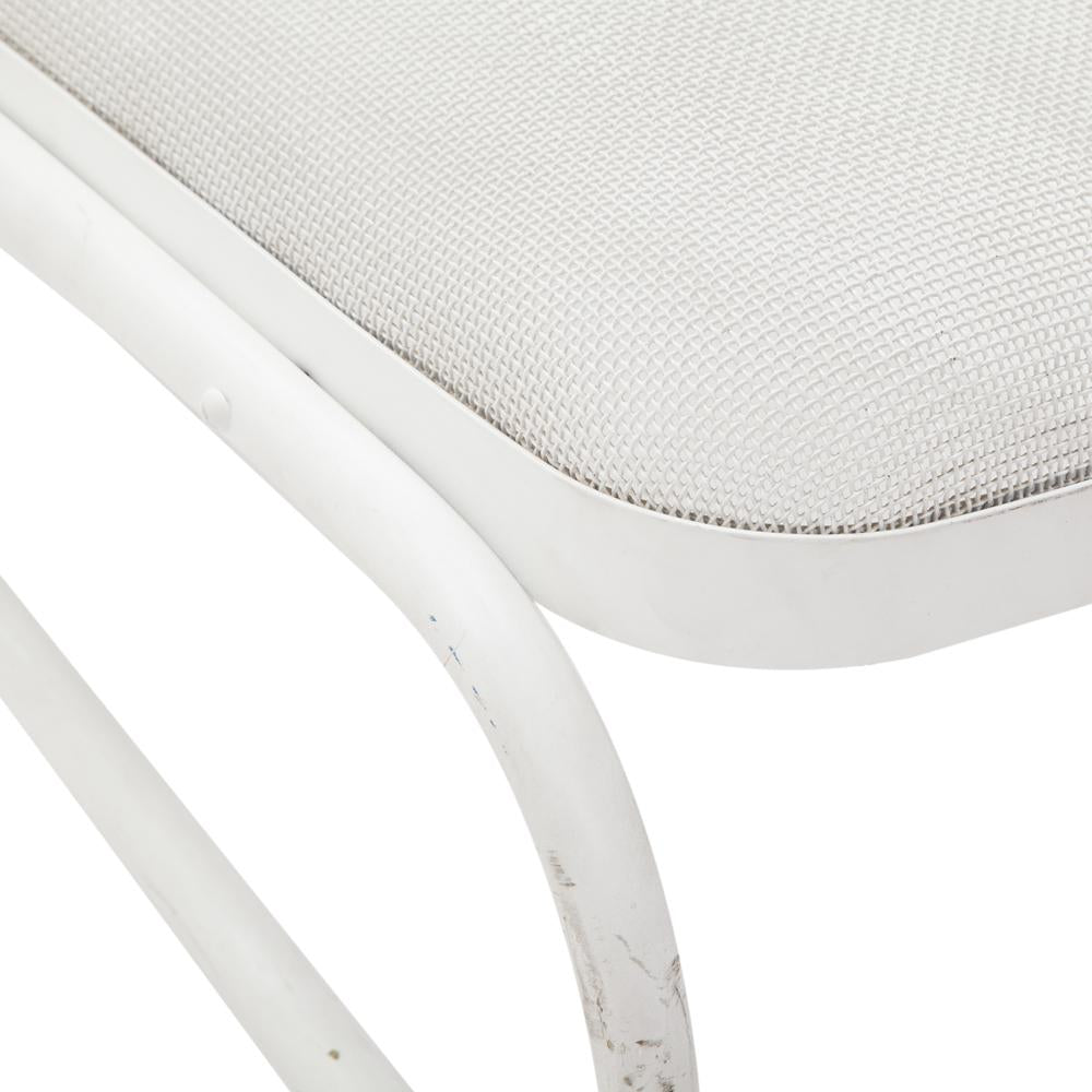 Details: White metal garden arm chair with an ostentatious peacock-like swirly design of the back and arms, with significant chipped paint and rust Dimensions: 41" H x...