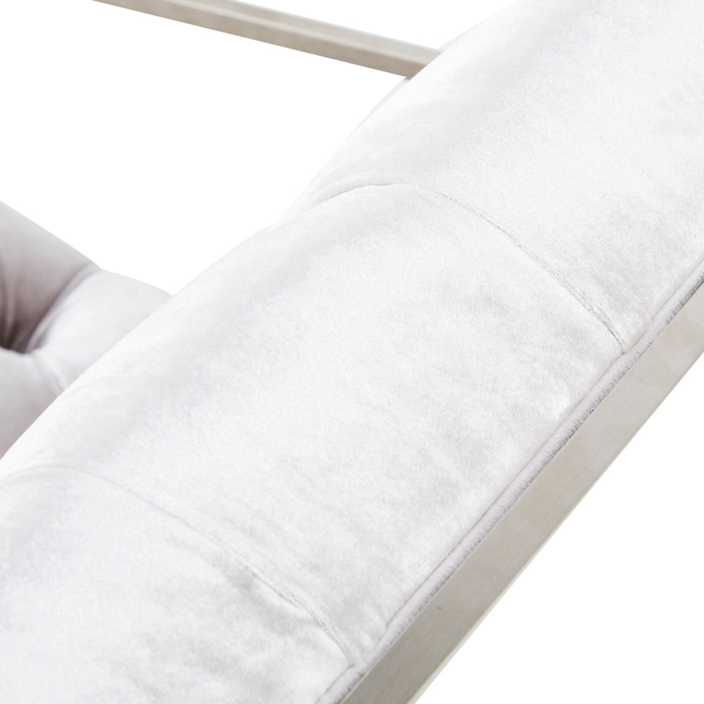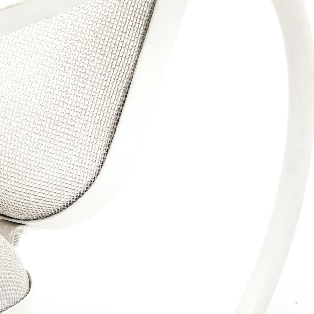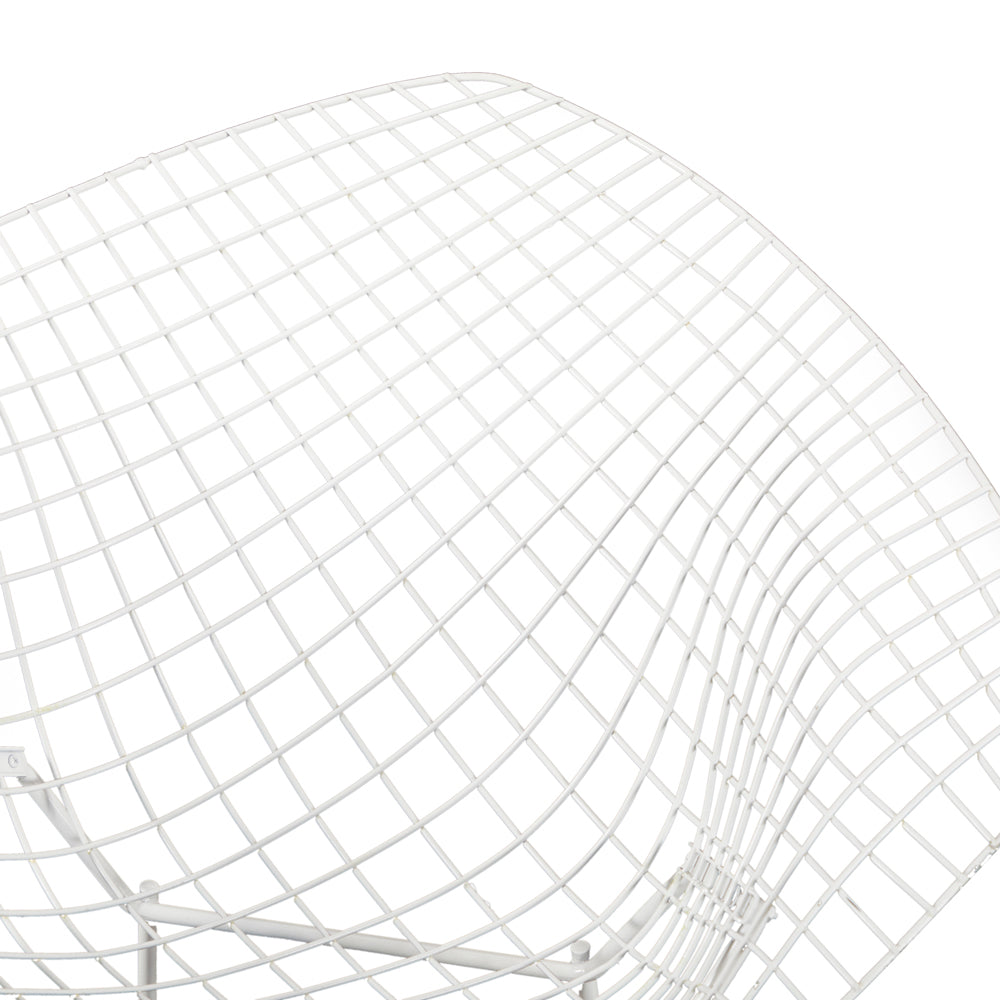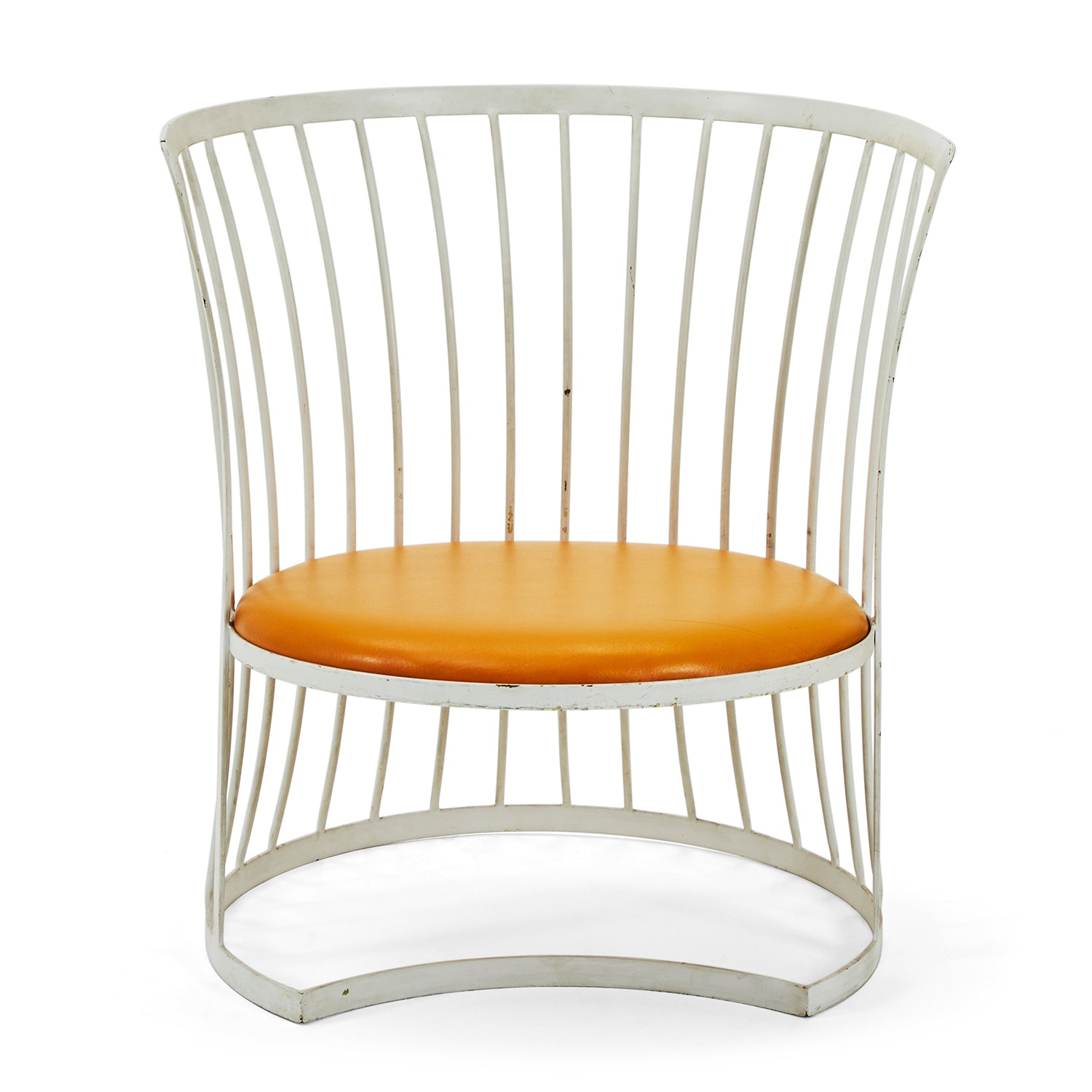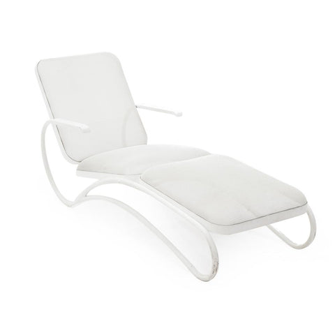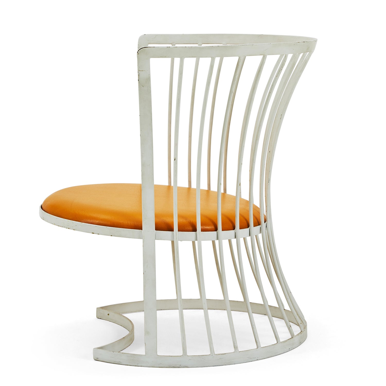Details: White metal garden arm chair with an ostentatious peacock-like swirly design of the back and arms, with significant chipped paint and rust Dimensions: 41" H x...