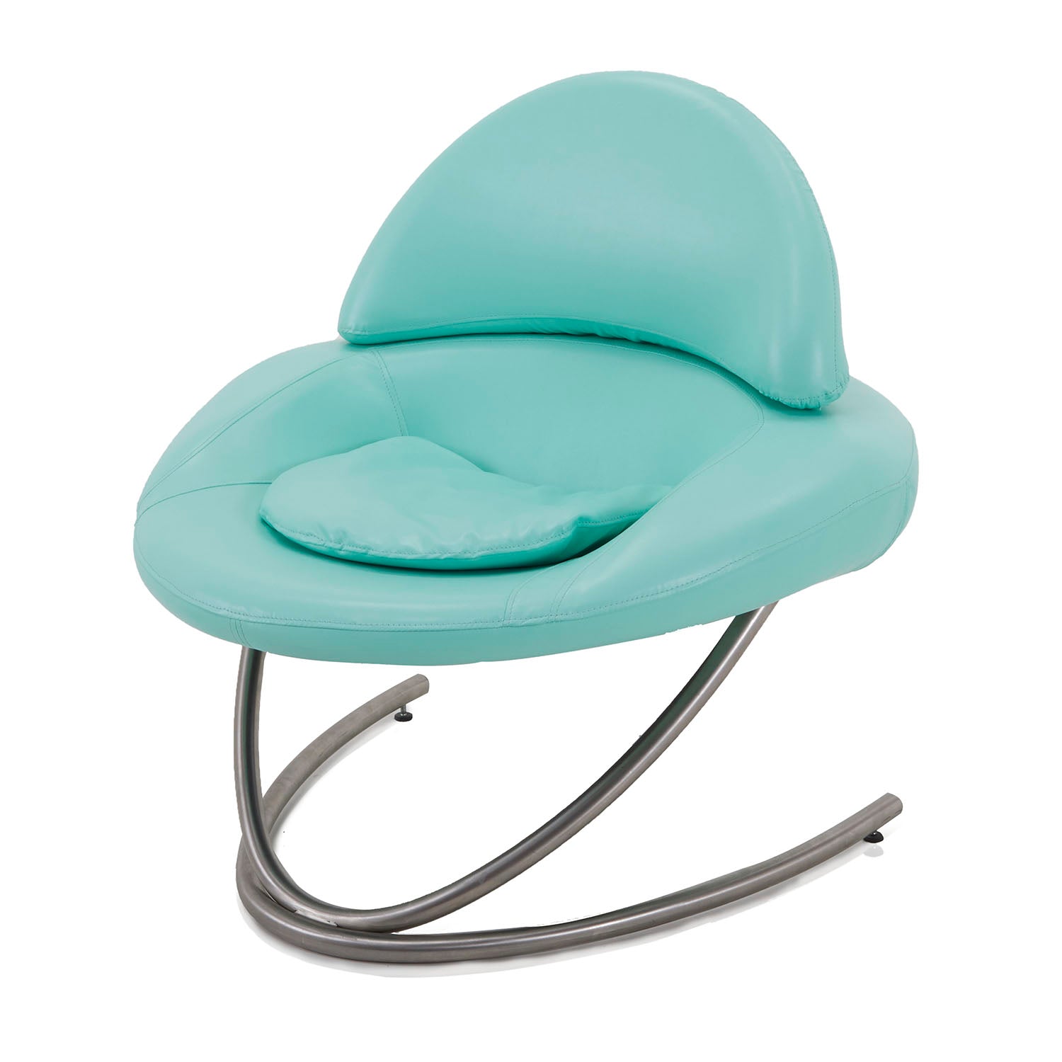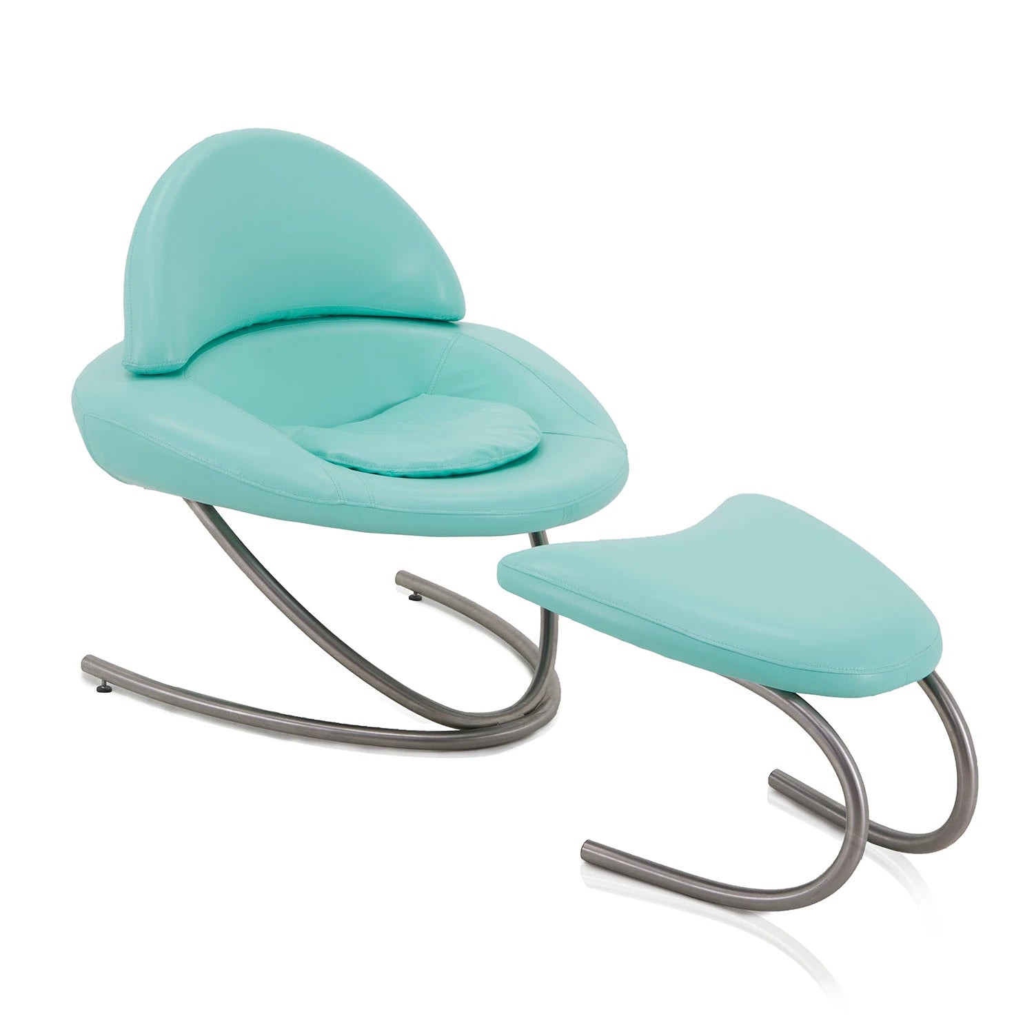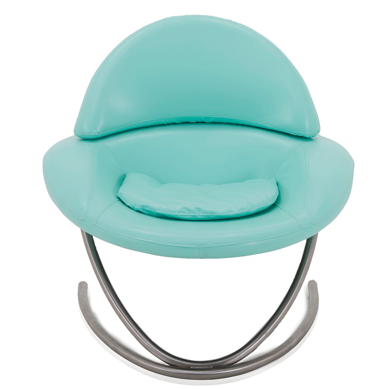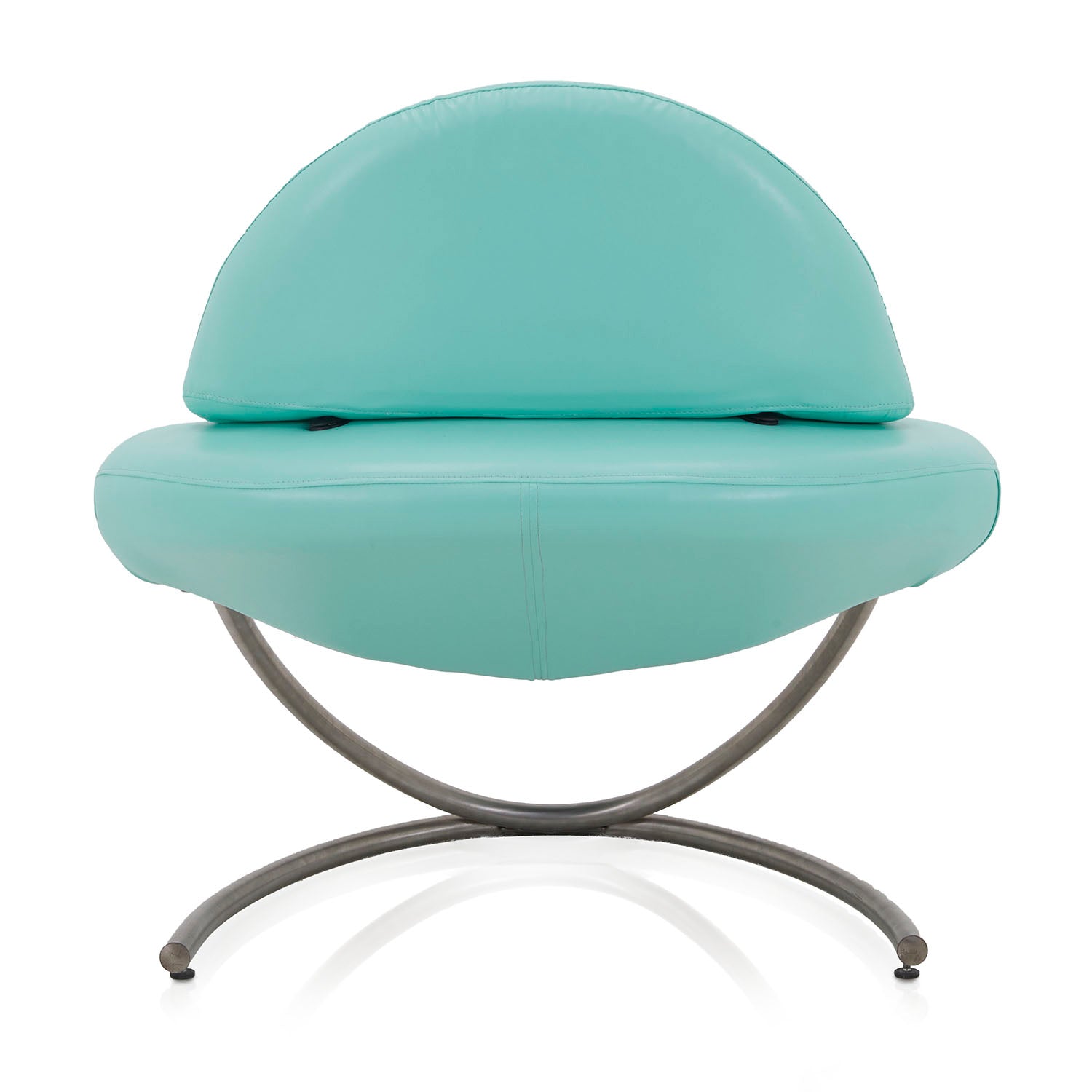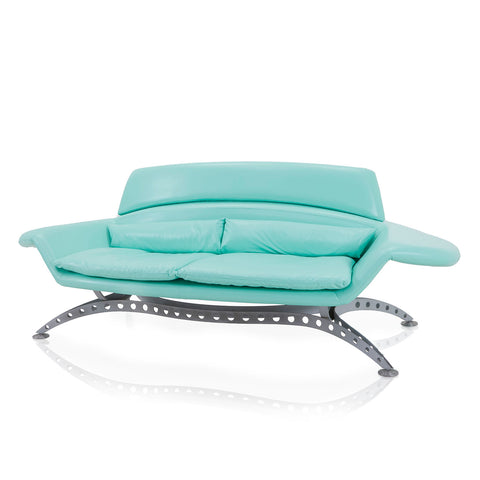 Details: Curved turquoise futuristic lounge chair with rounded grey metal base. Piece is constructed of leather upholstery, with polished metal legs. Dimensions: 36" H x 88"...