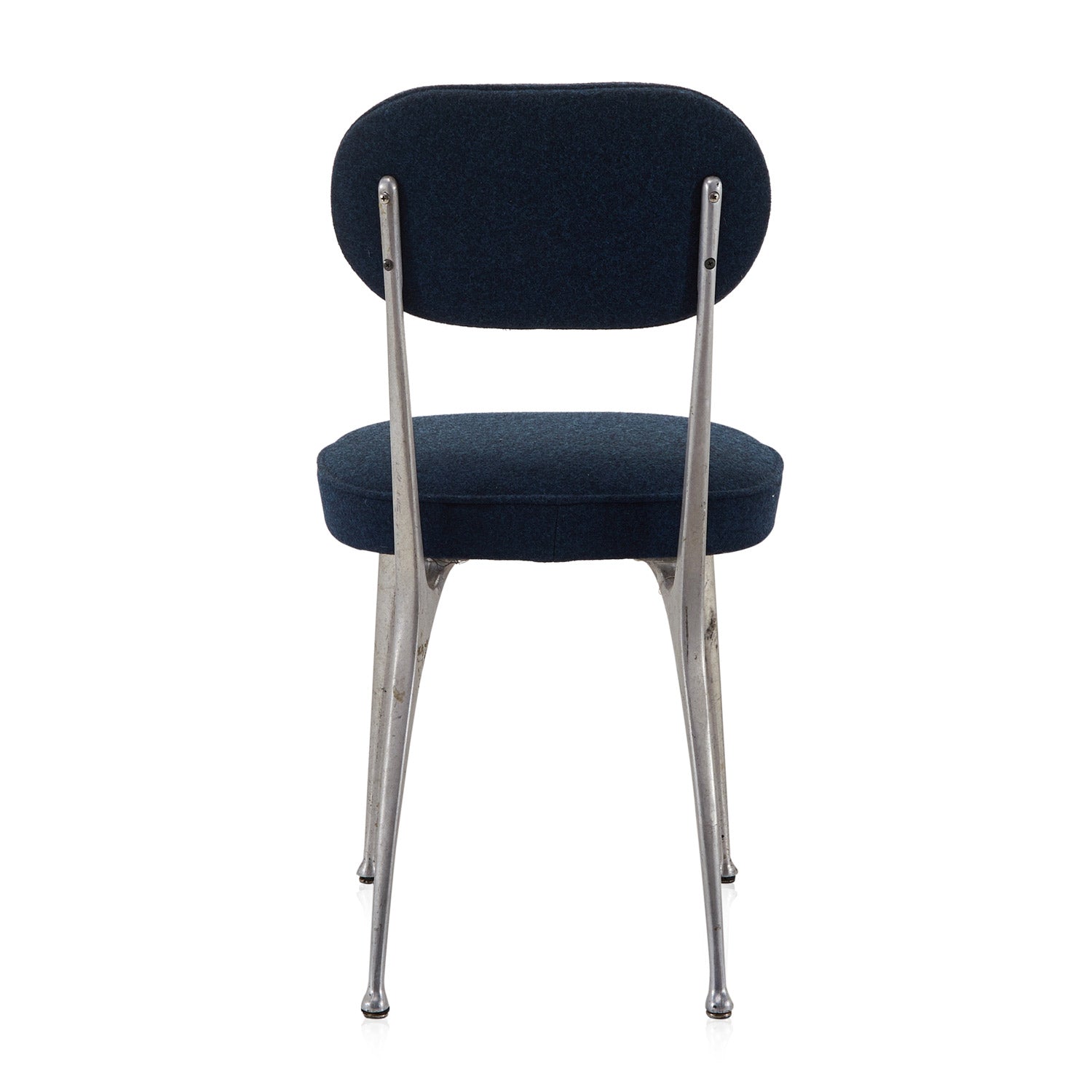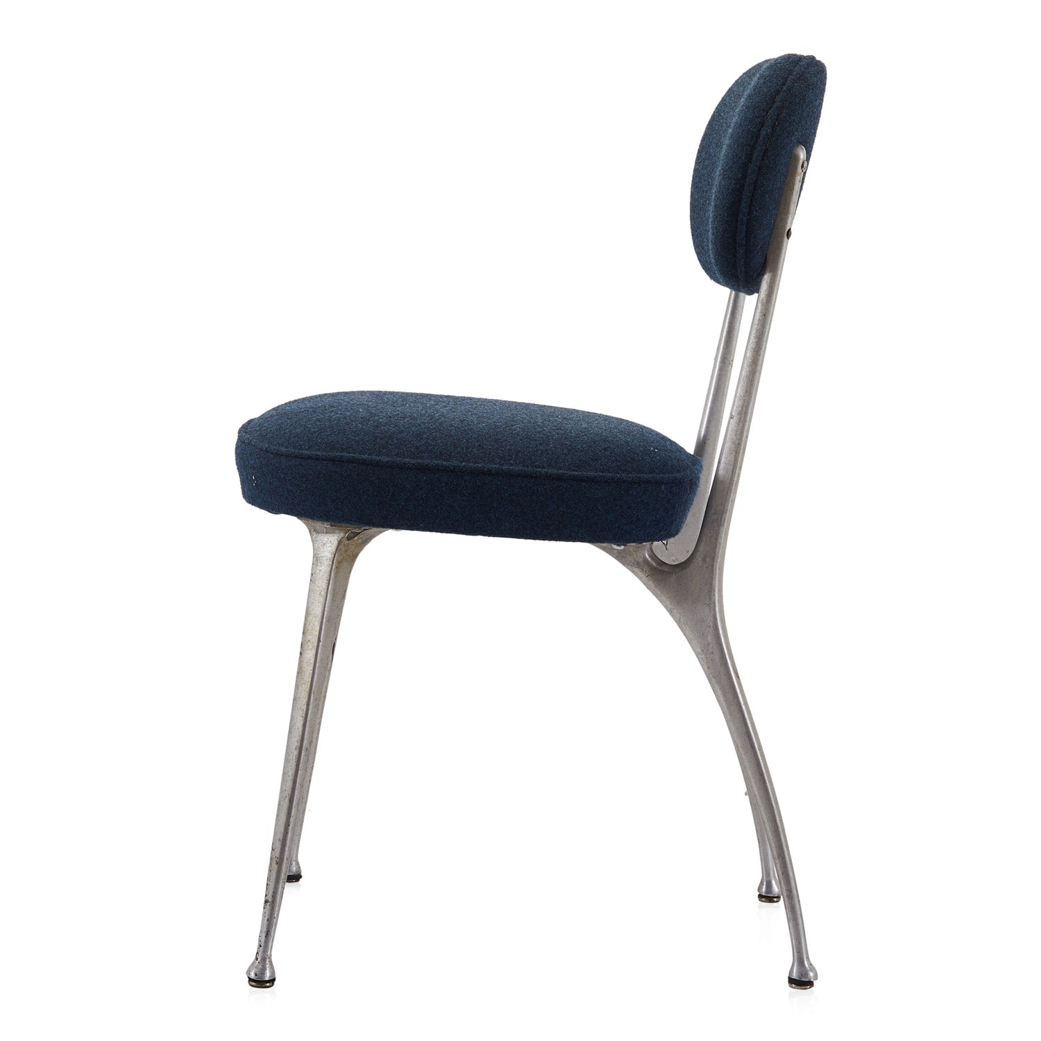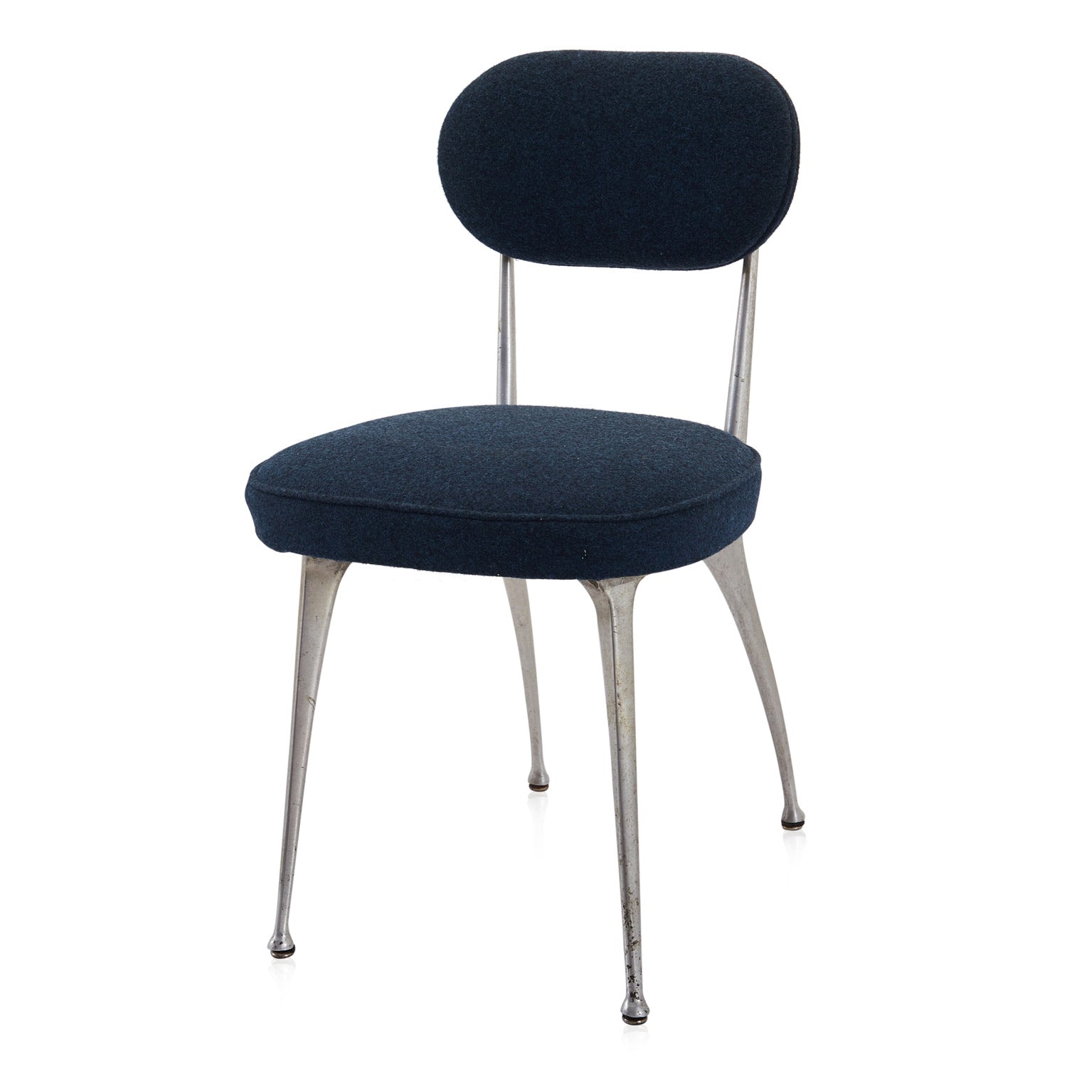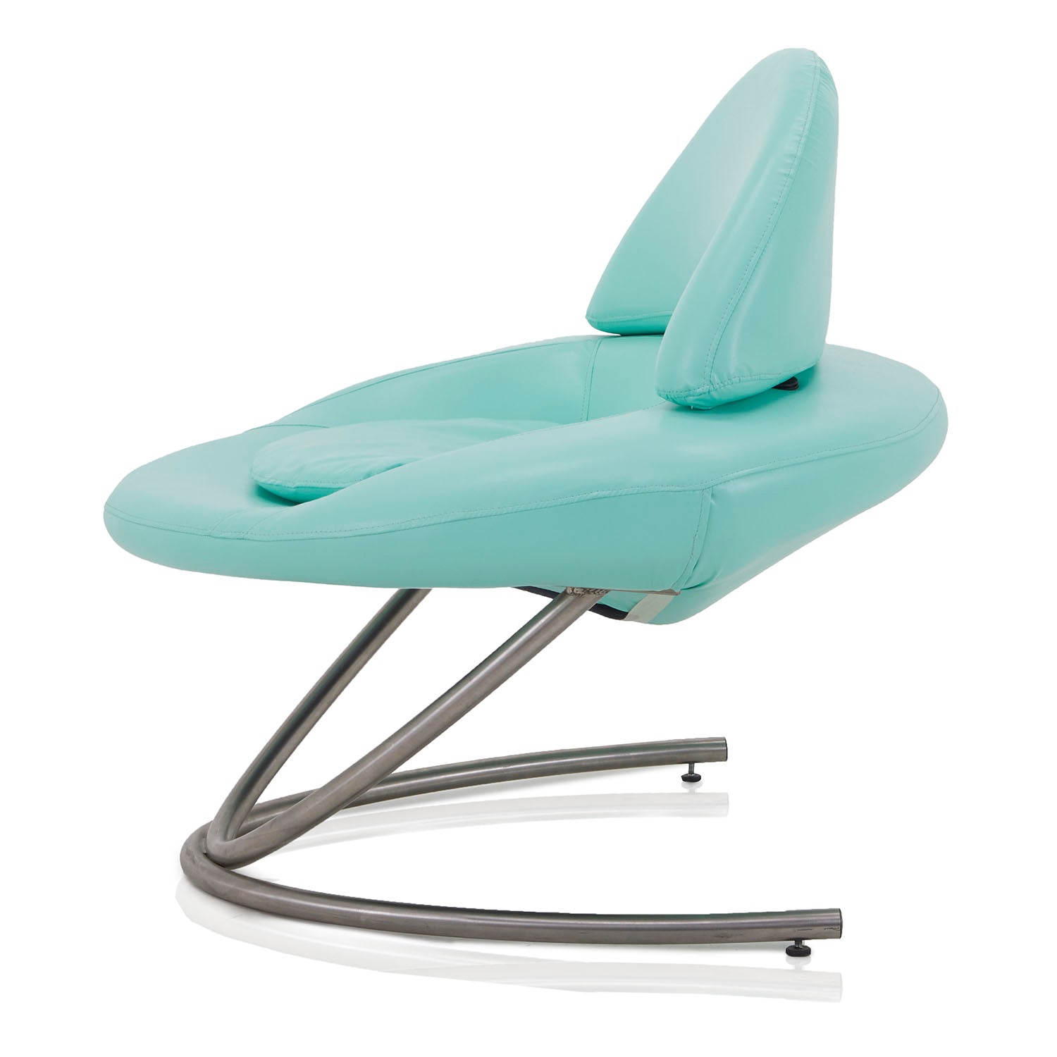 Details: Curved turquoise futuristic lounge chair with rounded grey metal base. Piece is constructed of leather upholstery, with polished metal legs. Dimensions: 36" H x 88"...