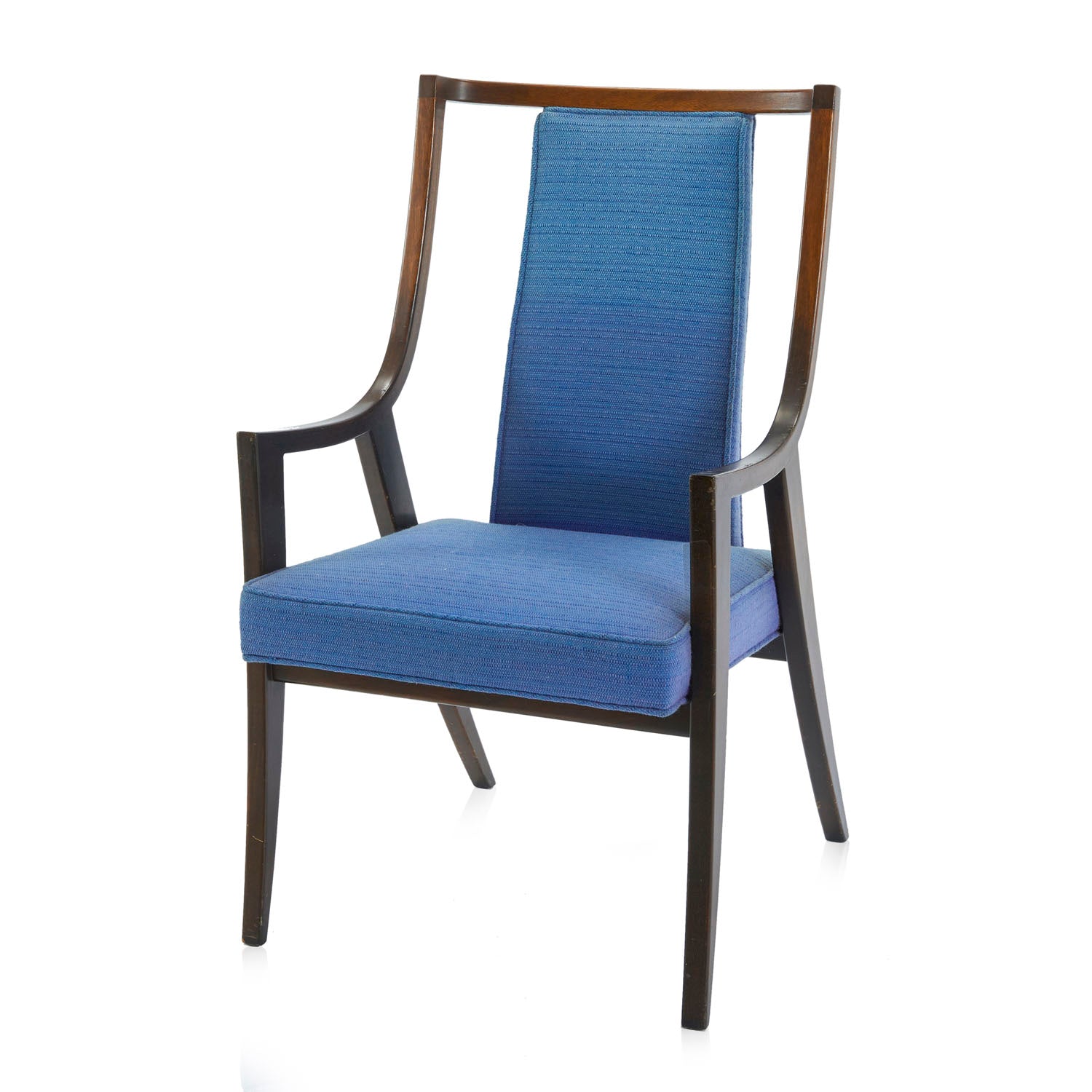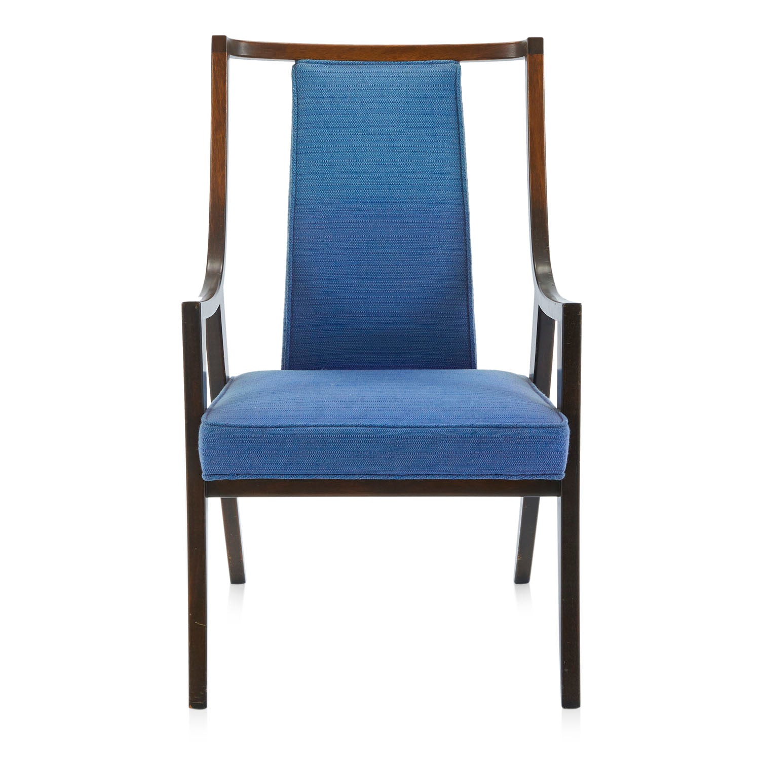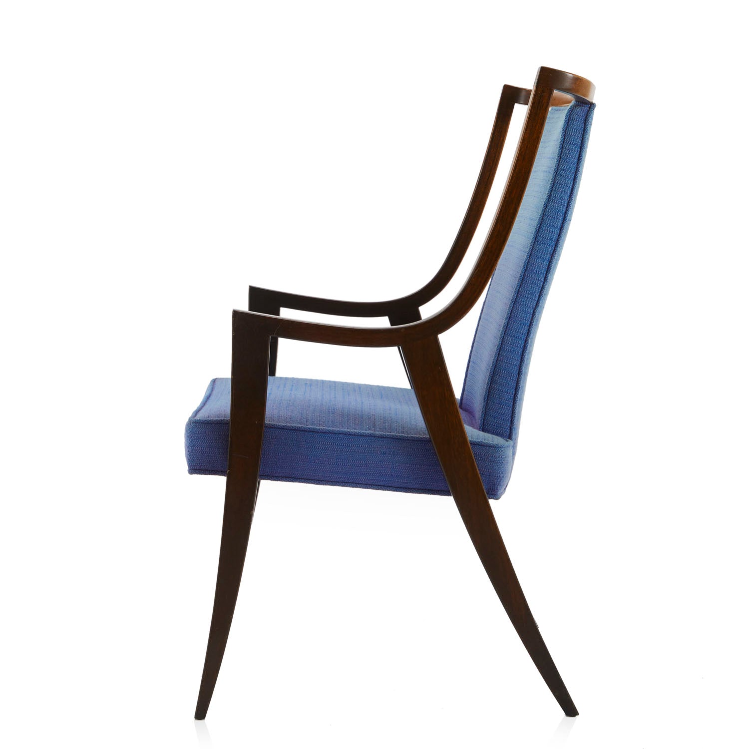 Details: Cutout back armchair with curved mahogany frame and armrests, french blue upholstery