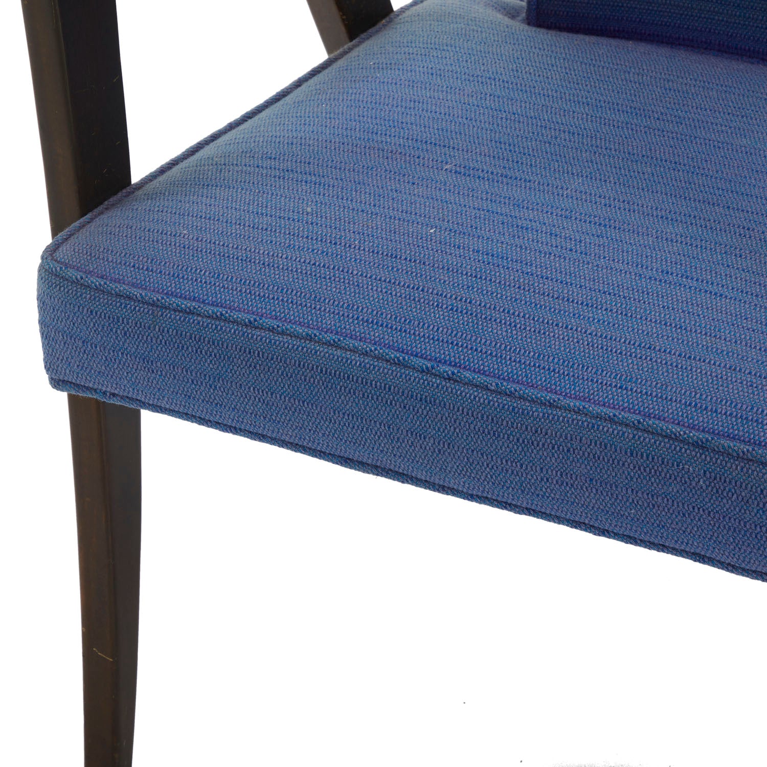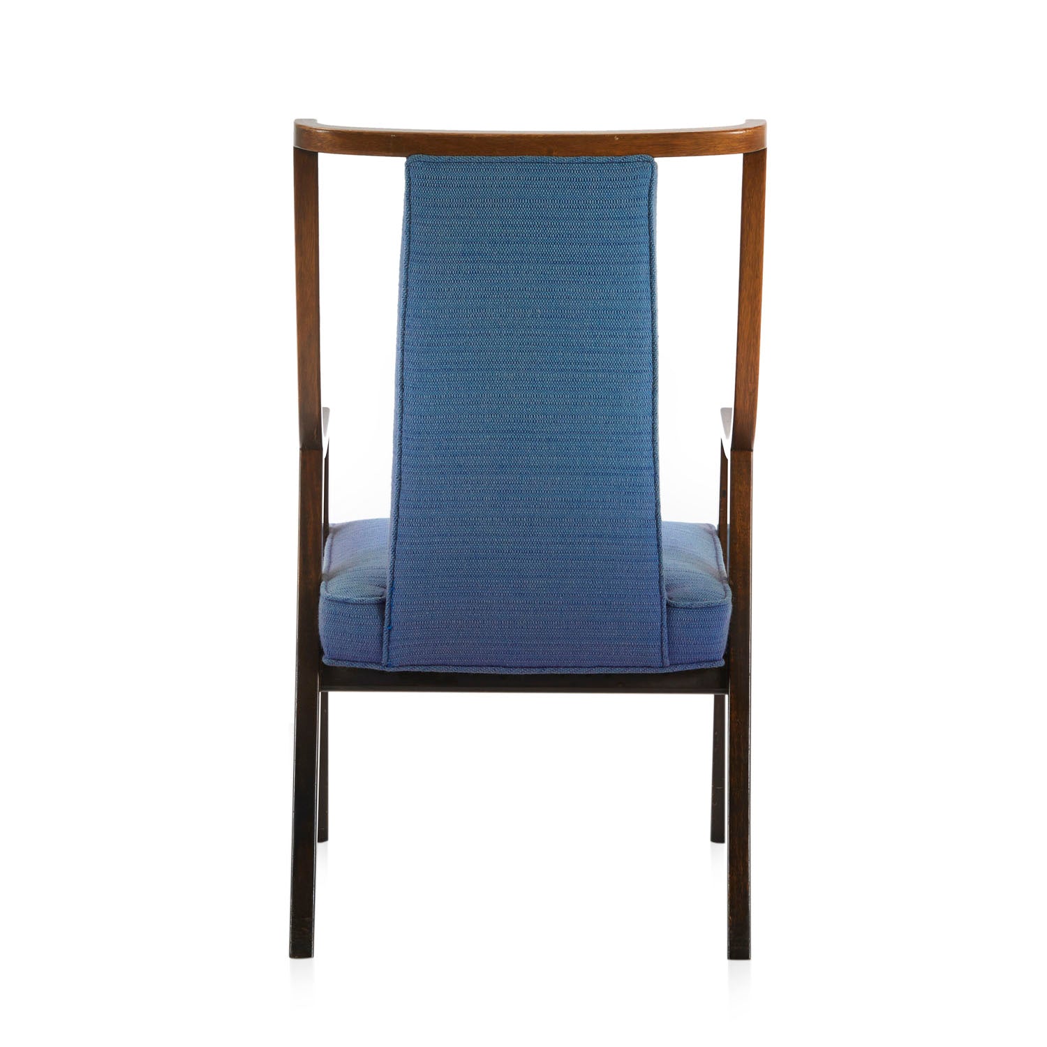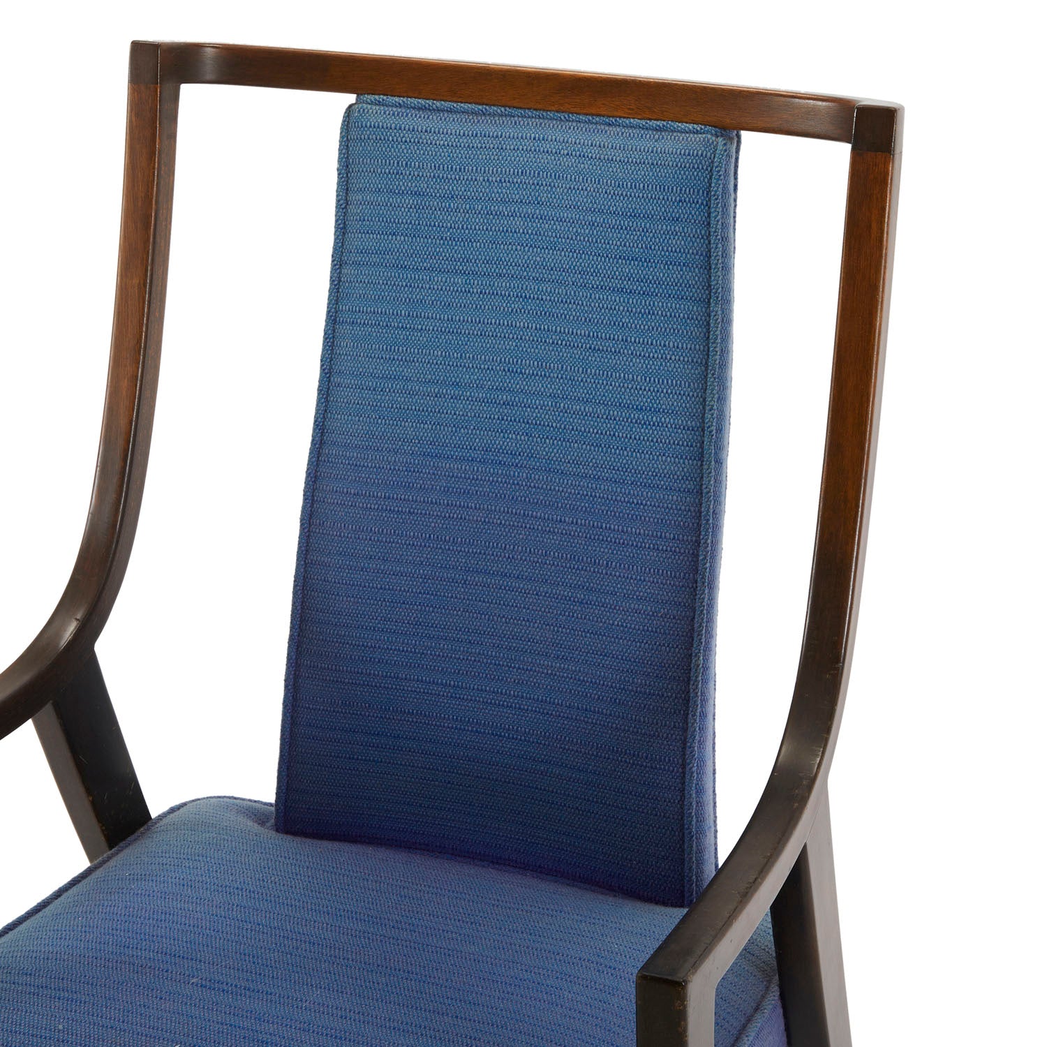 Details: Cutout back armchair with curved mahogany frame and armrests, french blue upholstery