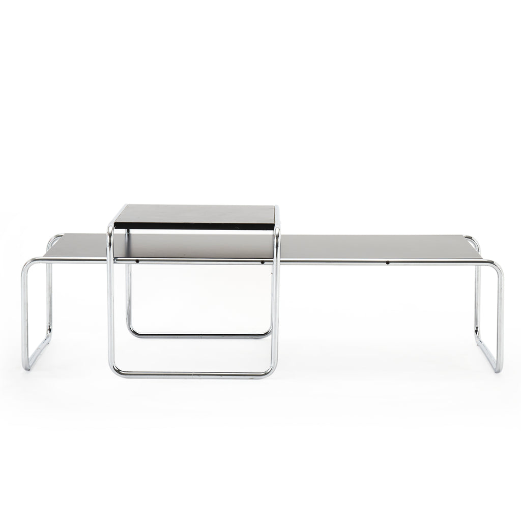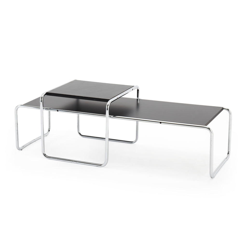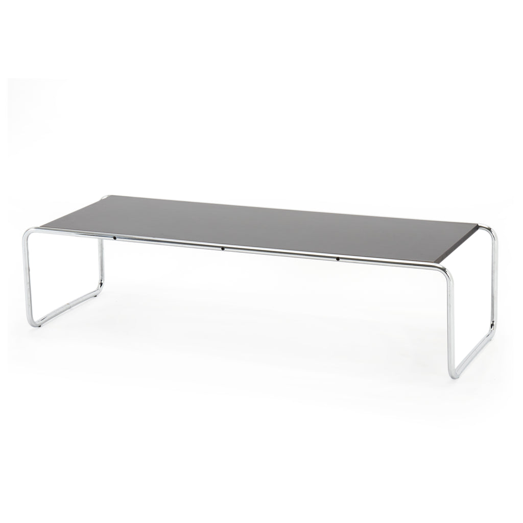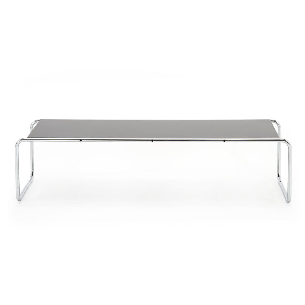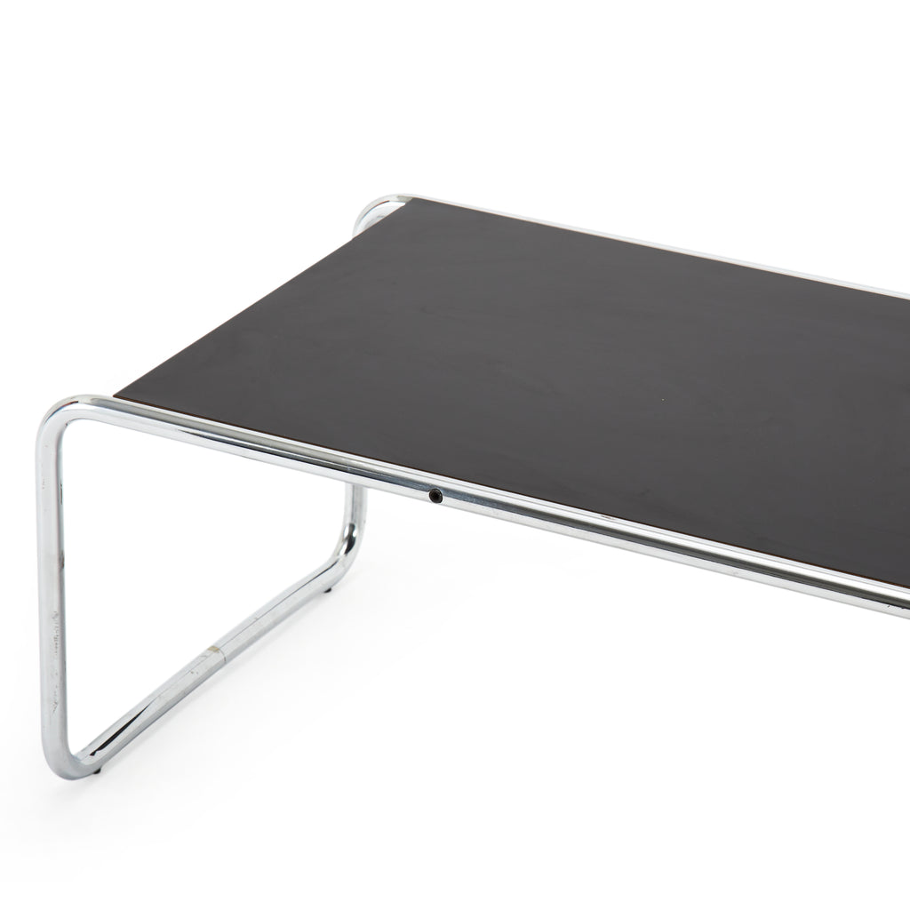 Details: Long rectangular Laccio black coffee table with curved chrome frame