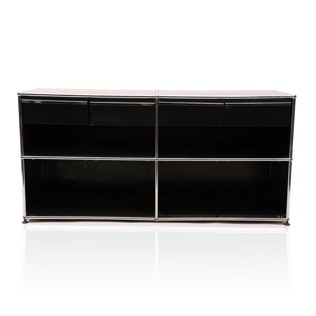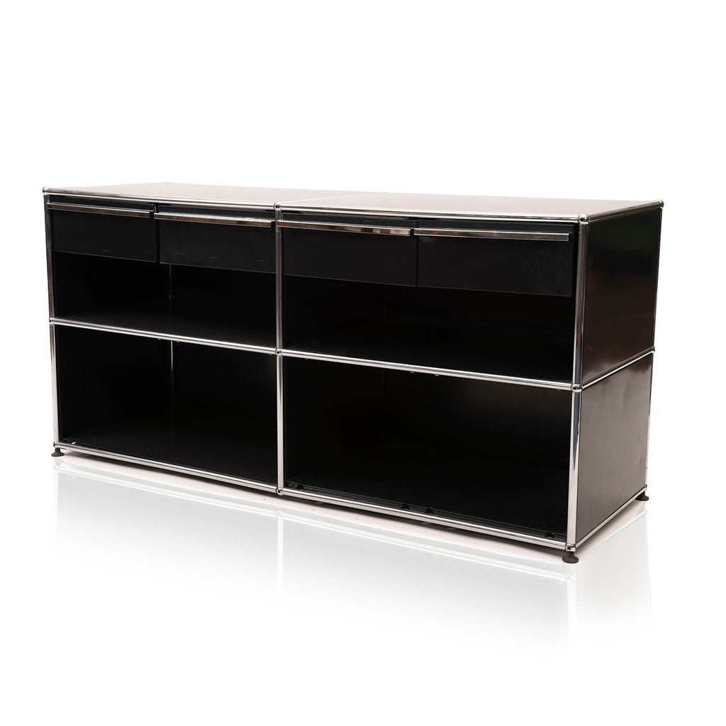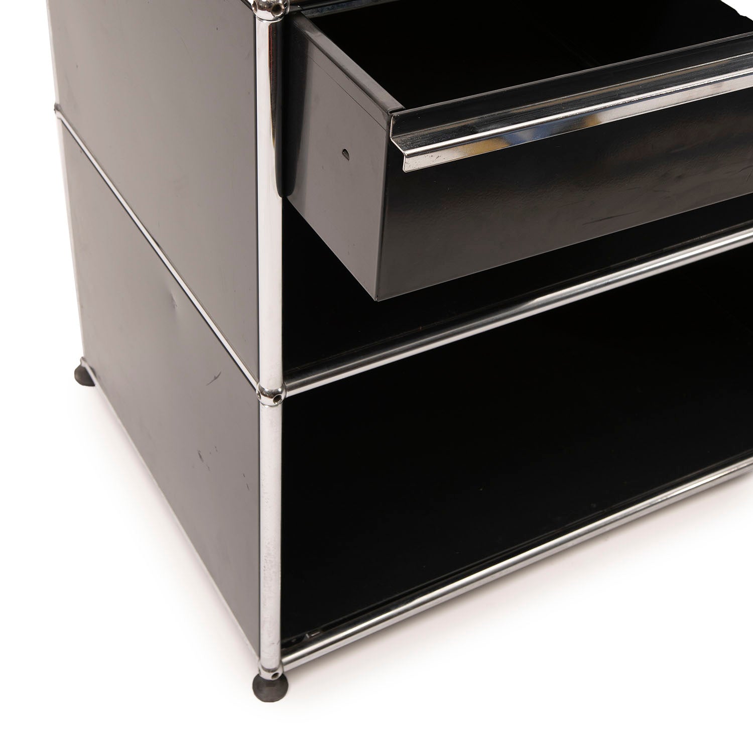 Details: Black metal and chrome poles USM Haller style office shelving unit with four compartments and 4 small drawers