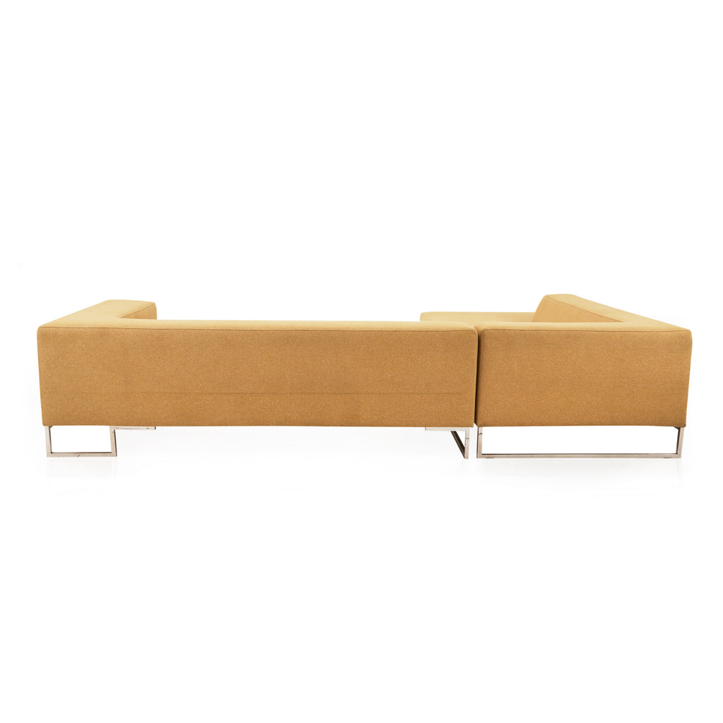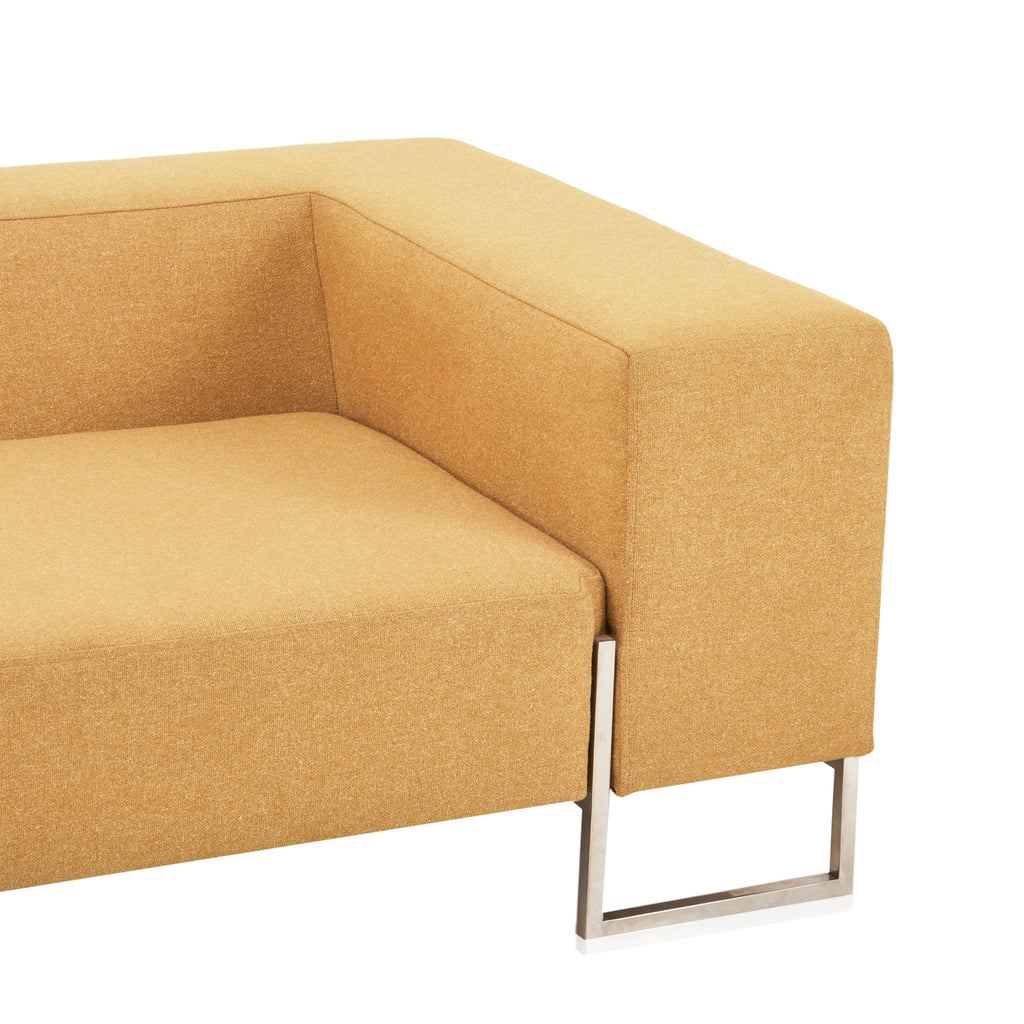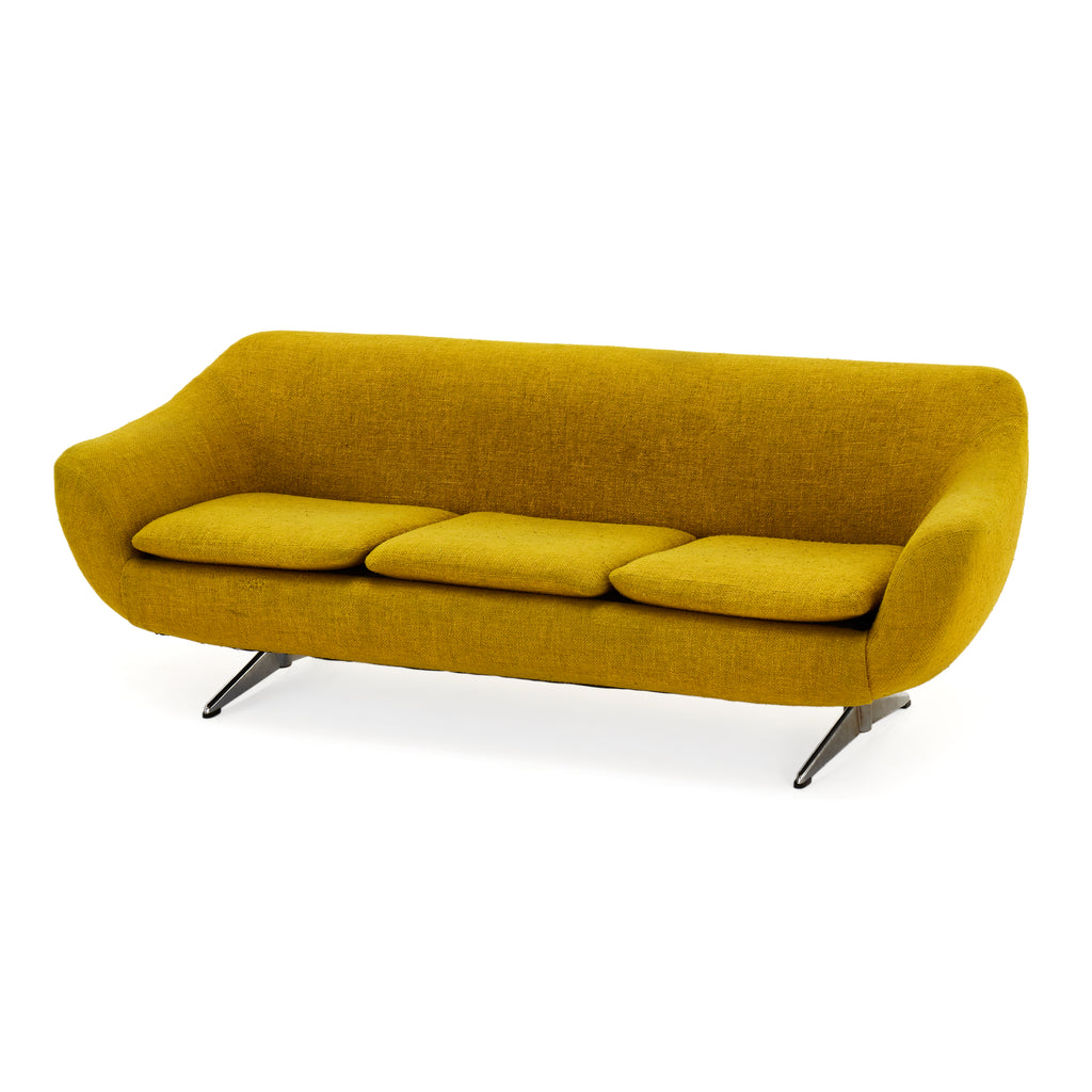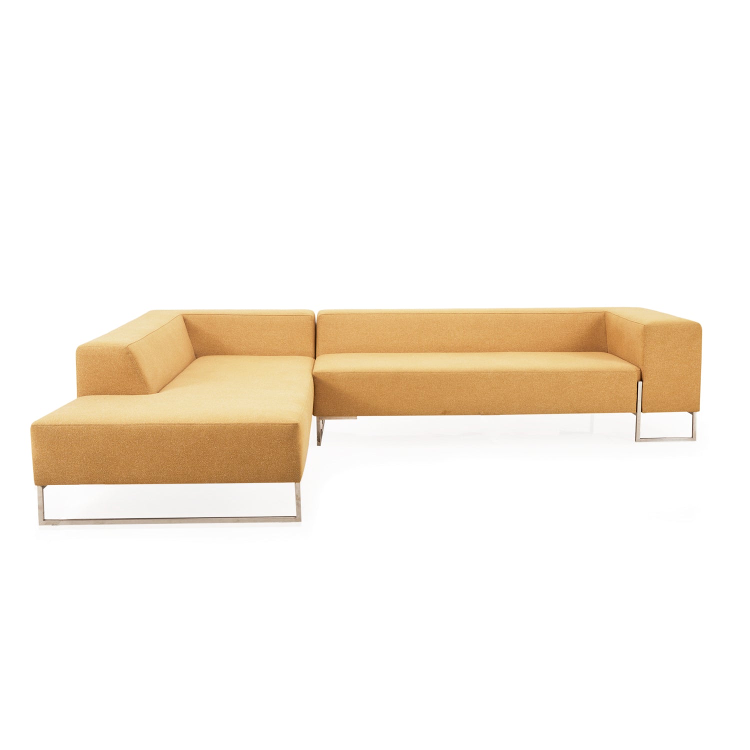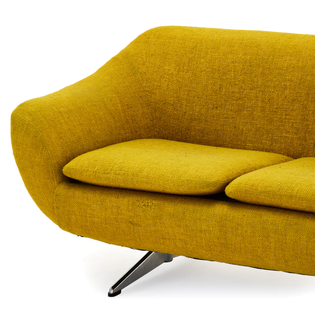 Details: Yellow daybed with a Dali-esque free-flowing organic form, supported by metal rods on a wood cross base